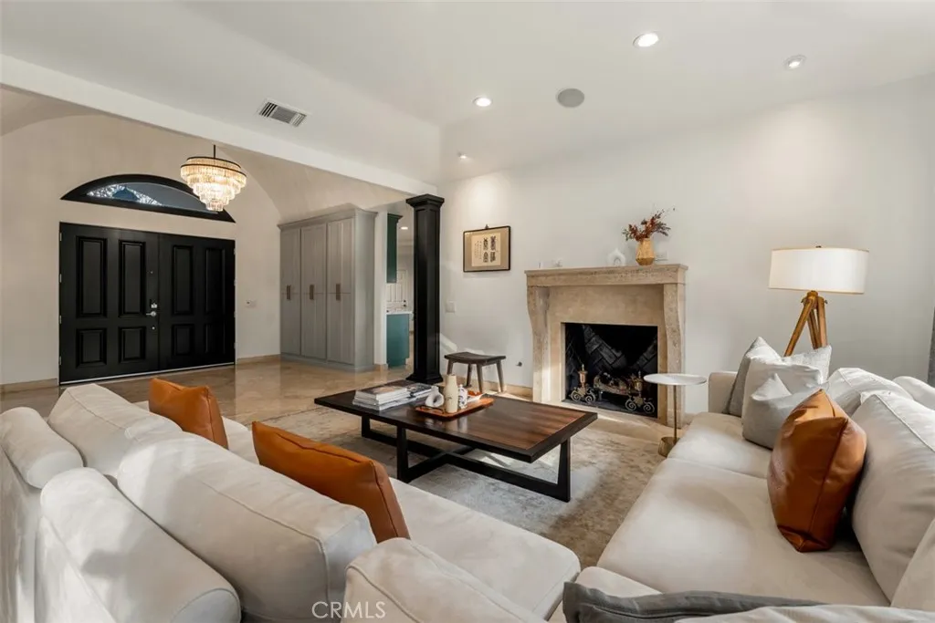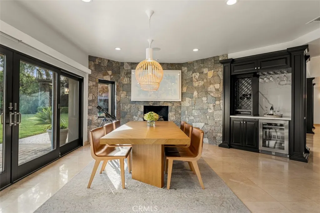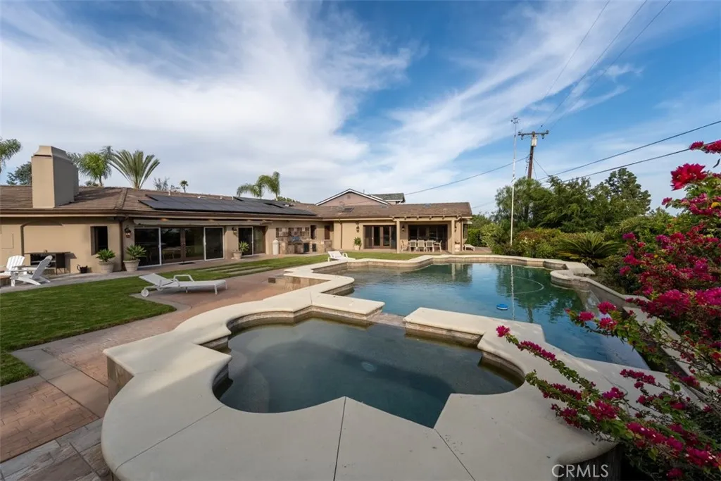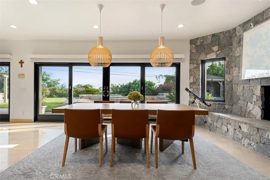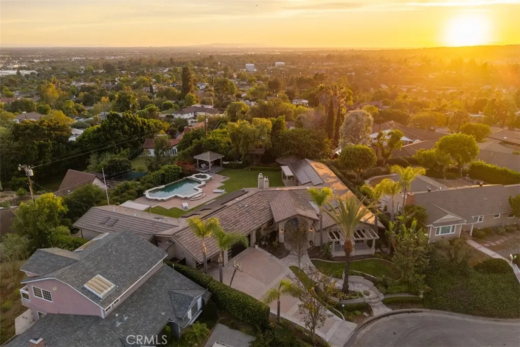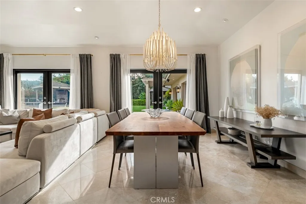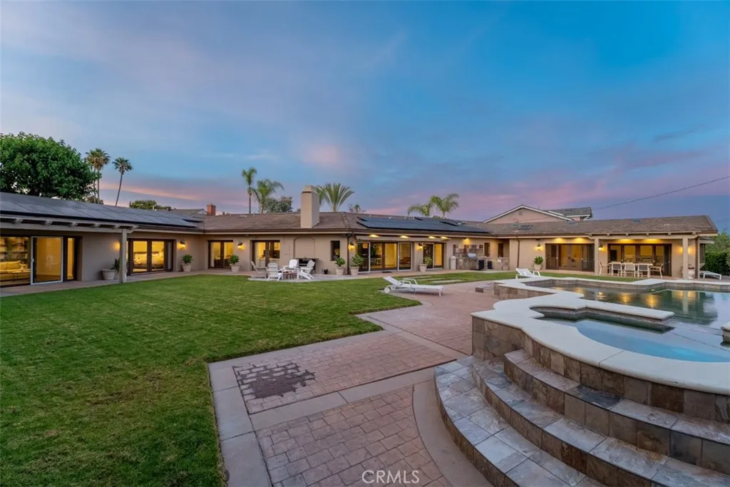Welcome to a rare offering, a single level luxury estate located in Fullerton's most coveted enclave of custom built legacy homes. This residence blends refined architecture, premium finishes, & a layout designed for elegant living & upscale entertaining. Tucked at the corner of a private road cul-de-sac and exclusivity is apparent. The home features Andersen traditional French-style doors & windows, framing the home beautifully, inviting natural light, while maintaining exceptional energy efficiency. Natural travertine flooring extends throughout the main living areas, enhancing the homes organic palette & effortless indoor-outdoor flow. Bold, sophisticated & undeniably striking, the kitchen is a study of contrast & dimension. Dramatic black & white-veined marble paired w/ soft white & gray-veined quartz slab surfaces create a captivating visual interplay, while rich forest green cabinetry introduce depth & elegance. High grade Miele appliances reflect light with mirror like finish, adding a layer of modern refinement & performance-driven luxury, a kitchen that feels both artful and functional. Multiple seating and dining areas offers incredible flexibility for gathering, entertaining or enjoying everyday family moments. A seamless plaster wall finish present a refined, uninterrupted visual flow. The primary suite is truly its own retreat designed for calm comfort. The adjacent study is a standout feature, complete w/ custom shelving. Throughout the home, lighting is not merely functional, they are sculptural, whimsical, curated & thoughtfully placed acting as visual cues