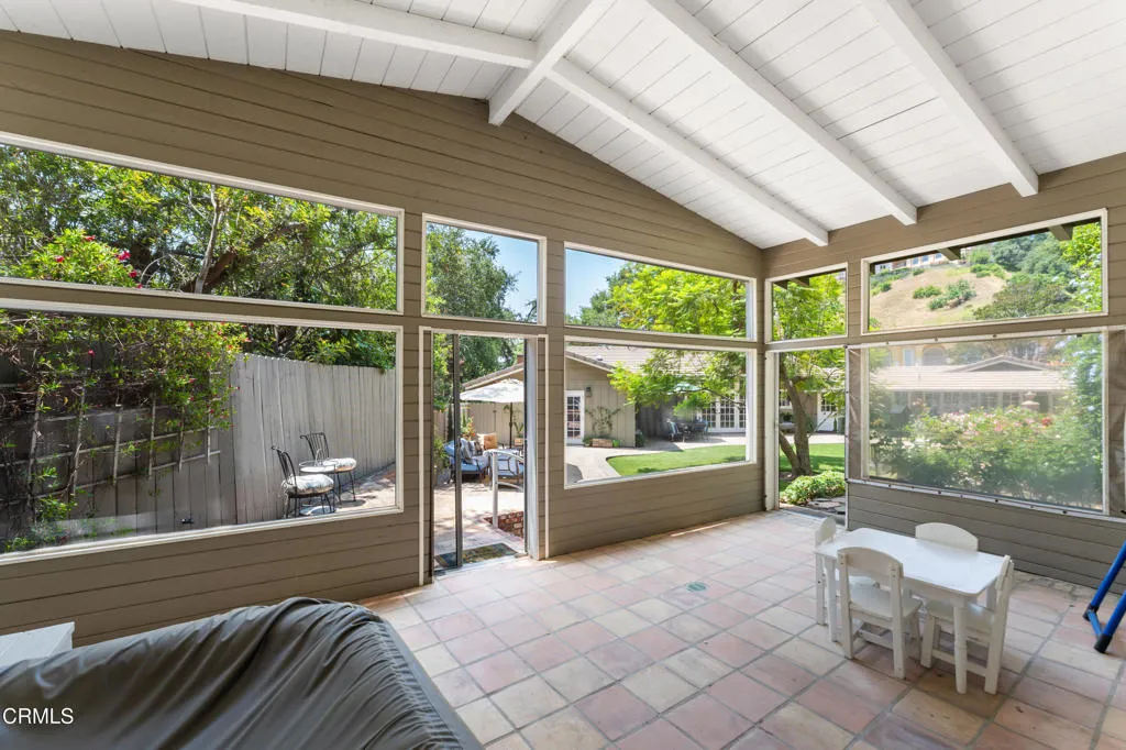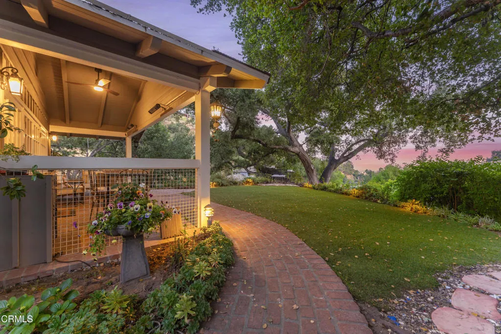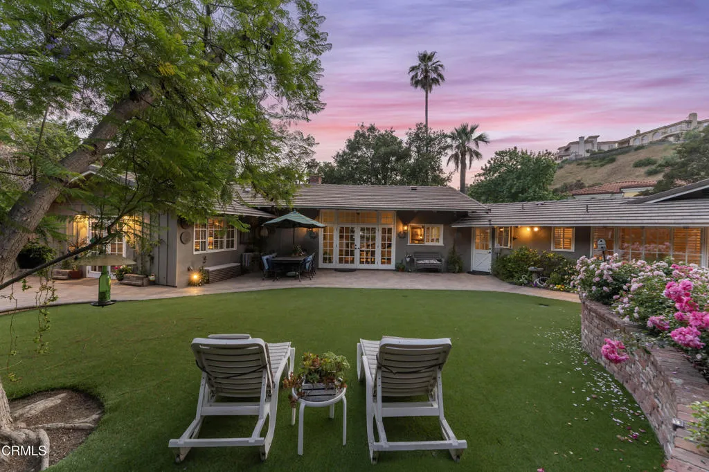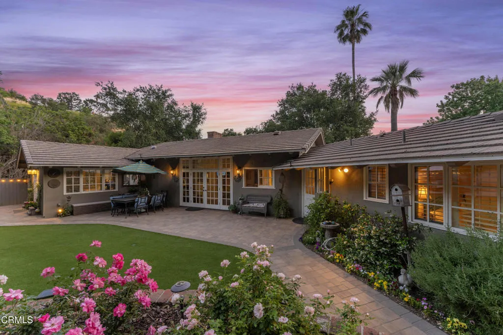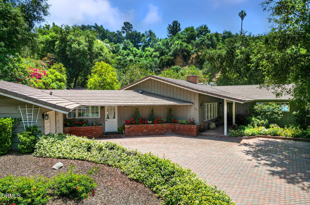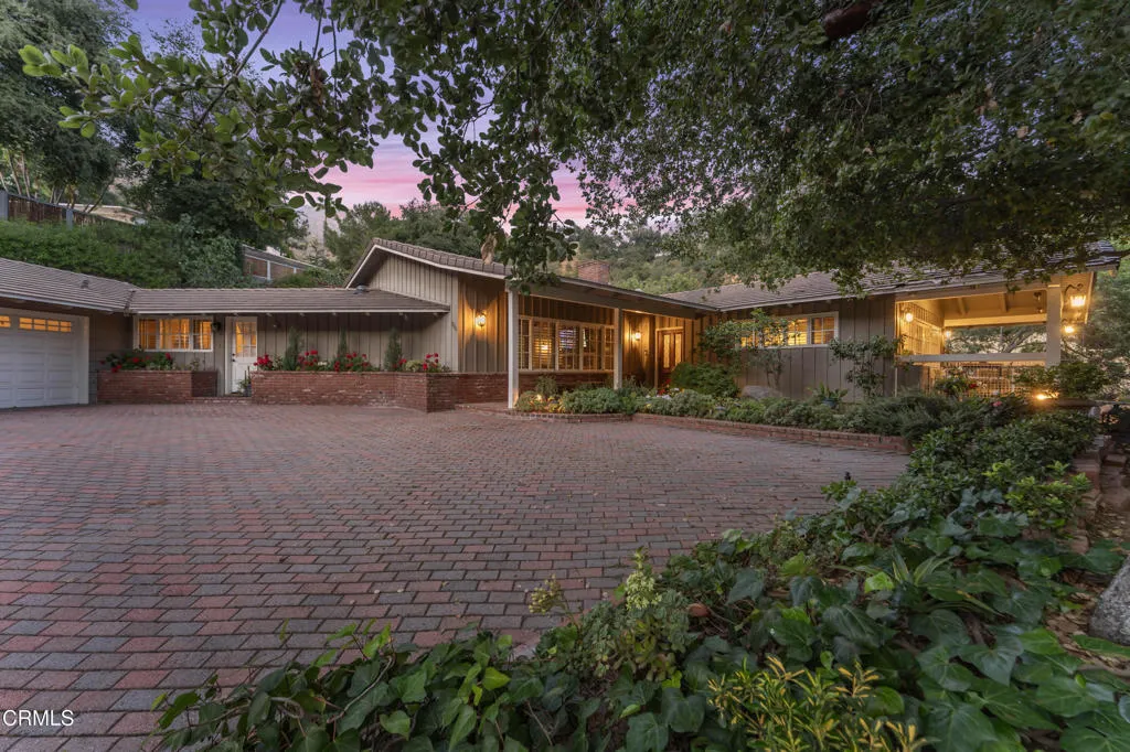 This warm and inviting ranch-style retreat, sited in the Kinneloa Canyon Estates, is situated within a serene gated community. An expansive single-level home, built in 1994, offers a quintessential California lifestyle with breathtaking panoramic views spanning from the San Gabriel Mountains to the Downtown Los Angeles skyline. The inviting living room features beamed ceilings, a charming brick fireplace, and French doors that open to a front patio shaded by a majestic, mature oak tree. The spacious family room flows seamlessly into a chef's kitchen equipped with granite countertops, a breakfast bar, and stainless steel appliances, including a double oven, separate cooktop, dishwasher, refrigerator, and adjacent laundry room. Accented by vaulted ceilings and another brick fireplace, the family room features a built-in bar and a functional office nook with French doors leading to a beautifully landscaped backyard and brick patio. The private primary suite includes an updated 3/4 bath, generous closet space, and French door access to the rear grounds. Two additional bedrooms complete the layout, including a private bedroom with access to a 3/4 bath located at the other side of the house, ideal for guests or multi-generational living. Additional features include dual-pane windows, a concrete tile roof, hardwood floors throughout, central HVAC, ceiling fans, and plantation shutters. The lush backyard offers privacy with mature landscaping, a rose garden, and a versatile 331 SF screened patio perfect for a gym, playroom, or creative studio. A spacious brick paverstone driveway,