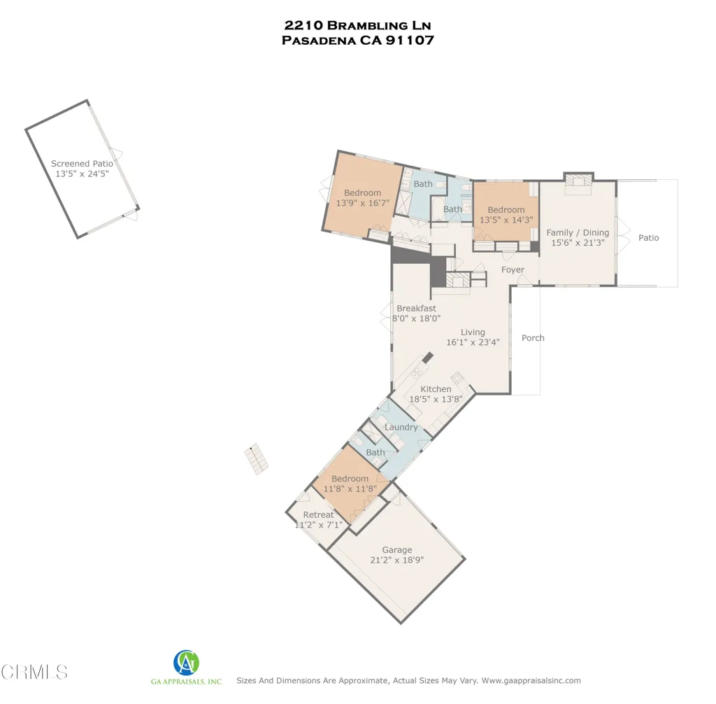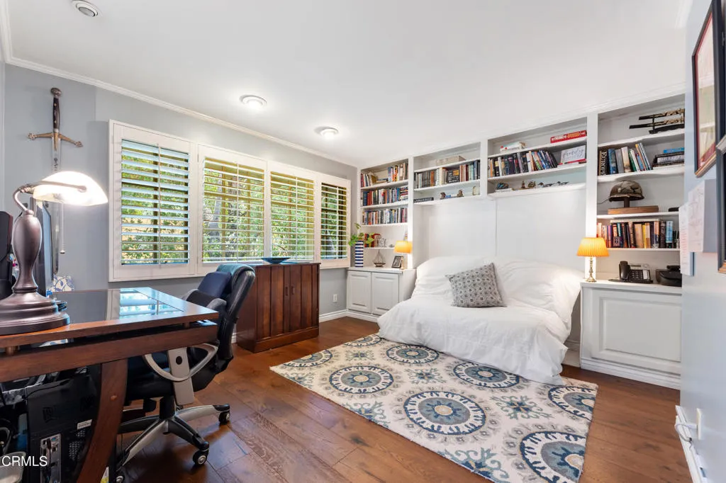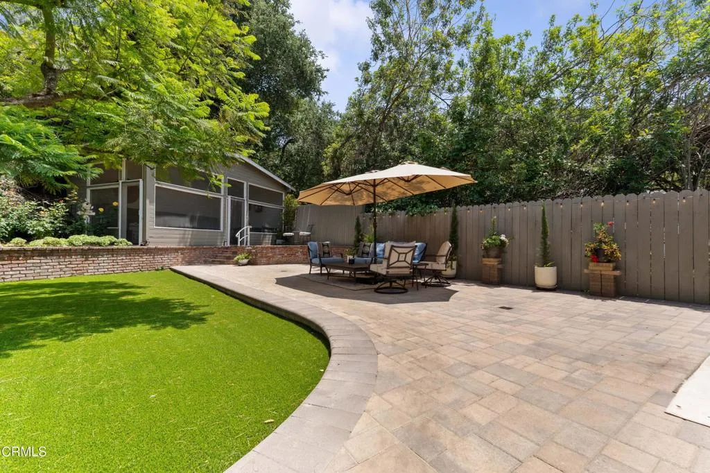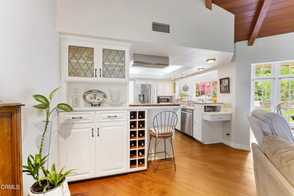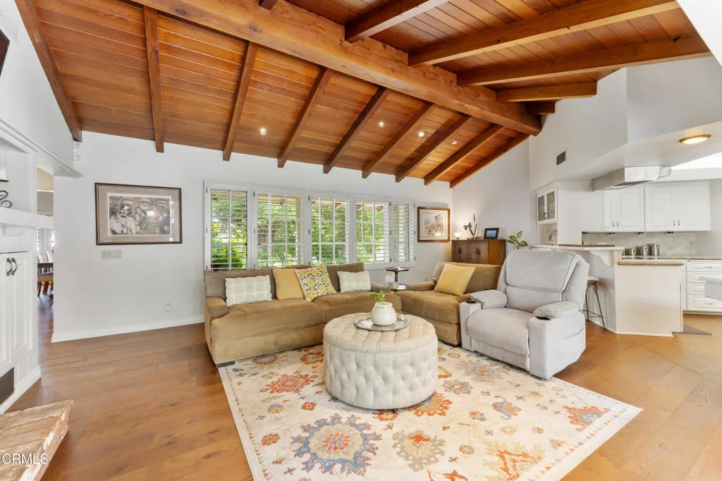 This warm and inviting ranch-style retreat, sited in the Kinneloa Canyon Estates, is situated within a serene gated community. An expansive single-level home, built in 1994, offers a quintessential California lifestyle with breathtaking panoramic views spanning from the San Gabriel Mountains to the Downtown Los Angeles skyline. The inviting living room features beamed ceilings, a charming brick fireplace, and French doors that open to a front patio shaded by a majestic, mature oak tree. The spacious family room flows seamlessly into a chef's kitchen equipped with granite countertops, a breakfast bar, and stainless steel appliances, including a double oven, separate cooktop, dishwasher, refrigerator, and adjacent laundry room. Accented by vaulted ceilings and another brick fireplace, the family room features a built-in bar and a functional office nook with French doors leading to a beautifully landscaped backyard and brick patio. The private primary suite includes an updated 3/4 bath, generous closet space, and French door access to the rear grounds. Two additional bedrooms complete the layout, including a private bedroom with access to a 3/4 bath located at the other side of the house, ideal for guests or multi-generational living. Additional features include dual-pane windows, a concrete tile roof, hardwood floors throughout, central HVAC, ceiling fans, and plantation shutters. The lush backyard offers privacy with mature landscaping, a rose garden, and a versatile 331 SF screened patio perfect for a gym, playroom, or creative studio. A spacious brick paverstone driveway,