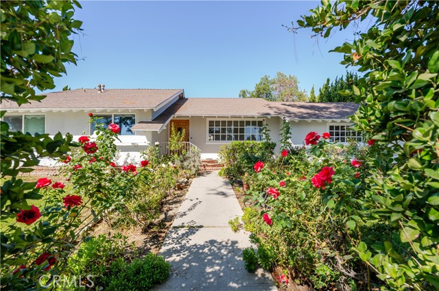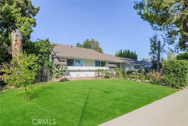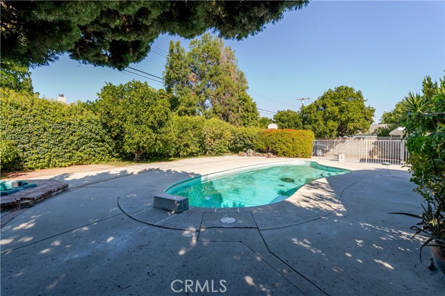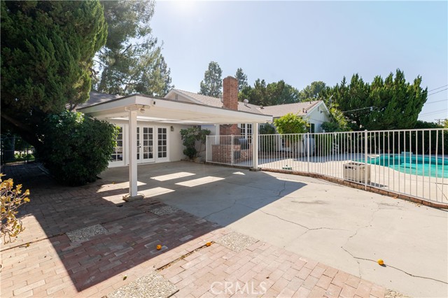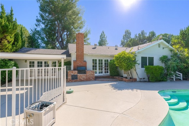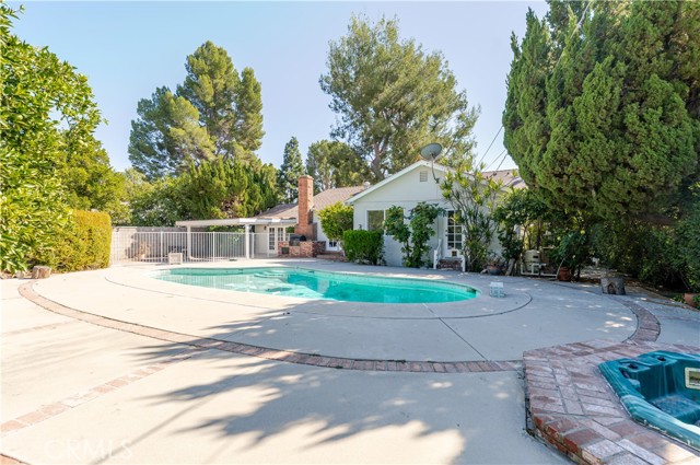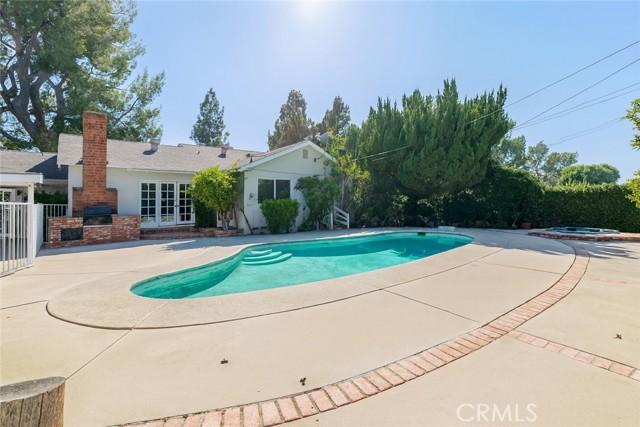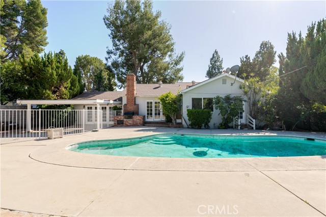 Absolutely gorgeous Porter Ranch pool home with nearly 2,000 sq. ft. of living space on an over 10,000 sq. ft. landscaped lot featuring a pool and RV access. Pride of ownership is evident throughout with hardwood floors, a bright formal dining room with French doors, breakfast bar, and rock fireplace. The spacious family room offers vaulted wood-beamed ceilings, wet bar, French doors, and new laminate flooring. The kitchen includes tiled counters, double oven, cabinetry, and a breakfast nook. The primary suite boasts hardwood floors, ample closets, vanity, and an updated bath, while the secondary bedrooms also feature hardwood floors and ceiling fans. Enjoy the entertainer’s backyard with sparkling pool and spa, large patio, brick BBQ, fruit trees, and covered parking with private entry. Recent upgrades include new roof, windows, recessed lighting, and freshly painted inside and out.