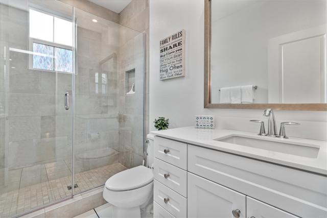Discover your coastal oasis in the prestigious Tides community of Oceanside, where beachside dreams come to life. Nestled west of I-5, this stunning home boasts 4 spacious bedrooms and 4 full bathrooms, perfect for modern living. Wide-plank luxury vinyl flooring flows seamlessly throughout, complemented by soaring ceilings and abundant natural light streaming through premium Milgard windows, creating an open, airy ambiance. The heart of the home is an entertainer’s dream kitchen, featuring a striking stone island ideal for gatherings, sleek stainless steel appliances, trendy white shaker cabinetry, and a chic subway tile backsplash. Retreat to the expansive primary suite on the top floor, complete with a luxurious en-suite bathroom and generous walk-in closet. A second bedroom and full bath are conveniently located nearby, while the third bedroom resides on the middle floor. The versatile fourth bedroom, on the lower level, includes a full bathroom, mini fridge, and microwave—perfect for multi-generational living or rental income potential. Designed with sustainability in mind, this home features energy-efficient LED lighting, water-saving Kohler plumbing, and fully paid solar and an EV charger in the garage, ensuring low utility costs. Just minutes from pristine beaches, vibrant dining, and premier shopping, this is Southern California living at its finest. Welcome home to coastal elegance and endless possibilities!
