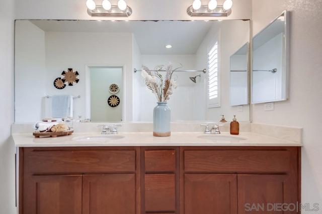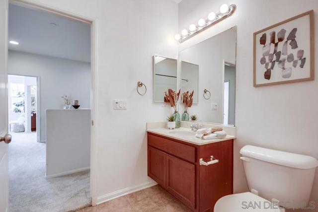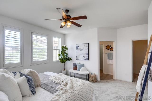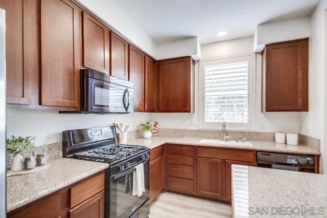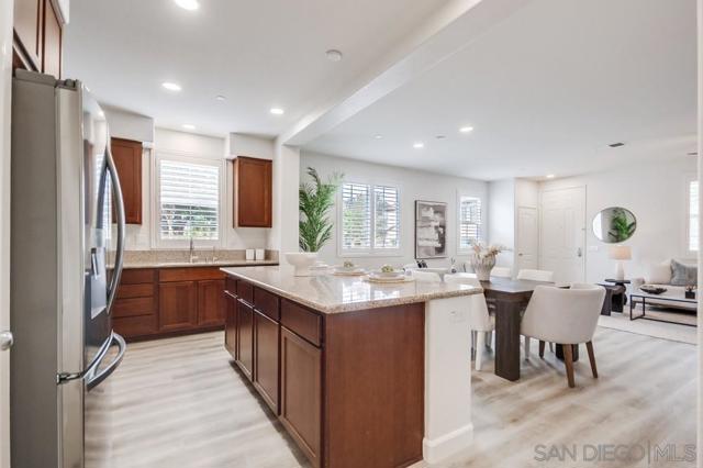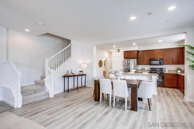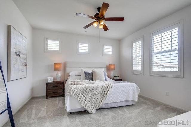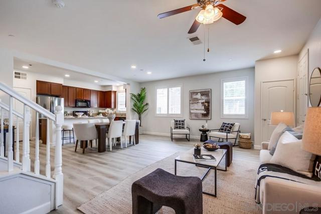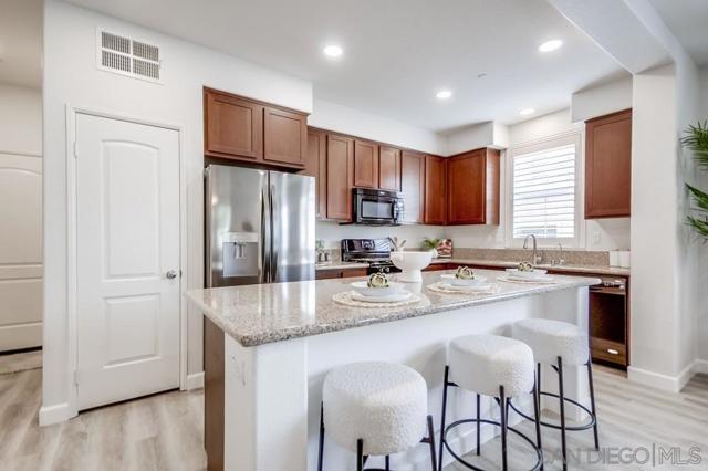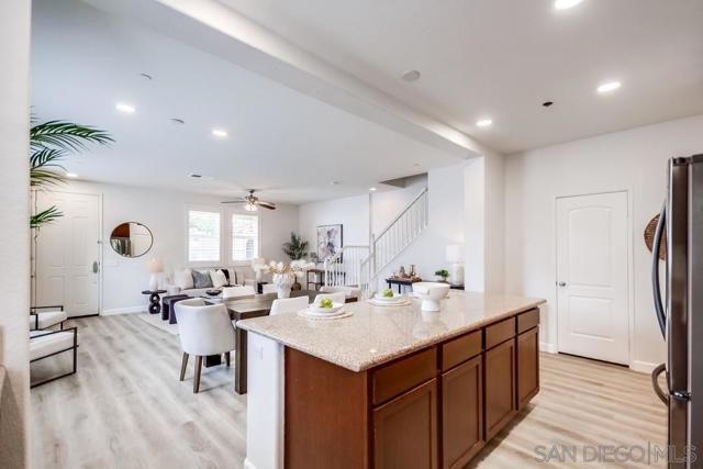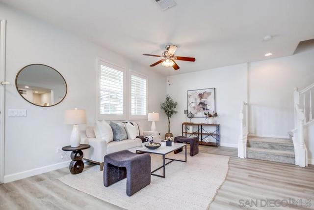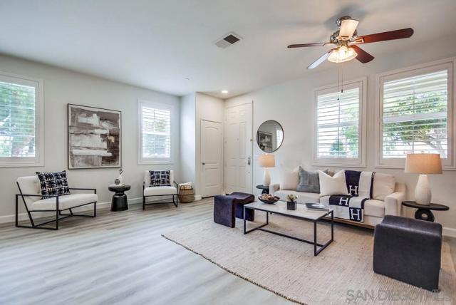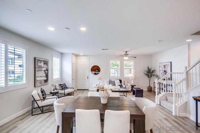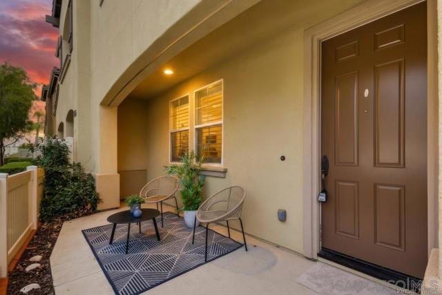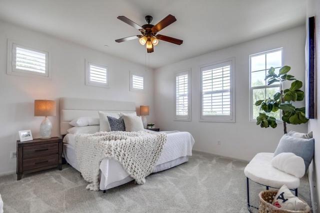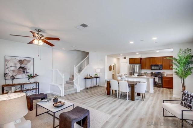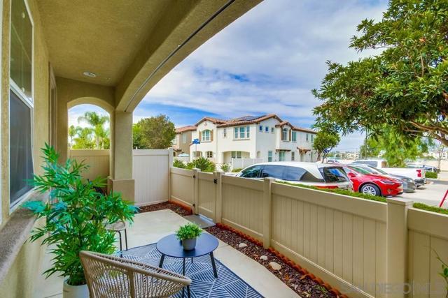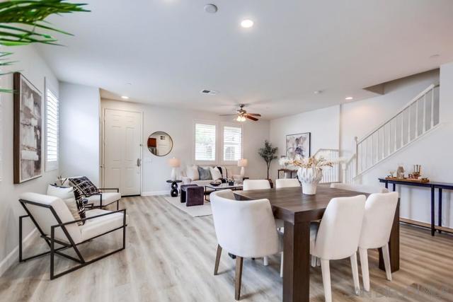 Welcome home to this turn-key end-unit townhouse in the desirable Otay Ranch community! This quiet home is attached on only one side and features a bright, airy interior with brand-new luxury vinyl plank flooring throughout the living areas, new carpet upstairs, and fresh white paint that enhances the feeling of space and light. The open floor plan is perfect for entertaining, while 10-foot ceilings throughout add an extra sense of openness. The kitchen is a chef’s dream, boasting custom hardwood cabinetry, granite countertops, and a huge kitchen island. Enjoy new LED recessed lighting in the living area, a convenient half-bath downstairs, and most windows fitted with high-end wood plantation shutters. Upstairs, you’ll find three spacious bedrooms, including a primary suite that boasts a huge walk-in closet and a separate water closet. Step outside to your private patio, perfect for morning coffee or evening BBQs.