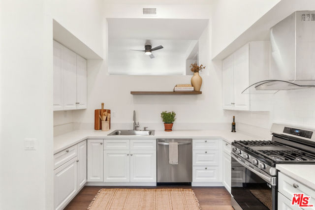 Located in a desirable Panorama City community, this freshly remodeled three-bedroom, three-bath townhouse-style home combines spacious living, modern finishes, and resort-style amenities in one turnkey package. With approximately 1,402 square feet of interior space, the home welcomes you with wide-plank wood-style floors, crisp white walls, and recessed lighting that creates an airy, gallery-like feel. The open-concept living area features a sleek fireplace, large windows with soft natural light, and seamless flow to the dining space, creating an inviting atmosphere for everyday living or entertaining. The updated kitchen boasts white shaker cabinetry, quartz-style countertops, stainless steel appliances including a gas range with statement hood, and a floating wood shelf for warmth and display. Upstairs, three well-proportioned bedrooms offer plush carpeting, generous closet space, and abundant light. The primary suite includes an en-suite bath, ample storage, and enough room for a king bed plus a seating area or desk, while the secondary bedrooms are perfect for guests, family, or a home office. Each bathroom has been thoughtfully upgraded with modern vanities, sleek fixtures, and neutral palettes that evoke a spa-like feel. Practical features include a powder bath on the main level, multiple storage closets, and convenient in-unit laundry connections. A rare direct-access private two-car garage adds security and ease, making this residence feel like a true single-family home. The well-maintained complex offers a sparkling pool and spa with sunny lounge areas, mature landscaping, and well-run HOA services that provide an attractive, low-maintenance environment year-round. Residents appreciate the community's proximity to the revitalizing Van Nuys Corridor, local parks, and a variety of shopping and dining options, as well as easy access to major freeways for streamlined commutes. Nearby Sherman Oaks, North Hollywood, and the Valley's emerging hot spots provide endless choices for nightlife, fitness, and entertainment, while the neighborhood retains a peaceful residential feel with tree-lined streets and a welcoming atmosphere. Combining style, comfort, and convenience, 14500 Van Nuys Blvd #33 is a move-in-ready home offering the best of townhome living in a prime Panorama City location with every amenity close at hand. Photos have been virtually staged.