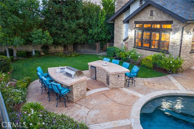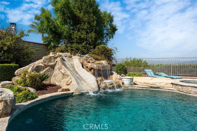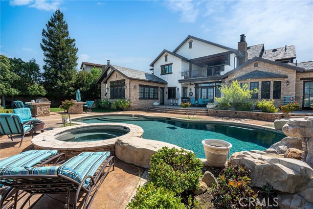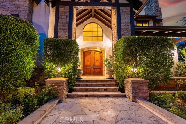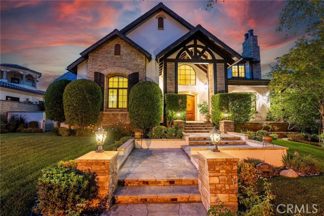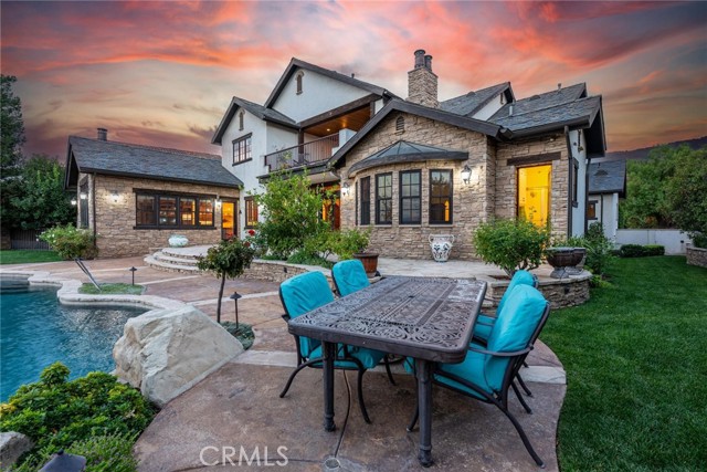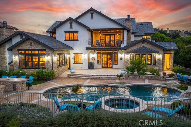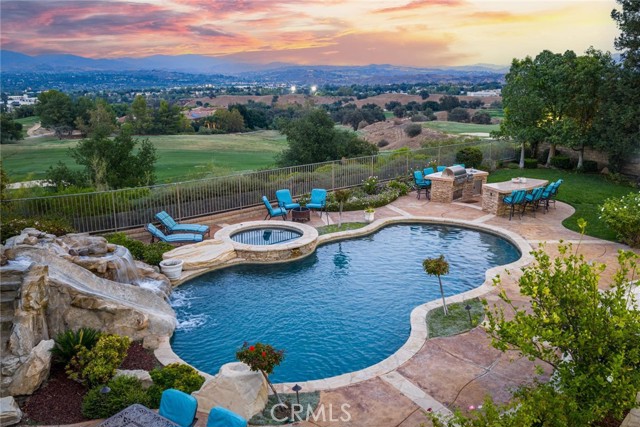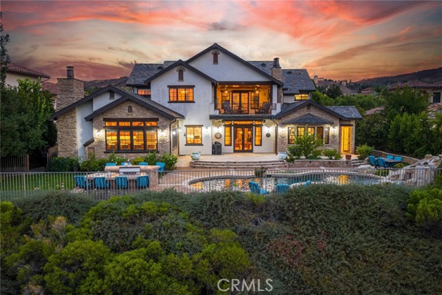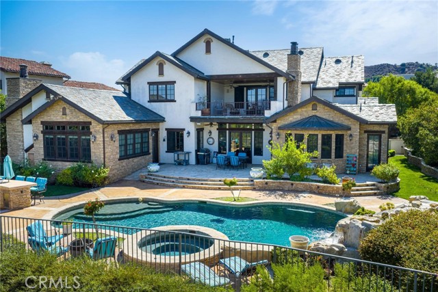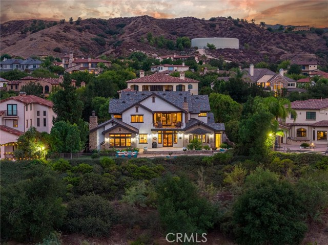 Among the rare custom Westridge Estates perched along the 18th green of The Oaks golf club, a PGA Tour designed golf course, with spectacular views of the entire Santa Clarita Valley! One of the larger lots overlooking the course with an entertainers yard featuring a beautiful pool, spa and plenty of room for play or just watching the amazing view, all with the security of a 24-hour guard gated community. Designed with both function and sophistication in mind, the open floor plan features a grand entrance with breathtakingly high ceilings and a handmade calligraphy staircase. Spacious primary suite on the main level with vaulted ceilings and a retreat with a fireplace. An additional en-suite bedroom down, ideal for guests or multi-generational living. The spacious kitchen has an unusually large island, custom soft close cabinetry, high-end appliances, and a large walk-in pantry with venting and electrical for dining prep. The kitchen opens to the living room providing the perfect space for those looking to host friends, family, & loved ones. Located upstairs are three oversized en-suite bedrooms, each with their own walk-in closets. Enjoy the remarkable view with your morning coffee or evening wine on the covered deck of the third floor. A finished basement serves as the ultimate game or movie room, and an elevator that seamlessly connects all three levels. The interior was thoughtfully selected with high-end finishes throughout including fresh paint, a spacious laundry room, and a dedicated multi-purpose room. Custom ¾ inch thick hickory flooring in the kitchen, dining room, and upstairs hallways too. The massive subterranean 10-car garage that's approximately 3,300 sq. ft. — a collector’s dream! A true backyard oasis — complete with a sparkling pebble tech pool & spa, waterfall, waterslide, built-in BBQ with seating, expansive grassy areas, and generous side yards for recreation. Very few custom estates can combine resort-style living with peace of mind like Oak Meadow does. Truly a one-of-a-kind offering that redefines luxury in Valencia.