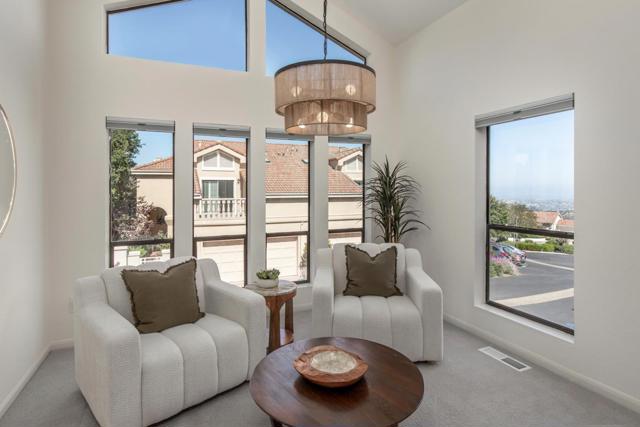 Perched at the top of Crestview, 4 Mayflower Lane feels like living above it all where radiant sunrises, drifting clouds, and sweeping bay and canyon views create a breathtaking backdrop. This 3 bed, 2.5 bath town-home blends sophistication with serenity, offering light-filled spaces with soaring ceilings, skylights, new hardwood floors, designer lighting, central A/C, and in-home laundry. A gas fireplace, custom wood accents, and a stylish bar area create a warm setting for entertaining, while the refreshed kitchen and dining area invite casual meals or lively gatherings. Step outside to two balconies or a private courtyard entry perfect for morning coffee, sunset wine, or quiet retreat. Upstairs, the primary suite offers a true sanctuary with sitting area, fireplace, dual closets, and a spa-like bath with soaking tub and natural stone finishes. Two spacious bedrooms on the lower level provide comfort and flexibility. Community amenities include tennis courts and a pool. Minutes to scenic hiking trails, vibrant downtown San Carlos, and top-rated Carlmont High - one of San Mateo County's best schools - this rare offering captures the essence of elevated Peninsula living.