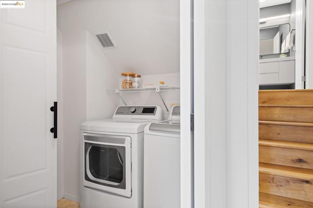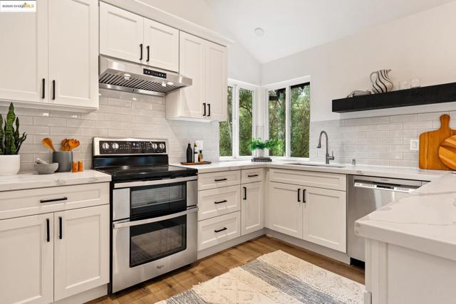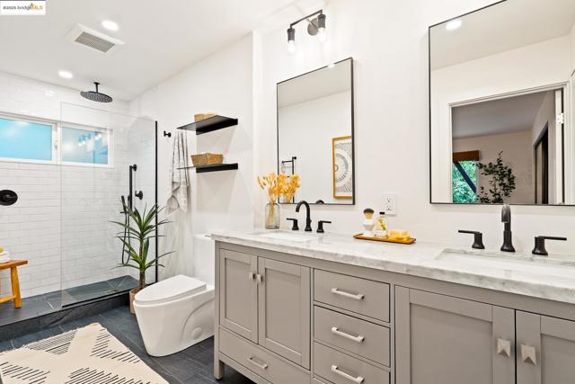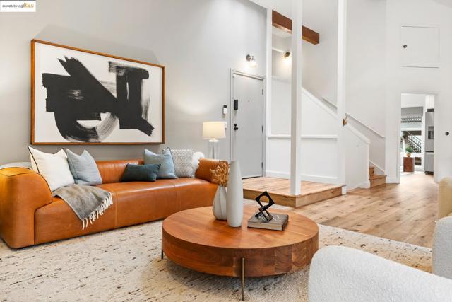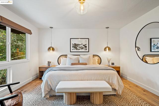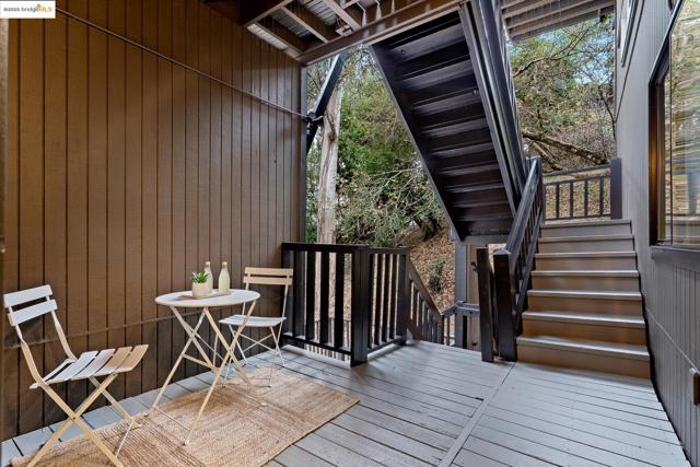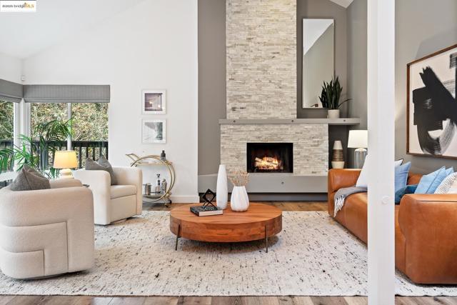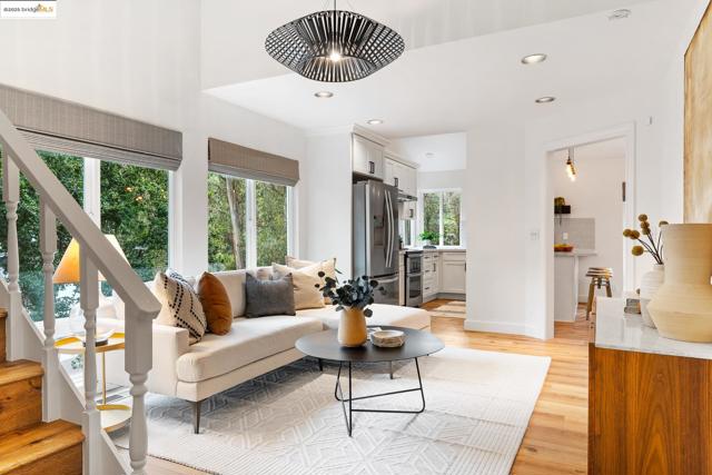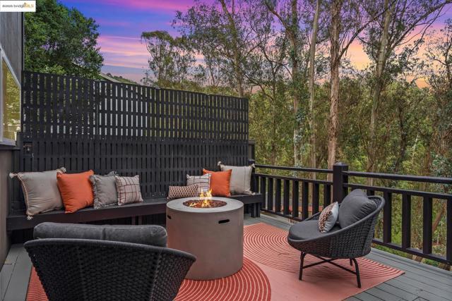 Enjoy light-filled, open-concept living in this beautifully updated Montclair retreat. The great room dazzles with a natural stone-clad fireplace, vaulted ceilings, and a wall of windows framing lush forest views. The adjacent dining area is centered by a modern Sputnik chandelier, while the stylish kitchen features quartz countertops, subway tile backsplash, and stainless appliances. A cozy study just off the main room offers the perfect space to work or unwind. Also on this level: a design-forward half bath, an additional den, and a full bedroom with exterior access. Downstairs, the dramatic primary suite offers tree-lined tranquility with custom lighting, a spa-worthy bath with dual-sink vanity, matte black fixtures, and walk-in shower. Two additional bedrooms with peaceful outlooks, a floating vanity hall bath, and laundry station complete the level. Multiple decks create seamless indoor-outdoor living, while the lower-level spa retreat—with sauna, gym, and renovated half bath—adds an element of luxury. The attached garage provides direct home access and ample storage. Ideally located near Montclair Village shops, cafés, and the Montclair Railroad Trail, with easy access to Highway 13 for commuting to SF, San Leandro, or Walnut Creek.