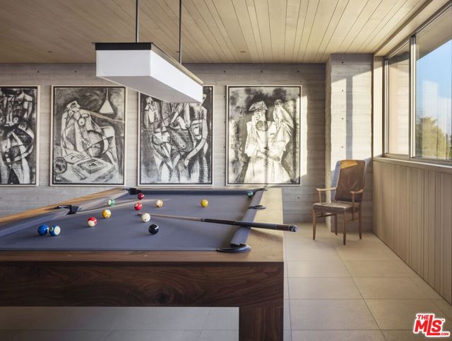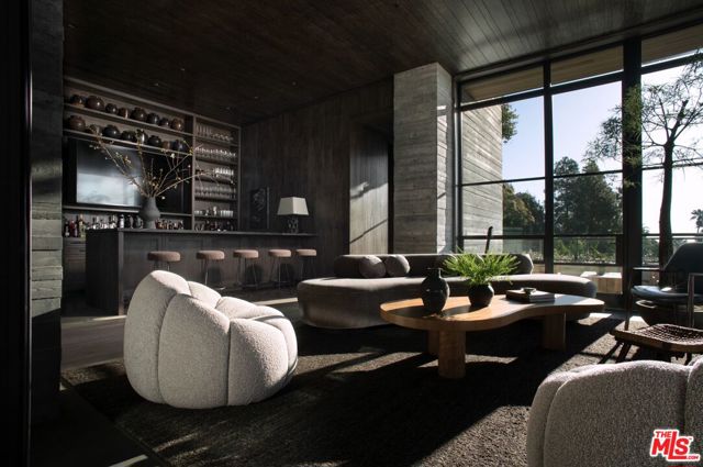 The Hollywood Hills House designed by Scott Mitchell Studio is a monumental and versatile modern villa rising out of the Hollywood Hills. The layered and terraced house - designed for living and entertaining - embraces views that span L.A.'s cityscape from east to west and out to the Pacific Ocean. This property is set on Los Angeles's most iconic promontory that extends over one acre with no neighbors on either side and 270 views of the entire city. Set at the 50-yard line of legendary hot spots Chateau Marmont, Tower Bar, and the Hollywood Bowl, the energy of the city can be seen and felt from the estate's peaceful privacy. Additionally, the property borders state land so no building can be constructed behind it, and it has private access to hiking in the famous Runyon Canyon. The form of the house follows a rigorous commitment to rich, organic materials and light. Grand outdoor decks provide seamless indoor and outdoor living. With expansive volumes over three floors, the tranquil and rooted hillside haven exudes a sense of balance, repose and a seamless connection to the natural landscape. A secluded driveway inclines to an impressive, cobbled motor court that can accommodate 12 or more cars and is nestled under the house with far-reaching views across the city. From there the villa's grand and wide staircase begins, following the form of the building, passing a large-scale, vertical water feature to the landscaped north terrace and walkway, where native plantings and open fires frame the principal steel window and door entry system. On entering, to the east is a luxurious study and to the west, an open living room with fireplace and views across the city that flows into the dining room and on to the kitchen and family room, where floor to ceiling glass sliding doors open seamlessly connecting indoor and outdoor and framing wide urban vistas. On the exterior, wire-brushed narrow Itauba deck boards and an elegant dark stone clad infinity pool and hot tub are flanked by a sunken fire pit and seating area. A stand-alone pool bar and lounge is connected by a covered breezeway adjacent to an outdoor seating area. Walkways and terraces continue around the house incorporating native oaks and under-storied plantings that are composed with elements of fire and water. On the upper level, the primary bedroom wing comprises not only the primary bedroom but separate bathrooms and dressing rooms, and a study that can be isolated from the rest of the suite by a discreet pocket door system. On the lower level is a recreational zone with state-of-the-art screening room, billiards room with lounge area, and a bar. These program elements are organized around a gracious distribution foyer which doubles as a secondary point of entry to the house and leads to the motor court, which can be converted into a conditioned, modern ballroom. The house was built over a 10-year period, and new codes have been created since its construction, preventing a home of this type ever being built again in the Hollywood Hills. The house is constructed with $30 million of solid poured-in-place board-formed concrete with three feet thick concrete walls, and over 100 caissons that go 100 feet deep. The hard cost of the construction is $3,500 a square foot not including the land. The project engaged JRC Group, Inc., arguably the best builder in the city. The house includes a multi-million-dollar Jada steel door package, custom millwork, and audio/visual.