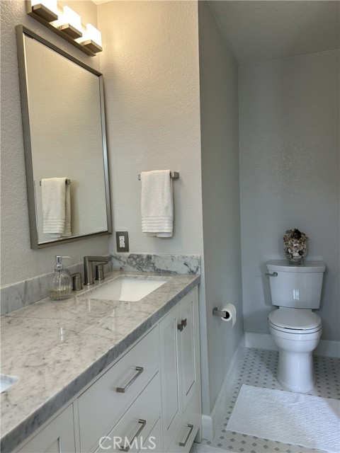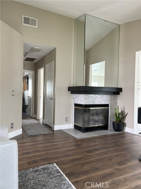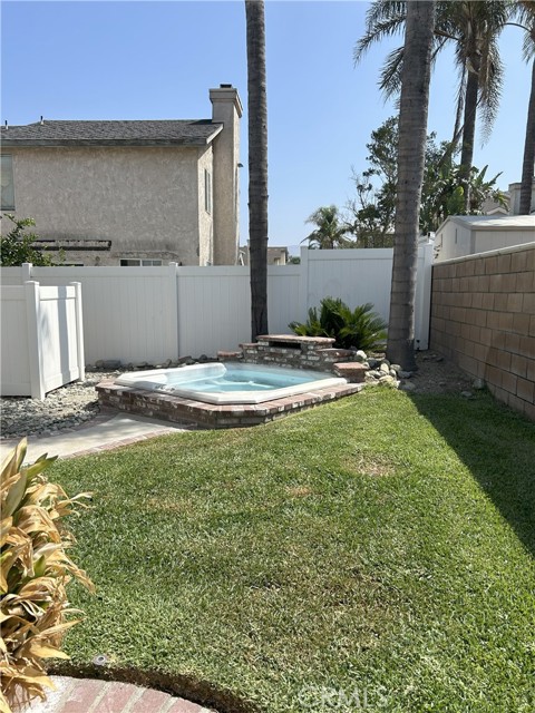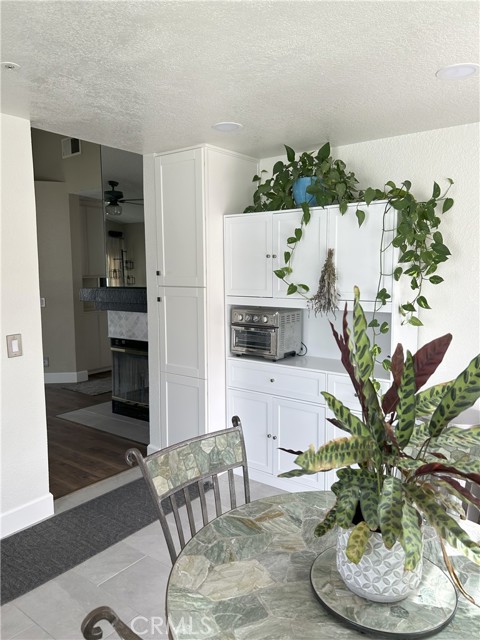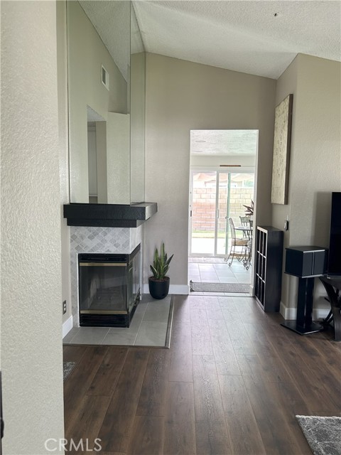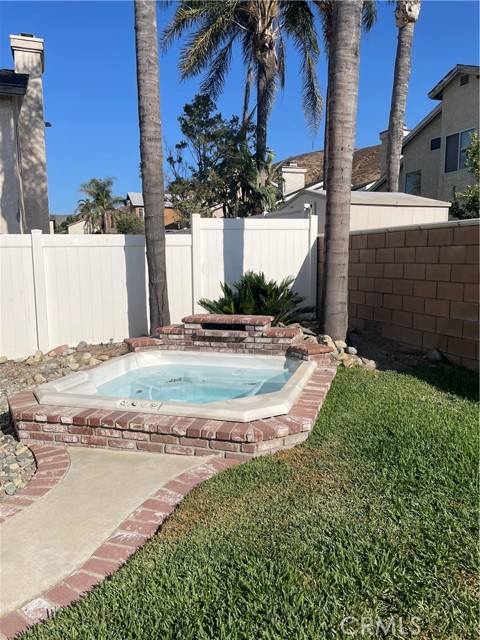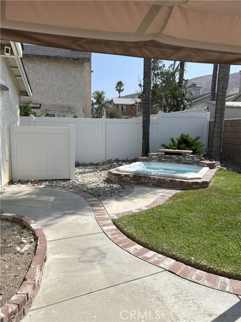 Welcome to this beautifully remodeled Southridge Village home, perfectly situated on a highly desirable corner lot! From the moment you arrive, the new front door invites you inside to a bright living room with soaring vaulted ceilings. The cozy fireplace is framed with elegant Arabesque Carrera marble tile perfectly matching the kitchen backsplash, and the newer engineered wood flooring flows seamlessly from the living room through the hallways and bedrooms. Step into the heart of the home—the newly remodeled kitchen and dining area featuring crisp white cabinetry with soft-close doors/drawers, grey quartz countertops, and a full suite of stainless steel appliances which opens to the patio with a sun-shaded pergola, perfect for outdoor dining and entertaining, and a relaxing in-ground spa. Down the hallway, the remodeled guest bathroom showcases a custom walk-in shower with a frameless glass door, stylish glass tile in shower, tile flooring and marble accents. A spacious guest bedroom includes a ceiling fan with remote, while the primary suite offers vaulted ceilings, patio access, and a luxurious spa-like bath with a double marble vanity, marble accents, and a tub for soaking for a perfect end to your day. Conveniently located near parks, schools, shopping, restaurants, and a community center—this turnkey home is ready for you!