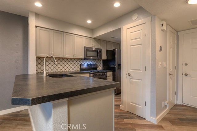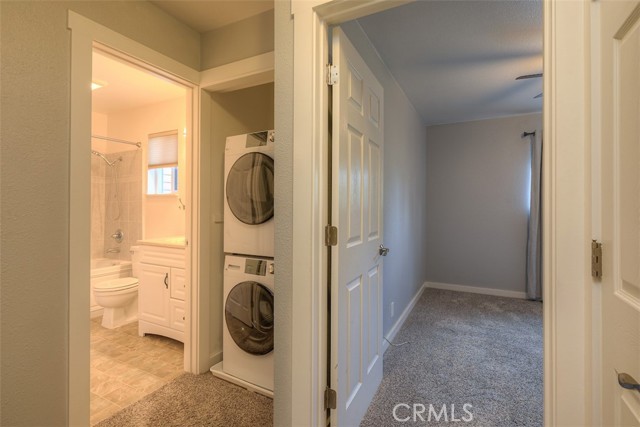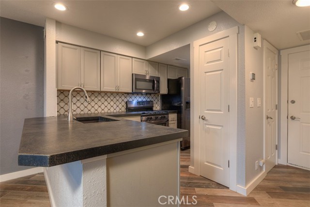 Welcome to this beautifully updated condo, showcasing over $50,000 in recent renovations completed within the last two years. This home shines with modern upgrades and thoughtful design, offering both style and functionality. Freshly painted walls, new carpets, and sleek tile flooring create a bright and inviting atmosphere. Large windows and updated lighting enhance the open, airy feel. The kitchen boasts custom cement sinks and countertops, newly installed cabinets, and an open layout with a removed wall, providing extra counter space and seamless flow into the living area. All kitchen appliances, plus a stackable washer and dryer (installed 2023), are included. A custom storage area under the stairs features a charming sliding barn door, maximizing space and style. A brand-new HVAC system ensures year-round comfort. Enjoy a private back porch surrounded by mature landscaping and a fully enclosed front courtyard, perfect for relaxing or entertaining. Centrally located within the complex, away from busy roads, with easy access to California Park’s walking trails, the association pool, and nearby mailboxes. This move-in-ready condo blends modern upgrades with a serene, convenient lifestyle. Don’t miss your chance to own this gem—schedule a showing today!