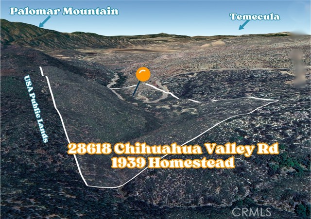 78.19 total acres - 3 tax parcel numbers, TWO LEGAL PARCELS - of natural wonder for sale together. More than one parcel is optimal for lot line adjusting or reconfiguring for greater value overall or for selling off portions separately. Off-grid but with a well, this property was homesteaded in 1939, deed signed by FRANKLIN D. ROOSEVELT! A small, modest cabin on site seems to pre-date the San Diego permit process year of 1950. Not currently habitable or bank lendable as a residence, but it's something! The Chihuahua Creek runs through the length of the property (a tributary to the Temecula Creek and Santa Margarita River system), and the acreage is replete with massive oak groves, sycamore, cottonwood, and willow. Wildlife includes deer, turkey, quail, bobcat, and more. Public domain lands border acreage to the south and west. The land is terraced with a rough driveway that winds way up to the upper elevations where you can see out and over the oak forest, and out to Oak Grove and Palomar toward Temecula. There is also another 80-acre property to the east for sale separately by an outside owner.