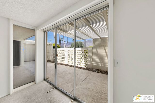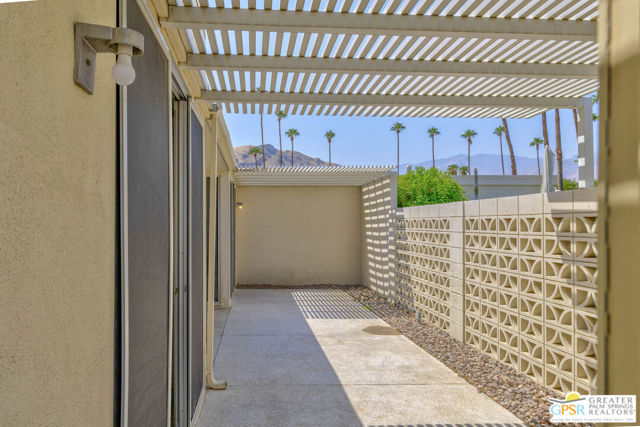 Welcome to Sandcliff, a nationally recognized historic community featuring timeless 1964 Desert Modern architecture by renowned designer Sherwin L. Barton. This 2BR/2BA plus den home offers 1,821 sq ft of single-story living with breathtaking western views of Mount San Jacinto from nearly every room. Enter from your dedicated carport (with two storage spaces) to discover an open-concept layout flowing effortlessly from the kitchen with bar seating through dining area to spacious living room. Sliding glass doors provide easy access to community green space, while the adjacent den and both bedrooms open directly to your expansive private west-facing patio enclosed by classic breeze block walls. The well-appointed kitchen flows naturally into the dining and living areas, perfect for entertaining. A large walk-in pantry and ample storage closets line the main hallway, alongside a bright guest bathroom featuring skylight and walk-in shower. The primary suite showcases a dramatic skylight, updated bathroom with walk-in shower, and convenient in-suite laundry area. Nestled in South Palm Springs, this intimate 40-unit community offers two stunning 40-foot pools with spas and loggias, beautifully landscaped grounds, and the sophisticated desert lifestyle that made Palm Springs famous. HOA fee of $575/month includes maintenance of common grounds, pool and spa, mailbox, and building exterior. At $550K ($302/sqft), this FEE land property presents exceptional value for buyers ready to move in immediately or add their personal touch to this historic gem. The combination of stellar location, historical significance, mountain views, huge private patio, and resort-style amenities creates an unmatched opportunity in today's market. Perfect for those seeking authentic mid-century modern living with room to customize and grow. Don't miss your chance to own a piece of Palm Springs history!