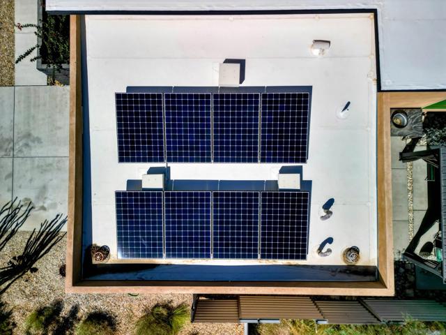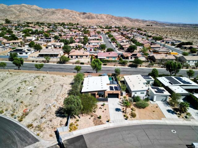 Breathtaking mountain views and a sparkling pool set the scene for this well-maintained mid-century–style home on a quiet cul-de-sac near the Spa District. Built in 2017, this 2,054 sq ft residence combines dramatic architecture, soaring ceilings, oversized windows, and light-filled living spaces that bring the desert landscape right inside. The open-concept kitchen is a showstopper, featuring an impressive island with under-counter lighting, abundant cabinetry, and seamless flow into the living and dining areas—perfect for entertaining. Durable tile flooring runs through high-traffic zones, while plush carpet adds comfort to the bedrooms. The primary suite offers a spacious walk-in closet and a serene retreat, while the secondary bedrooms share a stylish Jack-and-Jill bathroom, creating both privacy and convenience for family or guests. Step outside to your private desert-chic oasis: sparkling pool and spa, two gazebos, and low-maintenance landscaping—perfect for relaxing or entertaining. Practical upgrades include a paid-off solar system for the home, a tankless water heater, a two-car garage with extensive built-in shelving, a storage shed, and no HOA fees. Sitting on a generous 10,018 sq ft lot, this 3-bed, 2-bath gem combines style, comfort, and savings—ready for you to enjoy now.