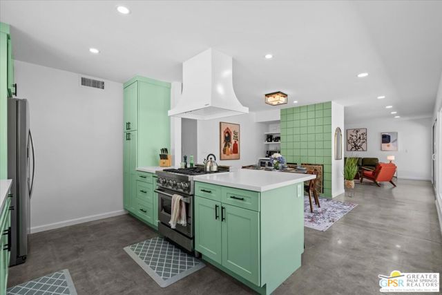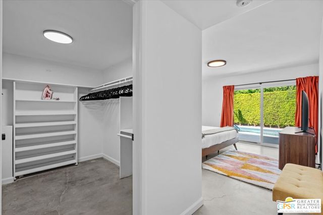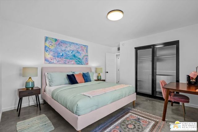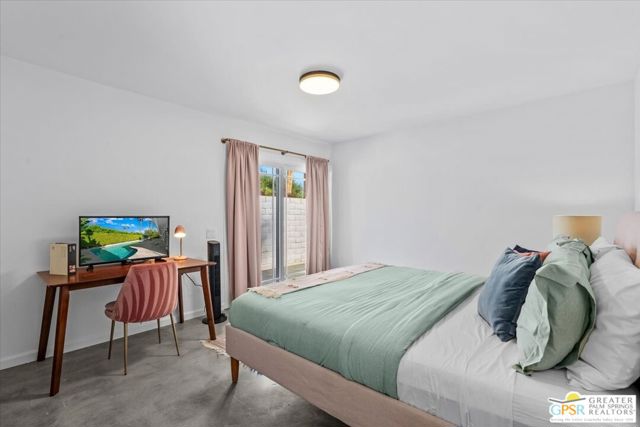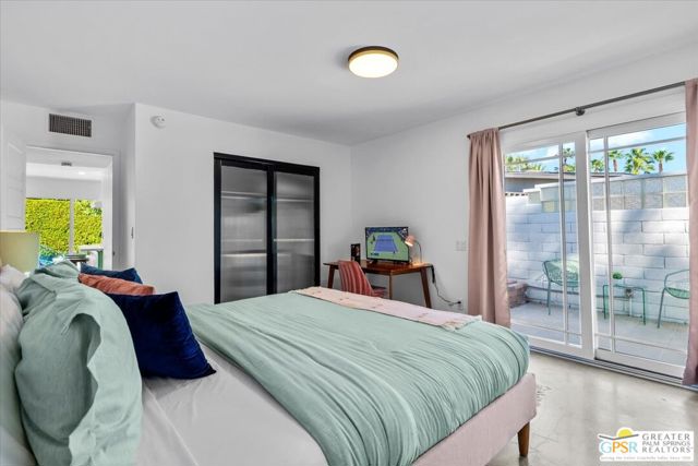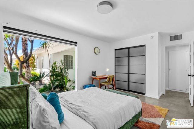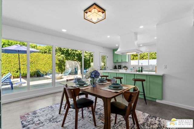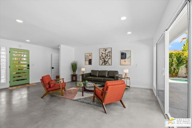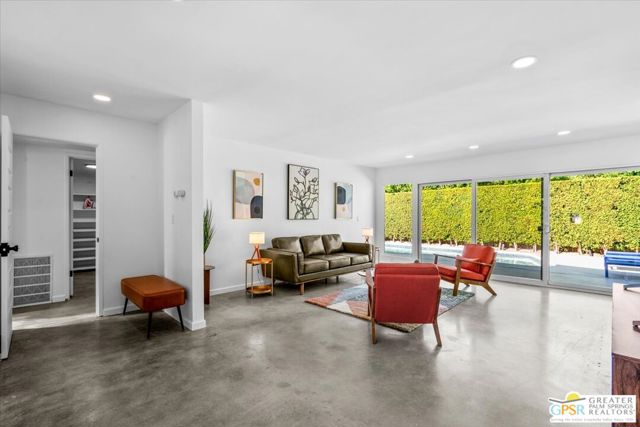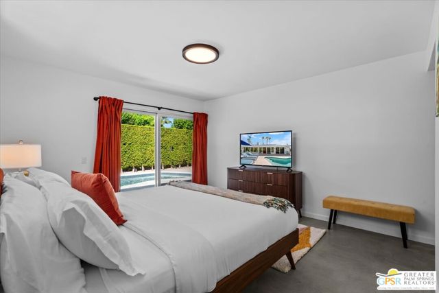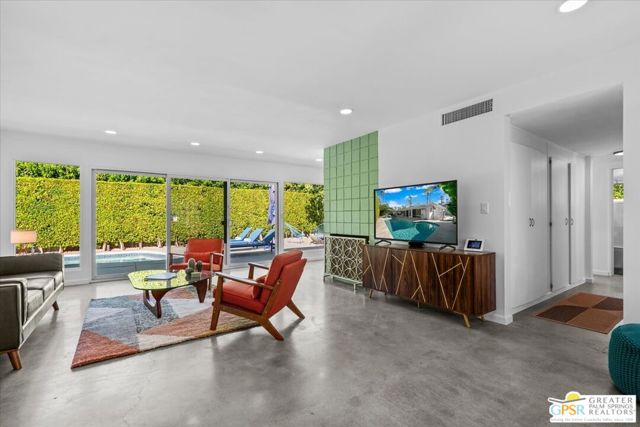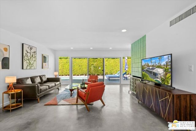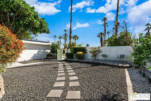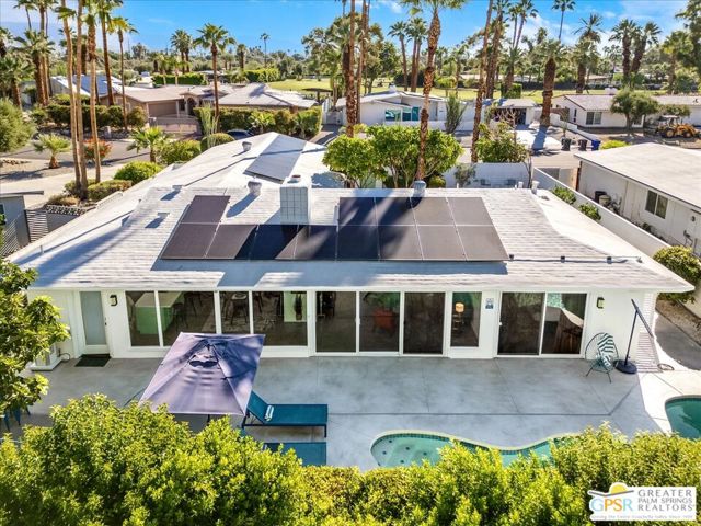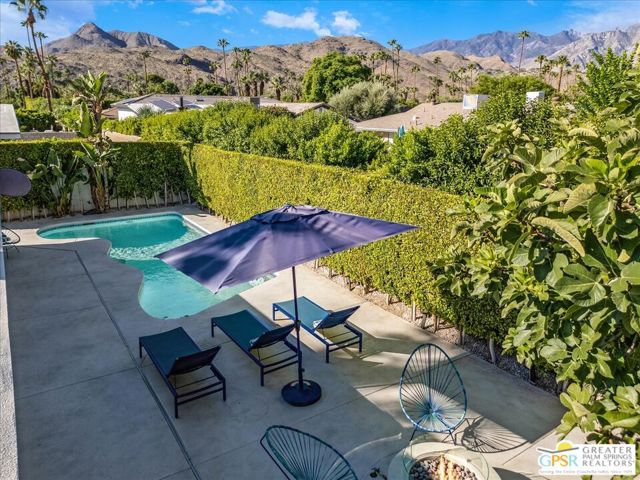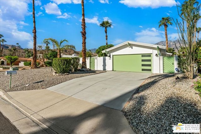 This updated and reimagined Mid-Century modern gem in the highly desirable Tahquitz Creek Golf neighborhood offers fee simple land, bright open interiors, and seamless indoor-outdoor living. Offered turnkey furnished, this home is move-in ready for full-time living, a weekend getaway, or income potential. Step inside to a warm living room with a double-sided fireplace and wall-to-wall glass framing the sparkling pool and lush backyard. Multiple patios, fruit and plumeria trees, a fire pit with mountain views, create the ultimate private retreat. Primary ensuite wing with oversized walk-in closet and rear patio access separated from guest bedrooms and bath on opposite side of the home. The updated kitchen features quartz counters, stainless appliances, and a dual gas/electric convection oven perfect for entertaining from intimate dinners to poolside cocktails. Recent upgrades include new bathrooms, new interior and exterior paint, dry bar with beverage center, a new foam roof, polished concrete floors, modern lighting, 22 solar panels with transferable contract, and an EV charger. This South Palm Springs home is convenient to golf, dining, shopping and everything that makes the desert a paradise for homeowners.