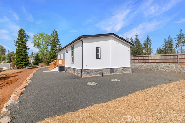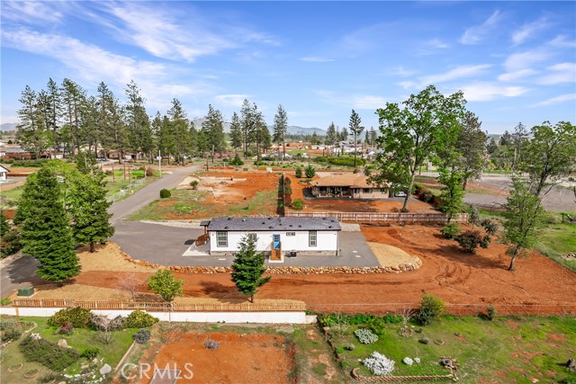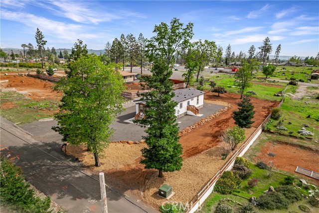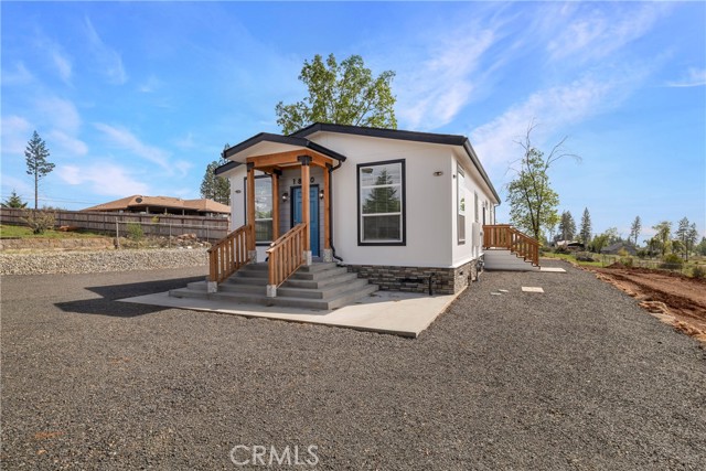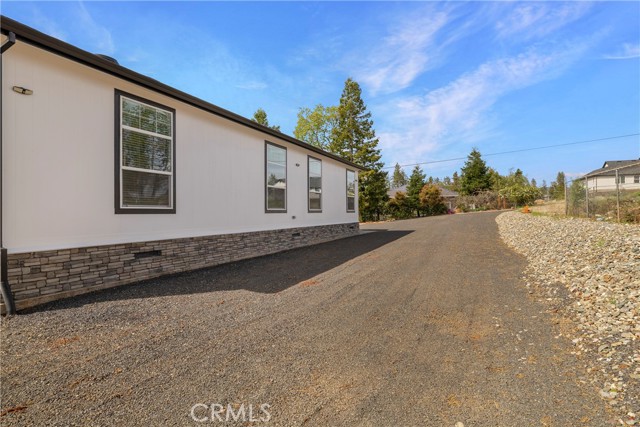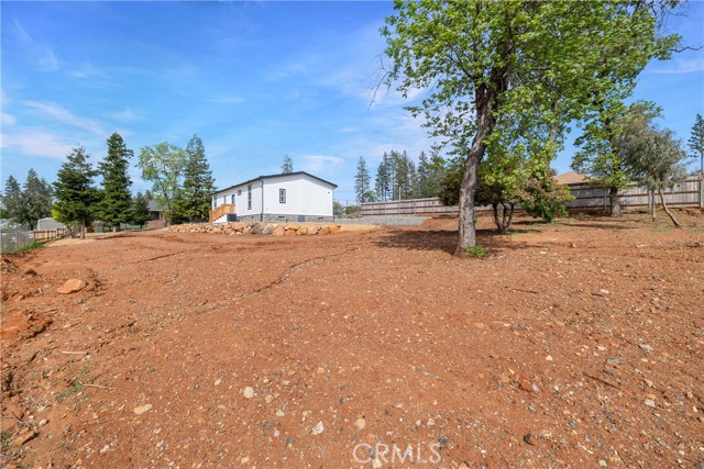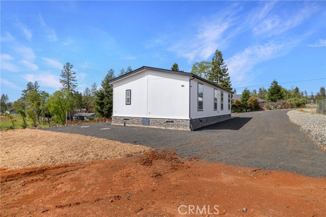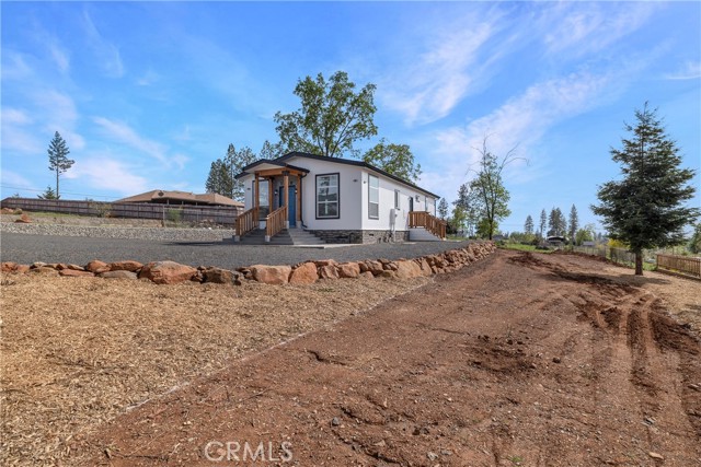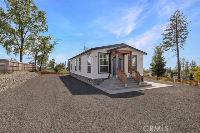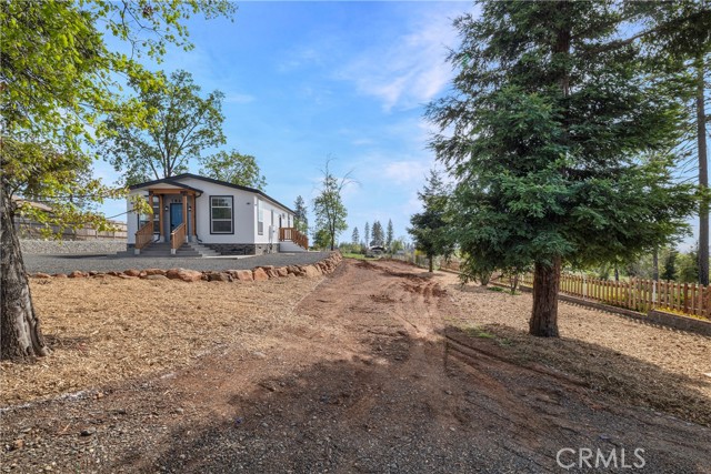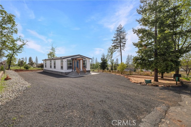 This New Manufactured Home on .5-acre lot is ready for a new owner. The builder poured a concrete slab before setting the home, wonderful upgrade. The concrete slab extends to the front covered concrete porch measuring 11'X24'. New septic tank and leach field! R.V. / Boat / Trailer parking measures 22'X80'. Plenty of room for a garage / shop. The skirting is solid ledger stone! The home offers 9ft. ceilings throughout and oversized windows with blinds. The open floor plan kitchen and living room offer 5" baseboards, 4X8 island, granite countertops, Whirlpool Appliances, Solar tube, Recessed Lighting, upgraded ceiling fan/light and lots of cabinets. Off the living room is a den/office or just extra living space. The primary bath offers granite counters and step in shower. The guest bath offers granite counters and a tub/shower combination. The exterior siding is cement board. The builder also put in a gutter system with drainage pipe that keeps water away from the home. Nice mature trees: 3 Oak Trees, 2 Redwood Trees and a variety of smaller trees. This would make a great home for a new Paradise resident.
