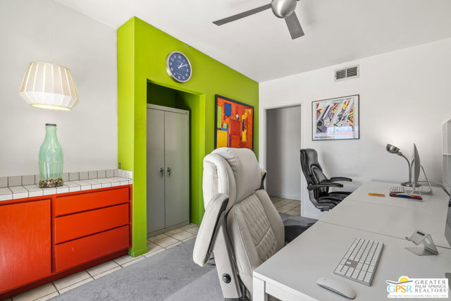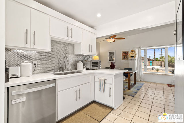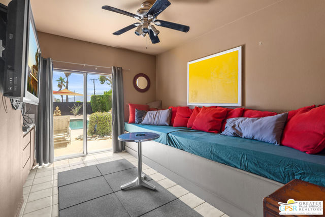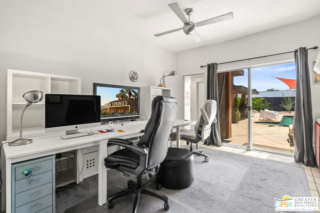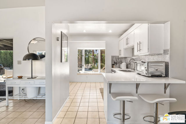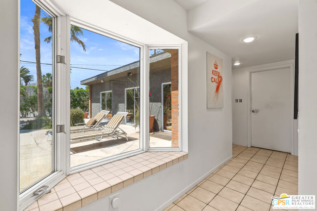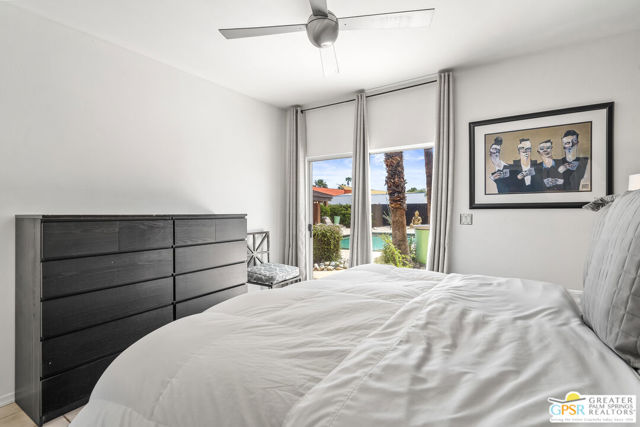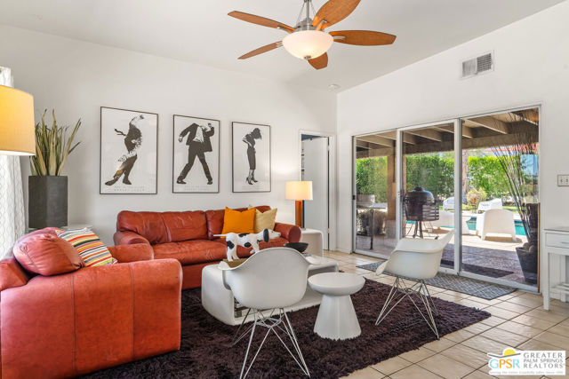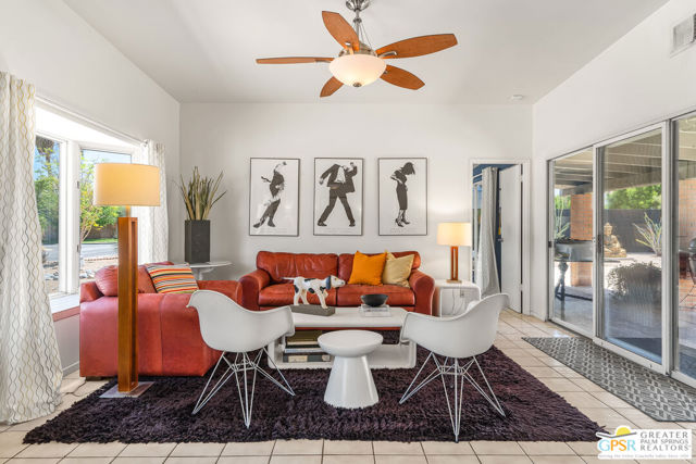 Welcome to Desert Park Estates in beautiful Palm Springs. Please view the 3D Matterport tour and Floorplan! This mid-century modified charmer is a veritable blank canvas, priced to allow your own creative vision and customizations to turn it into the home of your dreams! This property is located on a quiet street and offers gorgeous mountain views. The home forms a classic "L" shape around the serene backyard, pool and deck. A generously sized crystal blue pebble-tech swimming pool with built-in bar stools reflects a covered patio surrounded by desert landscaping, palm trees, and a large shimmering gold Buddha (Hello, The White Lotus!) to make this scene-stealing backyard retreat your private sanctuary for sun, relaxation, and entertaining! The home features 3 bedrooms, plus a study which could be a 4th bedroom and 4 bathrooms. 3 large sets of custom windows on the front of the house and 5 sets of sliders on the back allow tons of natural light, while offering beautiful views of the pool, deck, hummingbirds, and statuesque San Jacinto Mountains. (BTW - with all of the window views and the convenient grassy area in the backyard, your pets will LOVE this house!)There are master bedroom suites at opposing ends of the property, ideal for in-laws or guest quarters. The generous 2-car garage includes laundry and a bathroom. Leased rooftop solar panels. You need to see it to appreciate it! Priced to sell. Don't wait. No HOA - No Land Lease!