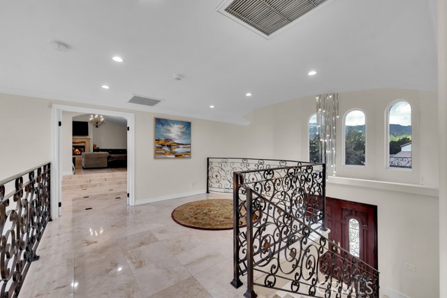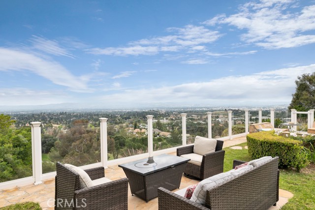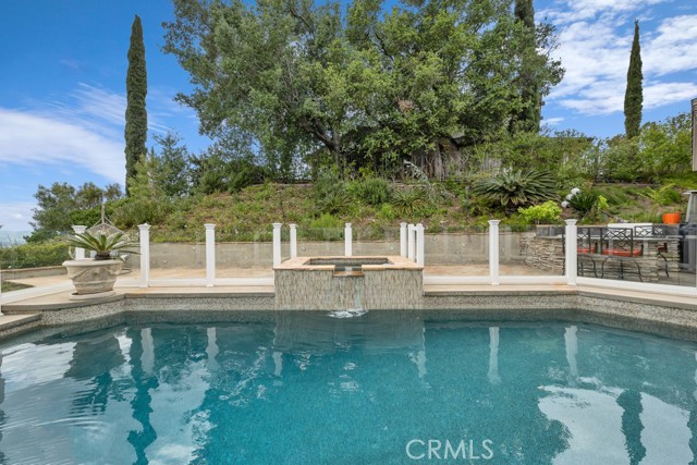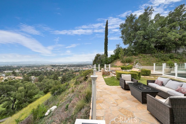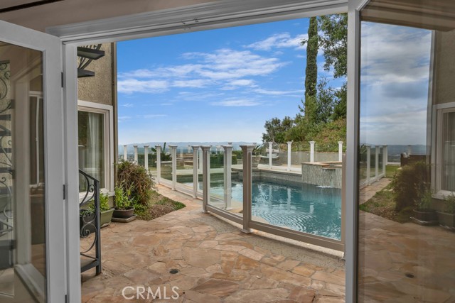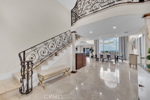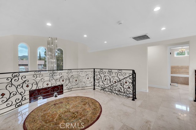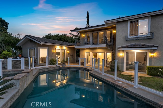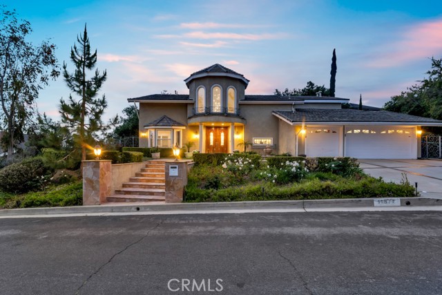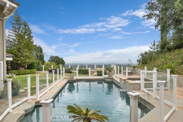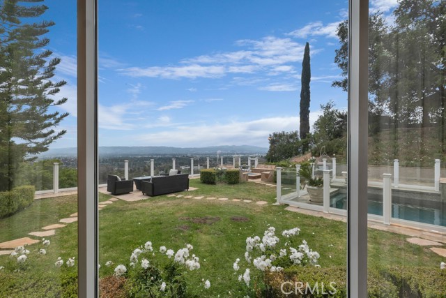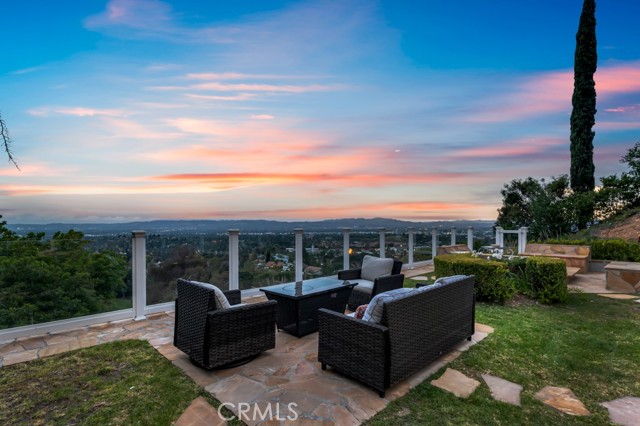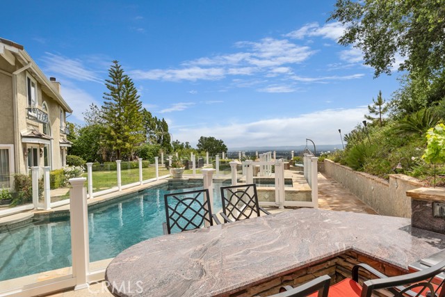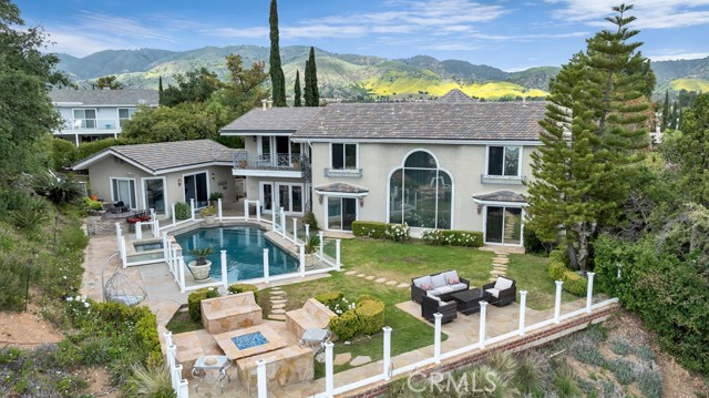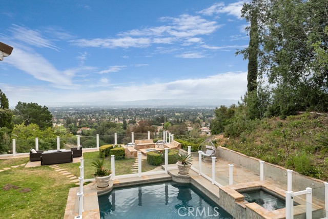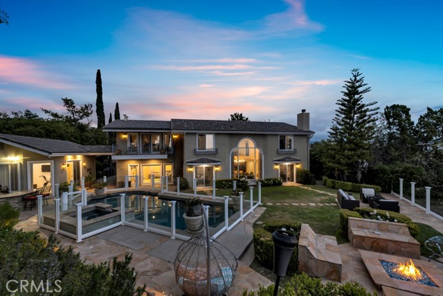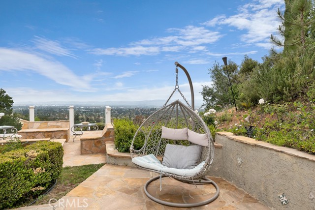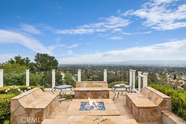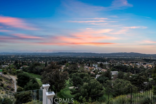This Castle on the hill is an Enchanting Estate offering comfortable and luxurious indoor/outdoor living with one of the best views in the valley! This home reigns over unparalleled City and Golf Course views. There is a grand Foyer w/Marble Flooring, Vaulted Ceilings, and breathtaking floor-to-ceiling views from a magnificent window. The dazzling open concept design highlights an elegant Dining Room with soaring ceilings, awash in natural light, and flanked on either side by sleek living rooms. Also in this large open space is an impressive wet bar designed to perfectly maximize the space under the elegantly designed staircase. The beautiful Chef’s Kitchen features a breakfast bar, formal eating area, Granite Counter tops, New Mahogany Cabinets, a 6-Burner Cook Top, Double oven, and Built-in Microwave. The Family room has built-in cabinets, a fireplace, recessed lighting and a speaker system. The loft is perfect as an Office/Library. Two bedrooms are separated by a full bathroom complete with Jetted Tub and Steam Shower. The one-of-a-kind Primary Bedroom Retreat boasts a large Sitting Room, double sinks, dual showers separated by the Jetted tub, and a huge walk-in closet. This Bedroom has a Coffee Bar w/built-in fridge, a fireplace, and a custom terrace featuring a spiral staircase providing direct access to the backyard. This Entertainer’s Paradise features unobstructed views of the 16th and 17th holes of the Porter Valley Golf Course and a City sight line spanning from Burbank to Thousand Oaks. This serene setting features natural stone hardscape and lush landscaping which compose dedicated areas to relax, dip into the magnificent Pool and Spa, warm yourself by the welcoming fire pit, or honing your skills as a grill master at the built-in BBQ. The Guest House provides you with options galore! This magnificent view home is truly the Crown Jewel of Porter Ranch with impressive details at every turn, space, serenity, and the promise of an incredible lifestyle.