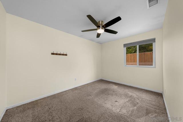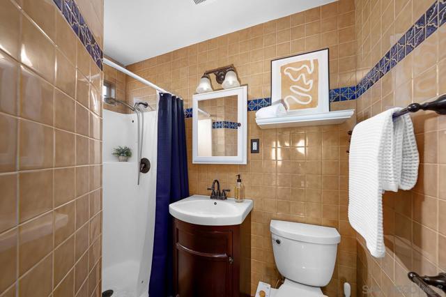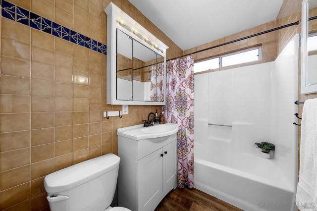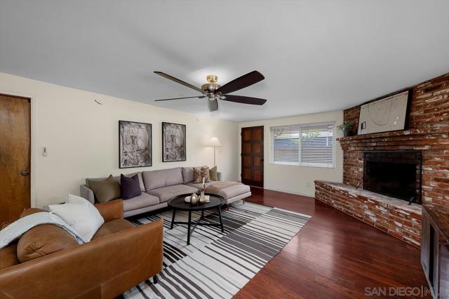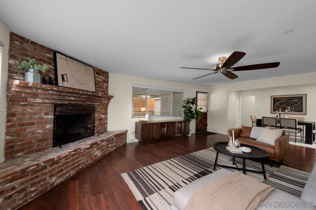 Nicely updated 3-bedroom, 2-full bath home with large back-facing family room in North Clairemont awaits. Tasteful touches include wide-plank and tile flooring, recessed lighting, accent walls, ceiling fans, tons of cabinet space, built-in shelving, and a real brick fireplace. The backyard has a covered concrete patio with a terraced back perimeter ideal for gardening, and with ample space for a pool and hot tub. The backyard casita is equipped with AC and electric so perfect for an at-home office, kids' play space, or hobby hut. The garage has a built-in room with AC unit. Solar to be paid at close.