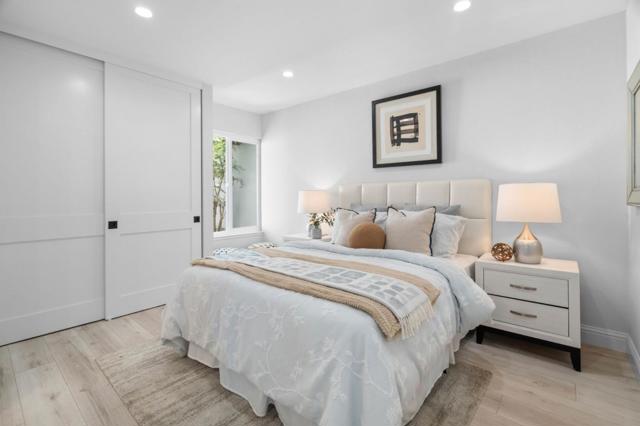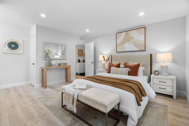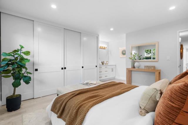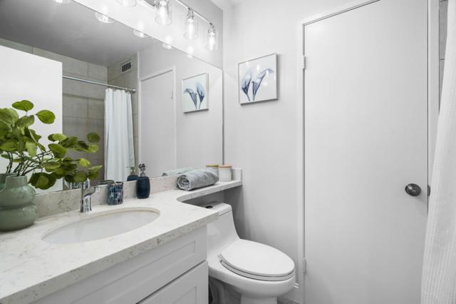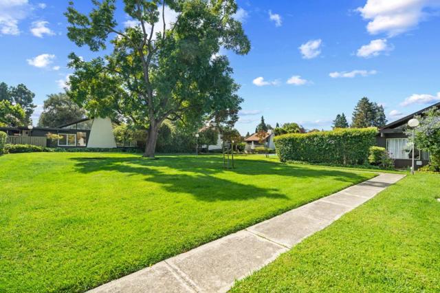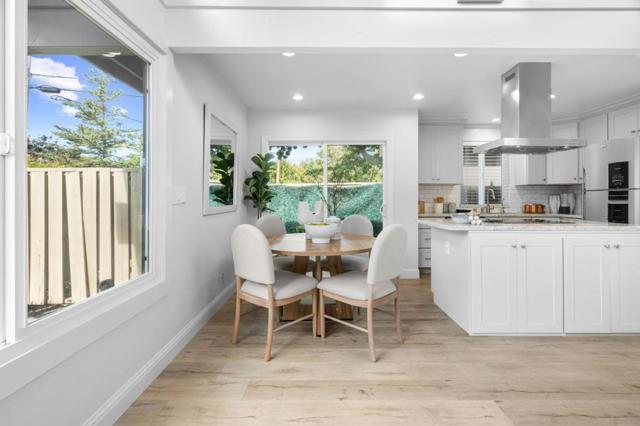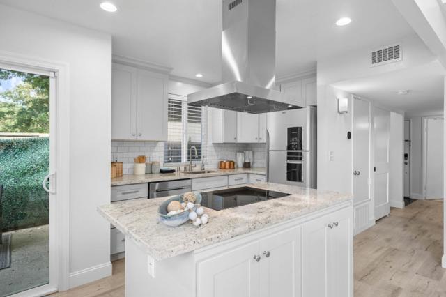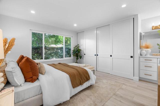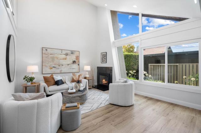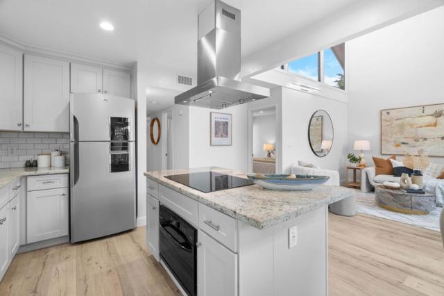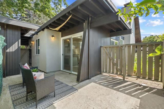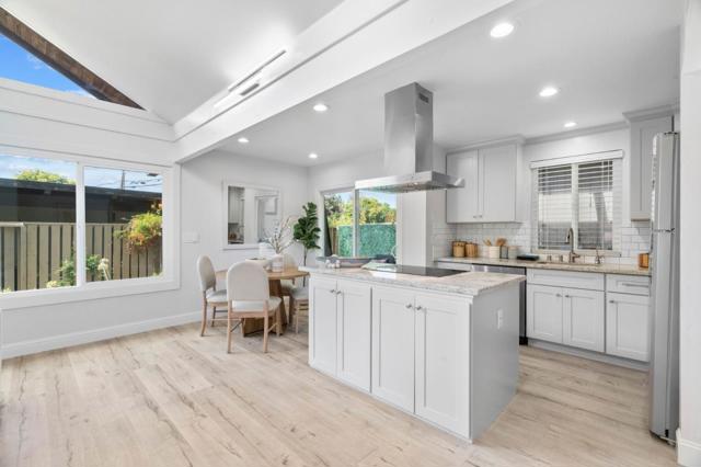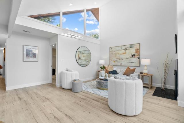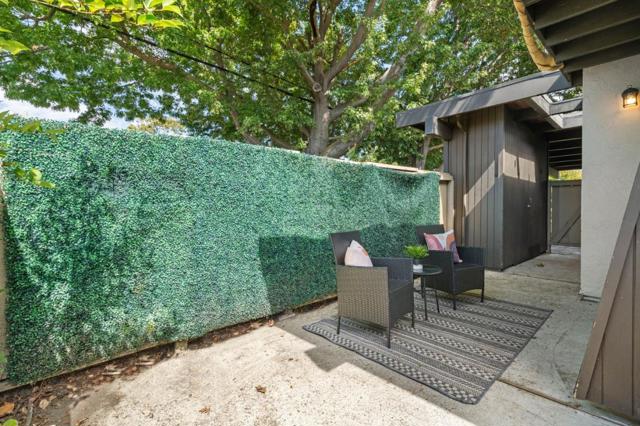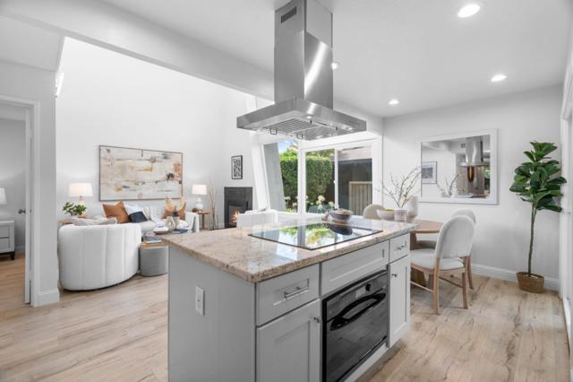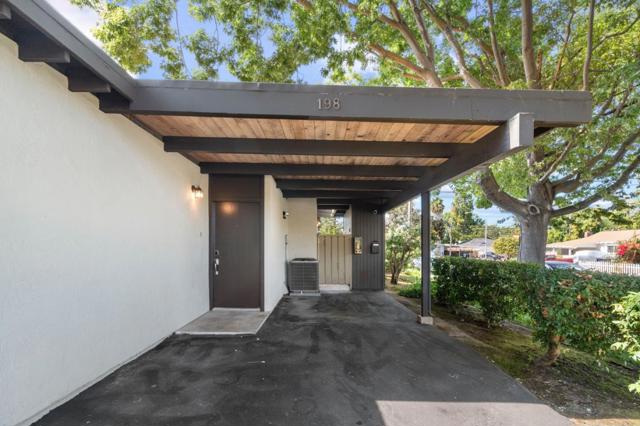 Contemporary single-level end-unit PUD (FEE ownership of land) tastefully remodeled with premium finishes. This unit is special in that it features inside laundry and central A/C. Dramatic tall ceilings with numerous windows fill the open and bright floorplan with natural light. Freshly painted interiors, wood-like vinyl floors throughout, dual paned windows, recessed lights. Spacious living and dining room combination features the towering ceilings and expansive windows with garden views and sliding doors open to private patio for easy indoor-outdoor enjoyment. Remodeled designer kitchen features white cabinetry topped in granite slab with white subway tile backsplashes; center island includes an smooth-surface induction cooktop and suspended stainless steel vent hood. Other appliances include a GE Profile oven, Samsung dishwasher, and Summit smart refrigerator. Primary bedroom features en-suite bath with updated vanity topped in marble-style quartz, and frameless-glass shower. Bedroom 2 has direct access to a dual-entry bath (shared with the hallway). Covered carport parking, guest parking + off-street parking. Community amenities include a greenbelt park plus pool and cabana. Conveniently located moments away from downtown Mountain View Castro Street, Highways 237 & 85.