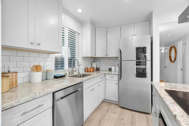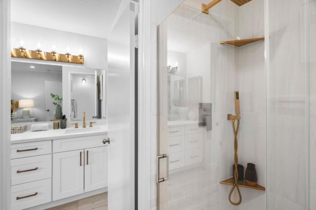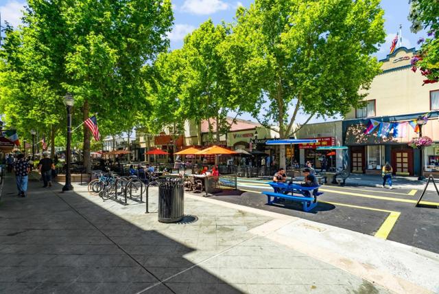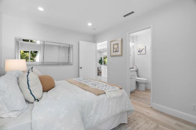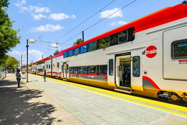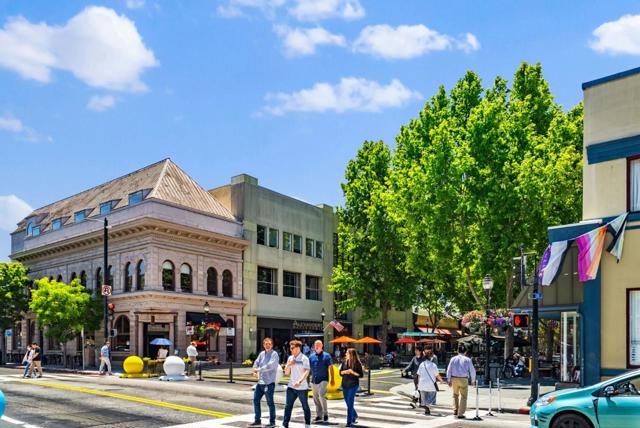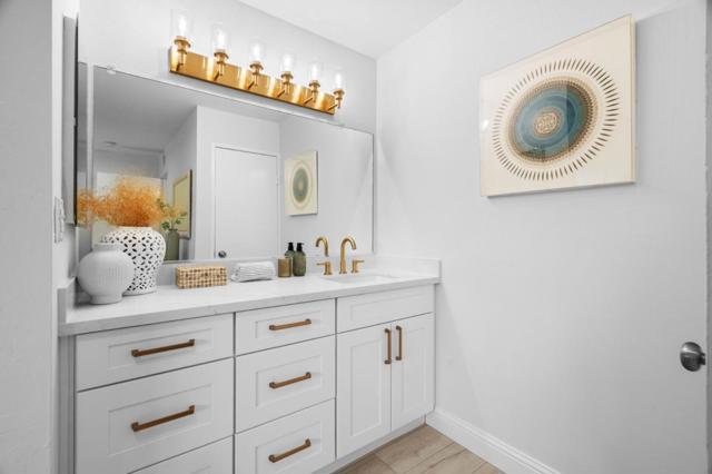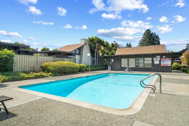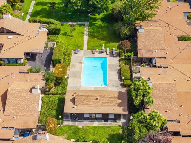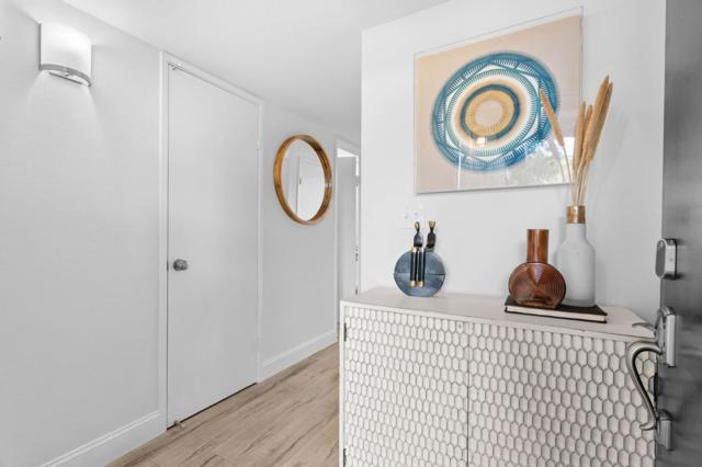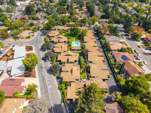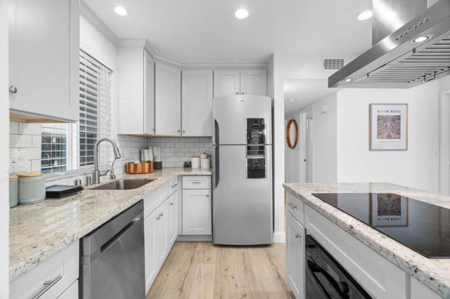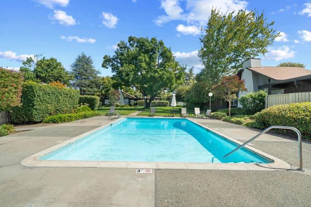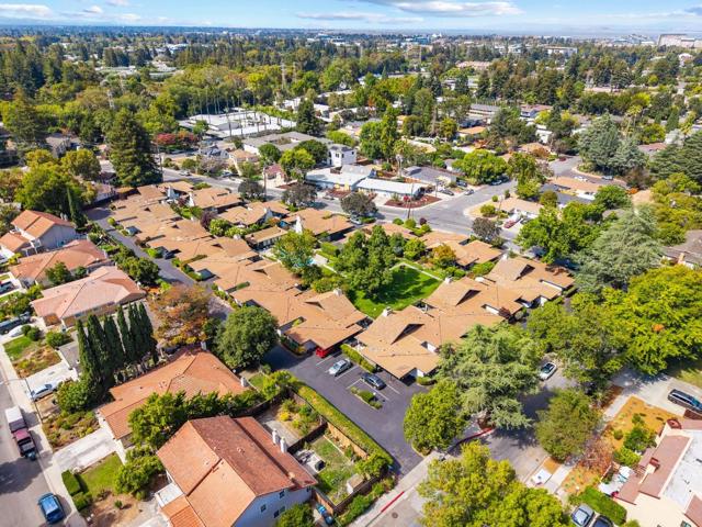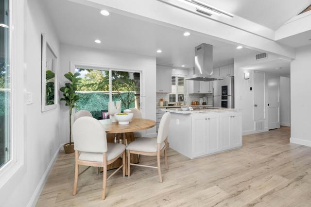 Contemporary single-level end-unit PUD (FEE ownership of land) tastefully remodeled with premium finishes. This unit is special in that it features inside laundry and central A/C. Dramatic tall ceilings with numerous windows fill the open and bright floorplan with natural light. Freshly painted interiors, wood-like vinyl floors throughout, dual paned windows, recessed lights. Spacious living and dining room combination features the towering ceilings and expansive windows with garden views and sliding doors open to private patio for easy indoor-outdoor enjoyment. Remodeled designer kitchen features white cabinetry topped in granite slab with white subway tile backsplashes; center island includes an smooth-surface induction cooktop and suspended stainless steel vent hood. Other appliances include a GE Profile oven, Samsung dishwasher, and Summit smart refrigerator. Primary bedroom features en-suite bath with updated vanity topped in marble-style quartz, and frameless-glass shower. Bedroom 2 has direct access to a dual-entry bath (shared with the hallway). Covered carport parking, guest parking + off-street parking. Community amenities include a greenbelt park plus pool and cabana. Conveniently located moments away from downtown Mountain View Castro Street, Highways 237 & 85.
