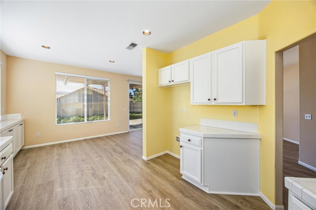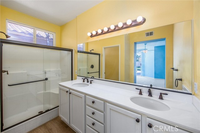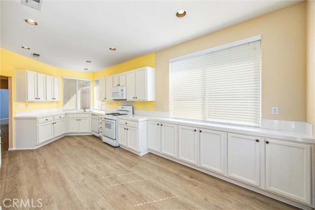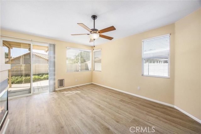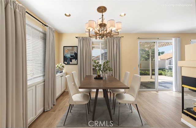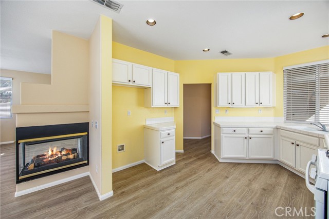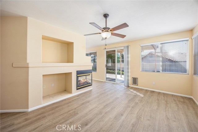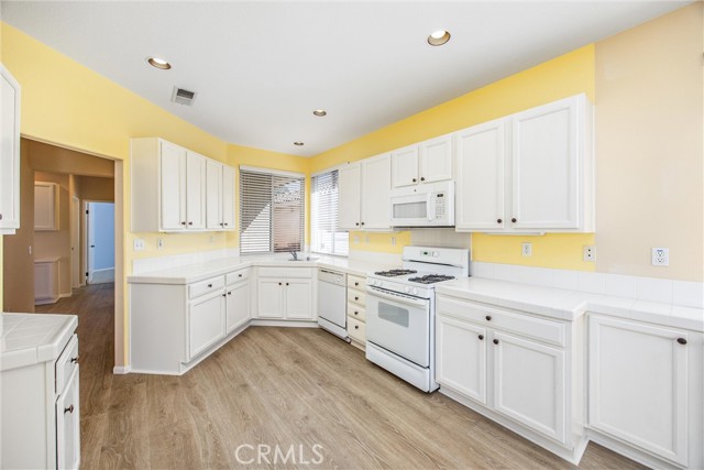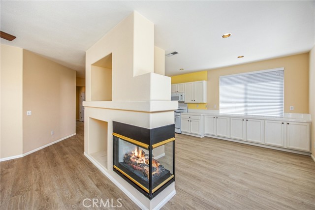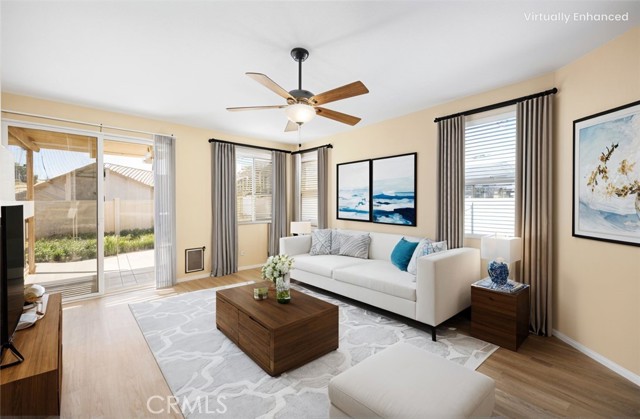 Don't miss this charming 1312 sq. ft. Magnolia home. It has been meticulously maintained and is move in ready. It features new on trend laminate flooring through-out and new carpet in the 2 bedrooms. The living room includes a double-sided gas fireplace, plenty of windows and a sliding glass door to view the lush border plantings that encircle the private backyard with concrete patio and views of the southern sky. Bring your patio table, chairs and umbrella and enjoy your own private oasis. The bright, airy kitchen and dining area has an abundance of (newly painted) white cabinets for storage and an extended serving counter for display or serving while entertaining. There is an indoor laundry room complete with washer & dryer. The primary bedroom features a sliding glass door to the patio, a walk-in closet, en-suite bath with double sinks, updated bronze fixtures & walk-in shower. The guest bedroom is in the front of the home for privacy. The light filled guest bathroom has a tub/shower and is updated with bronze fixtures. Come take a look today for a list of the many other upgrades. The location is one of the highlights of this delightful home, located near the 12th hole of the executive course on a quiet cul-de-sac and just a short walk to the north clubhouse, executive golf course, gym, library, pro-shop, swimming pool/spa, pickle ball and bocce ball courts. In addition, this fabulous, gated enclave provides two other clubhouses, gyms, libraries and pools (one indoors), tennis courts, 2 restaurants, lounge/bar and so much more. Sun Lakes Country Club is the Inland Empire’s most affordable 55+ community to live an active, fun and meaningful retirement life.