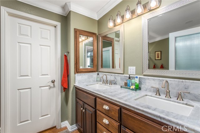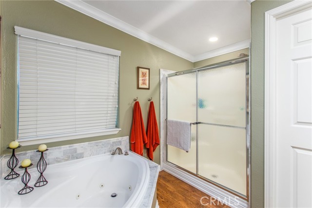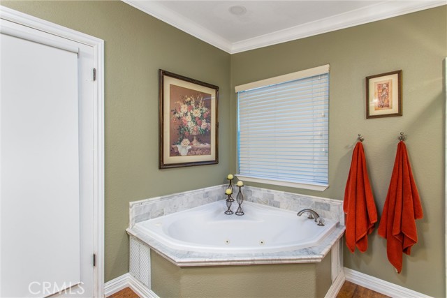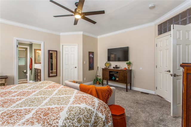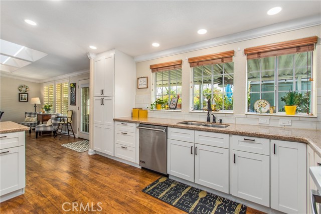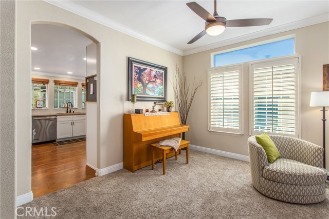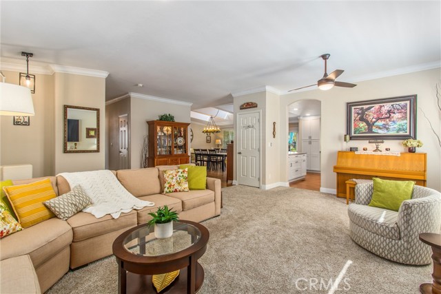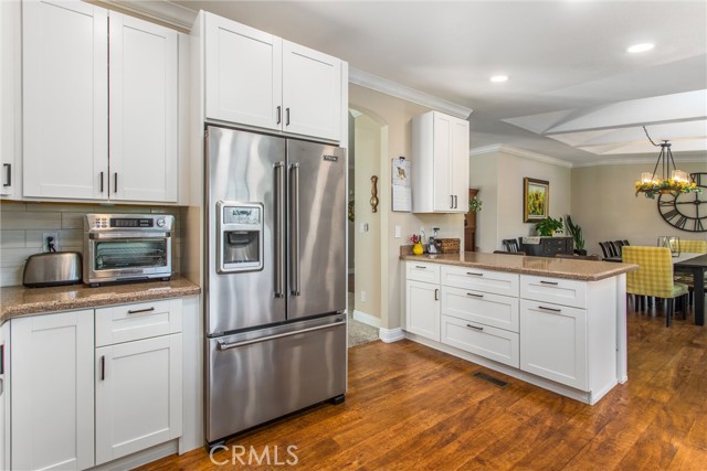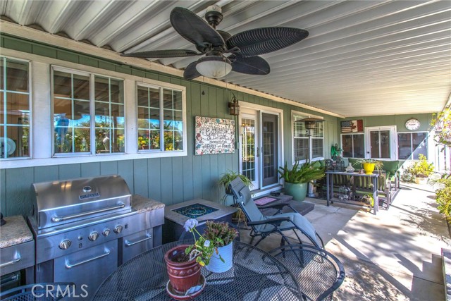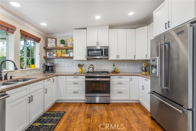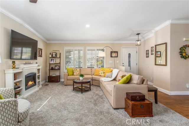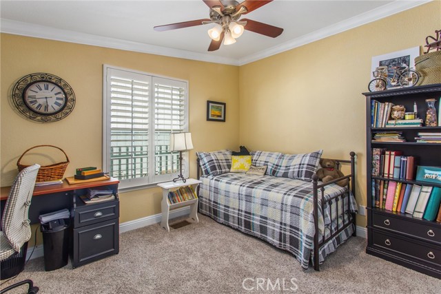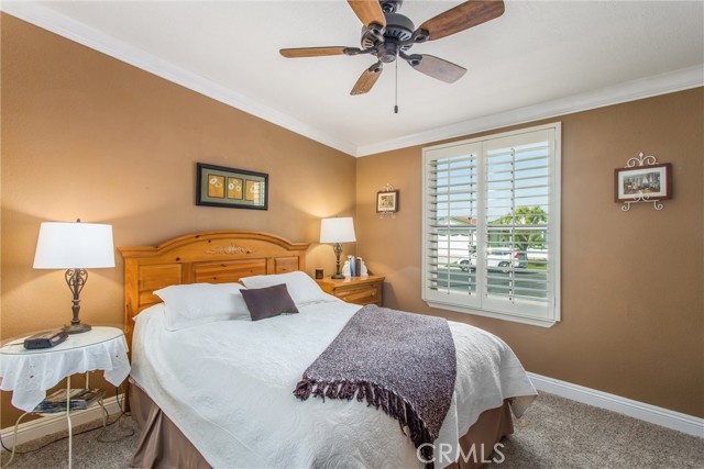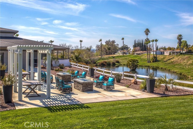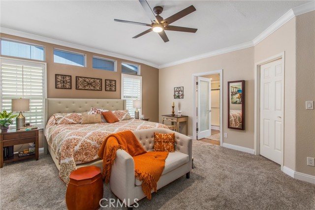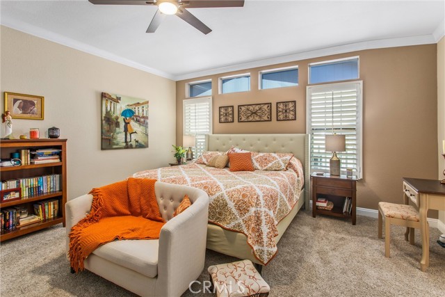 Exceptional 3-bedroom, 2-bathroom home, the largest currently available in Plantation on the Lake and one of the most spacious in recent listings. Boasting 2080 sq. ft., plus a bonus attached office, this home features stunning updates including a kitchen with new cabinets, recessed lighting, Viking appliances, and a beautiful backsplash. Crown molding, custom flooring, and ceiling fans in every room add to its charm. Enjoy Cathedral Ceilings, a front porch, and a garden paradise with tiered garden boxes a shed in the rear covered patio. The primary suite bedroom offers a remodeled bathroom with a Jacuzzi tub, walk-in shower, and marble counter. Located in Plantation on the Lake, renowned as one of the best retirement communities in the Inland Empire, offering a plethora of activities including 2 pools, 2 spas, pickleball, a putting green, fitness room, dog parks, clubhouse, and more. With low taxes and resort-style living, Plantation on the Lake is the ultimate 55+ active adult community, complete with ponds teeming with wildlife, multiple outdoor fire pit recreation areas and so much more, making it a true retirement destination