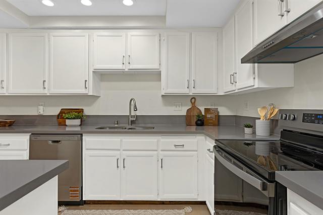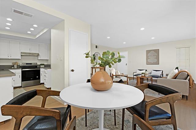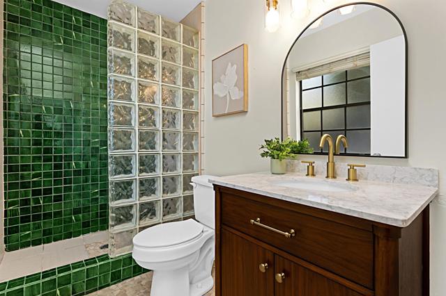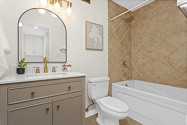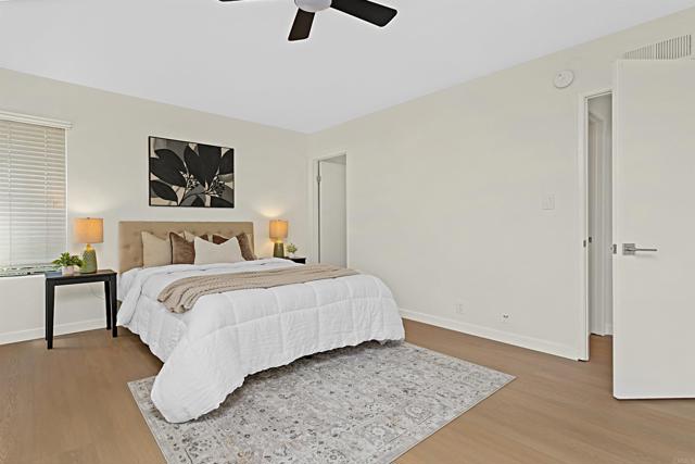 Set within the gated community of Felicita Villas, this thoughtfully updated end-unit offers a rare balance of style and attainability—priced at $499,000 and designed to feel like so much more. Light pours into the open-concept living space, grounded by wide-plank floors and framed by sliding glass doors that open to a private, palm-lined patio. The kitchen pairs clean white cabinetry with charcoal-toned quartz, creating a modern, understated palette that flows easily into the dining and living areas. In the bathrooms, design details shine—travertine tile, brushed brass fixtures, and an emerald green–tiled en-suite with vintage glass block bring personality and charm without pretense. The oversized primary suite offers direct patio access and mirrored closets, while in-unit laundry hookups and two parking spaces add everyday ease. FHA and VA approved, this is the kind of home that rarely comes along—quietly elevated, effortlessly livable, and ready to make its mark.