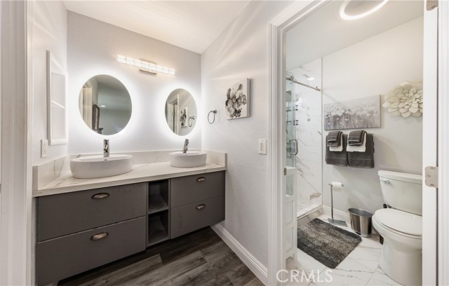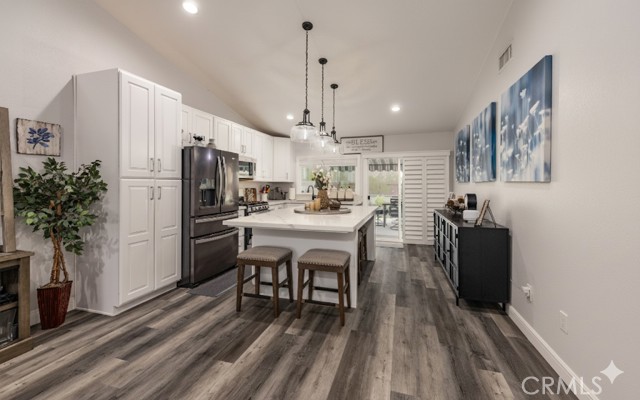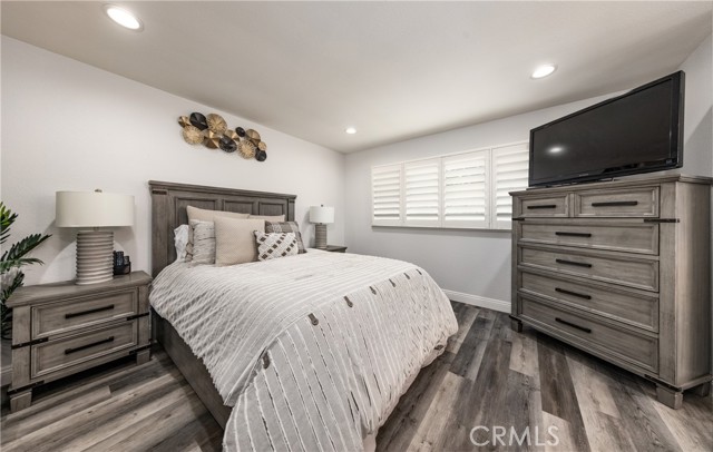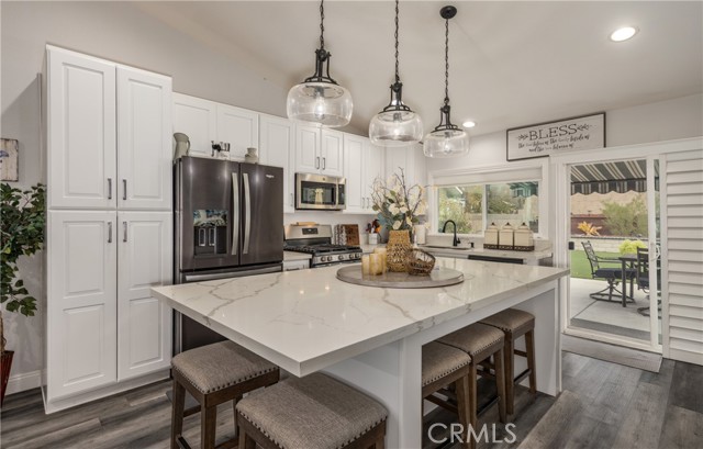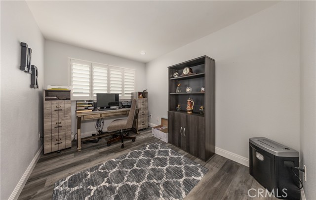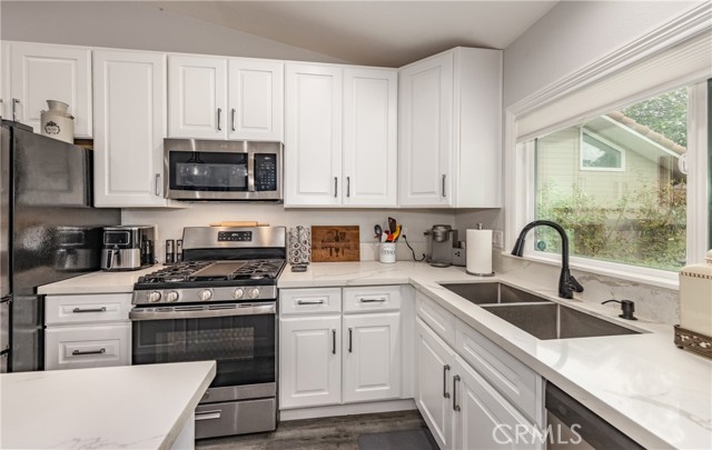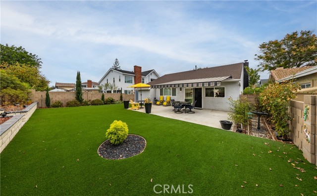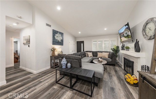Cute single-story home with countless upgrades!! Upon entering the home, there is an open concept main living and kitchen area with vaulted ceilings. The family room has a cozy fireplace whereas the kitchen features notable upgrades such as newer cabinets, quartz countertops, newer appliances and fixtures (2021). The extra large kitchen island provides room for meal prep as well as space for seating. Both bathrooms are also newer: the primary bathroom has a dual vanity and mirrors with integrated lights and a separate room with the toilet and walk-in shower with a glass sliding door. The second bathroom is complete with a toilet, newer vanity and a shower in tub with tiled walls and a glass sliding door. The vinyl flooring and AC unit are newer, the water heater was installed in 2023, all windows are dual pane and the majority of them have louvered shutters. Other interior features include the SMART thermostat and alarm system. The 2-car spacious garage has epoxy floors and a modern newer garage door. Outside, the front and back yards are easy to maintain with artificial turf and the rain gutters have been outfitted with leaf filters to keep the gutters clear. The backyard has a concrete patio with a motorized retractable awning and a storage shed for extra storage. You can't go wrong with this location: situated in a well-established neighborhood and close to parks, stores, restaurants, schools, etc etc. This beauty is MOVE-IN READY!!
