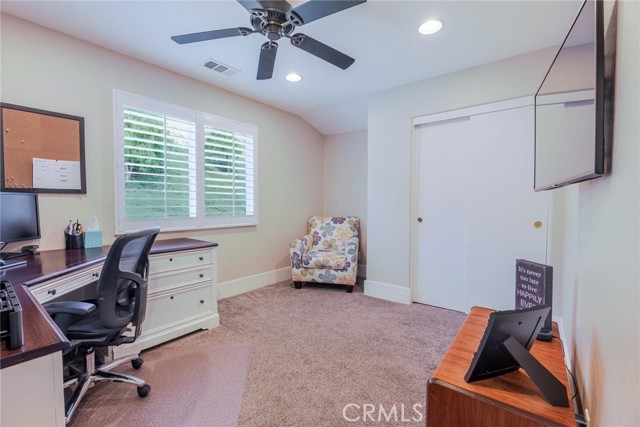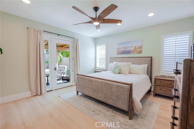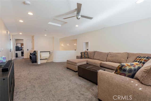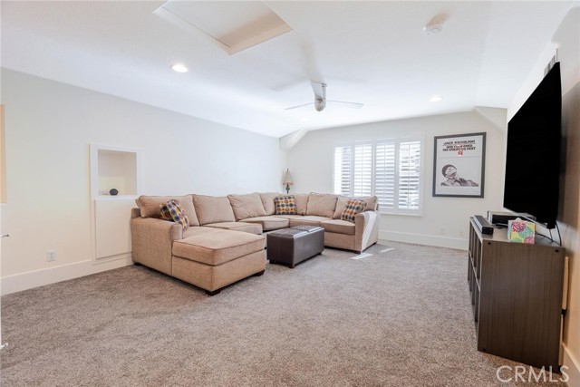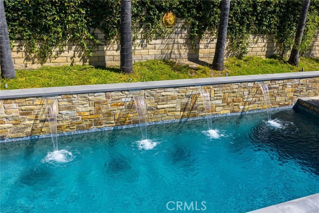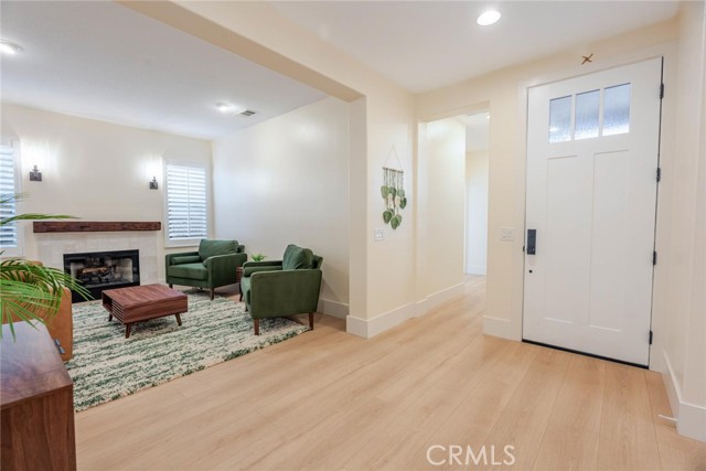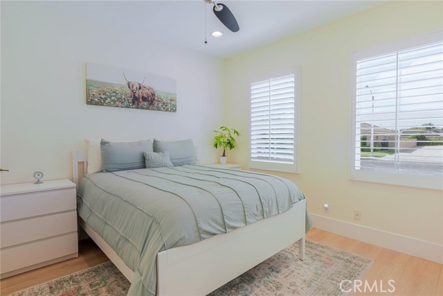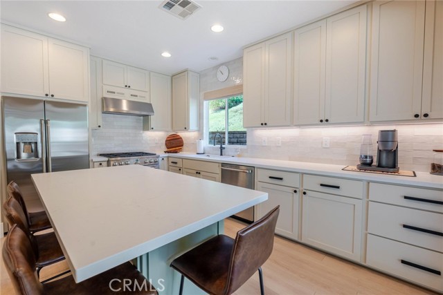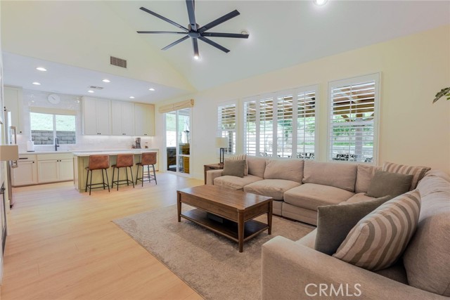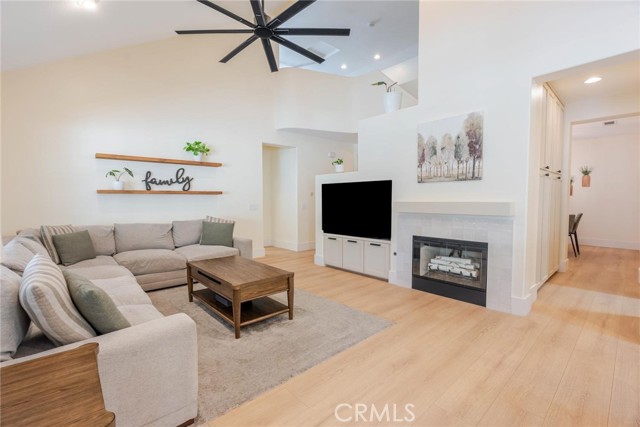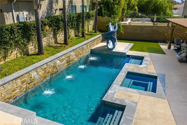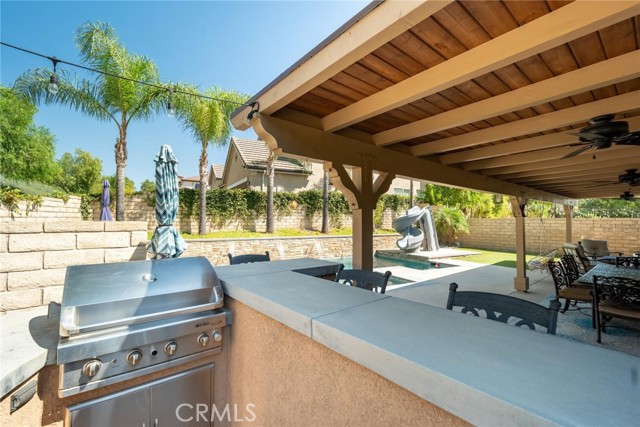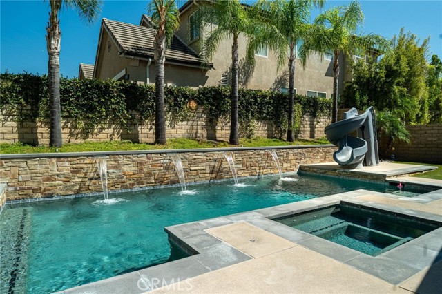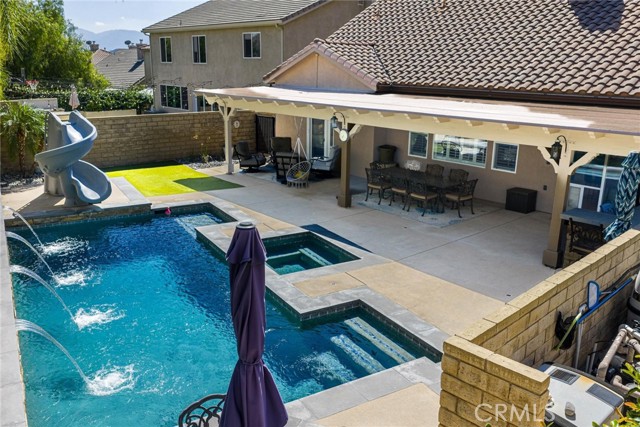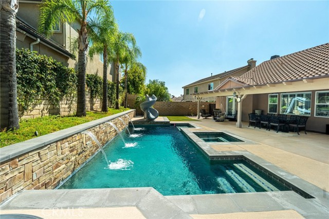 Can’t find a large single story? This popular floorplan has the primary suite PLUS two more bedrooms downstairs! Full bedroom and bathroom upstairs plus a spacious loft. Terric versatility and rarely for sale. This absolutely gorgeous pool home is located at the end of the cul-de-sac. The kitchen is breathtaking. It was remodeled in 2024 with outstanding meticulous finishes. Greige custom cabinetry with 4 ft doors, black hardware, all soft close drawers, island with built-in microwave and pull-out cabinets, quartz countertops, ceramic 3x12 horizontal backsplash and Café appliances. Custom pantry with pull-out drawers. Laminate “white oak” looking floors throughout with 6-inch baseboards. Family room fireplace was redone with new custom doors and tiled fireplace. The primary suite bathroom was also remodeled in 2024 with a custom dual vanity, quartz countertops and a beautiful walk-in shower featuring hexagon white tile flooring and 3x12 tile walls. Primary suite added French doors off the back leading to the covered patio. The other two bedrooms downstairs are also good-sized and share another bathroom which has been remodeled with a custom vanity, mirror and lighting. Linen closet has been added for additional storage right outside the bathroom. Formal living room has a fireplace with custom doors, newer mantel and trendy sconces. Upstairs loft is large and would make a great game room or second family room. Bedroom upstairs is currently set up as an office but has a closet which makes it the 4th bedroom in the house. Entertainers’ backyard! Outdoor island with BBQ, covered patio, pool and spa, and turf! Extra-long and wide driveway with a 3-car garage. No Mello Roos. This home is a 10!!
