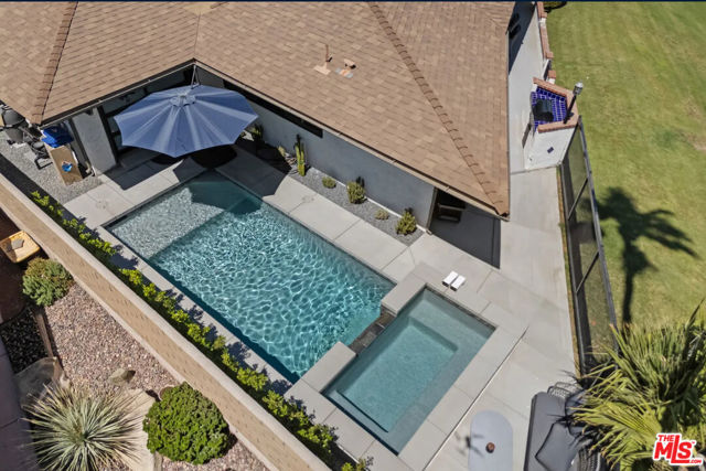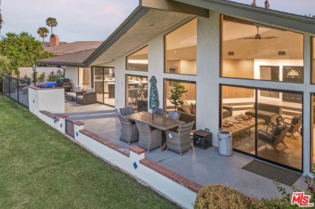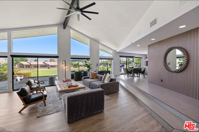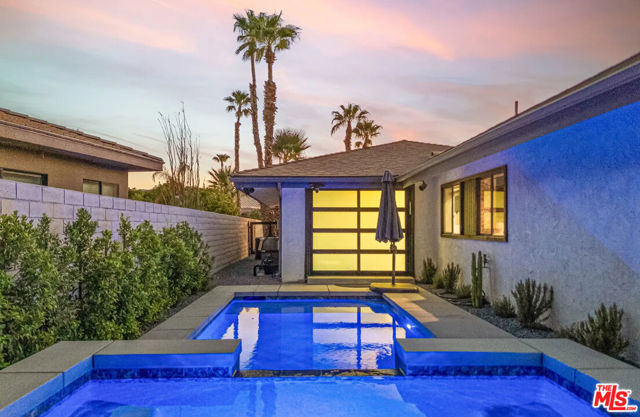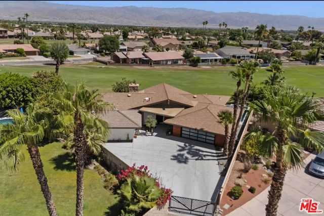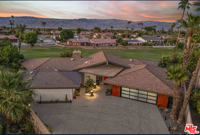 Mid-century modern masterpiece by renowned architect Carl Cox, custom-built in 1978 and thoughtfully remodeled with over $150k in upgrades. Perched on the 11th hole of Big Rock Golf Course, this home captures sweeping views of the greens and Chocolate Mountains, all with no HOA. The main residence features a dramatic sunken living room with cathedral ceilings, floor-to-ceiling windows, and an updated fireplace. A sleek modern kitchen with black cabinetry opens to an entertainer's patio with a built-in BBQ island. The primary suite offers a Japanese soaking tub and a private "air-drying" patio for spa-like relaxation. A detached casita provides flexible space for rental income, guest quarters, or a private office. Additional highlights include custom fireplaces, a wine fridge, a new pool and spa (2024), and contemporary design throughout. Currently operating as a successful short-term rental with AvantStay, this property offers both luxury living and strong investment potential. Ideally located near premier dining, shopping, and desert festivals, don't miss this one-of-a-kind La Quinta gem.