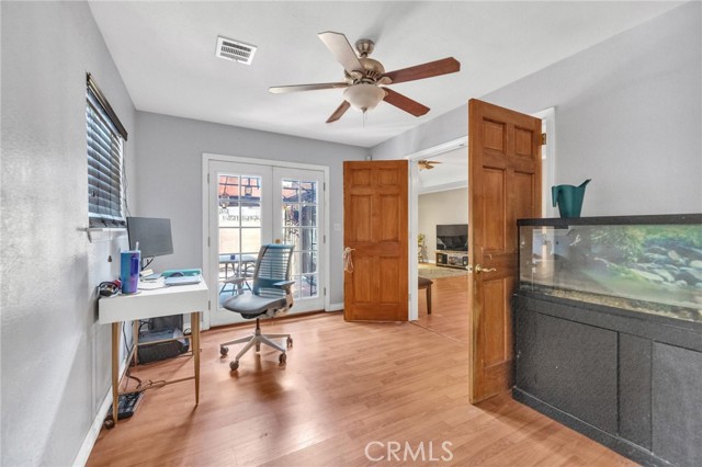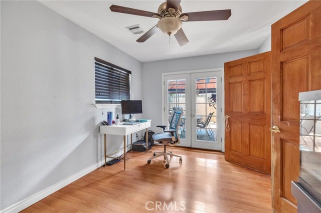 Step into this charming home through a welcoming foyer that leads directly to a spacious den with recessed ceiling, lighting, ceiling fan, and French doors opening to the patio. Off the foyer, the kitchen features granite countertops, a cozy dining nook, large backyard-facing window, indoor laundry, and exterior access. The den flows into a formal dining room, which connects to a private office with double doors and its own patio entrance. The secluded master suite offers backyard access for added privacy. Two additional bedrooms with ceiling fans share a hallway bath with a tiled tub/shower. A detached garage and brand-new roof complete this move-in ready home, thoughtfully designed for comfort and easy living.