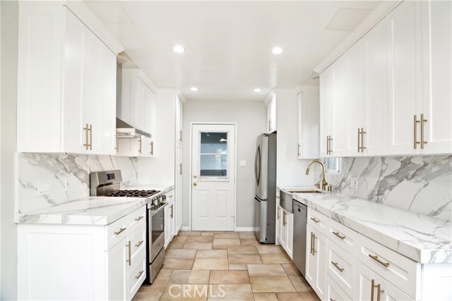 All remodeled 4 bedrooms, 4 bath home in North Downey! Fully remodeled kitchen with new counters, cabinets and stainless steel appliances. Three of the bedrooms have their own en-suite bathroom — all 4 bathrooms are tastefully remodeled. The home has a large living room with fireplace amd spacious dining area in the kitchen. Other features include newer windows, central air and heat, ceiling fans and recessed lighting. The backyard has a covered patio and built in barbecue. Located walking distance to Gallatin Elementary and near the 5 & 605 freeways.