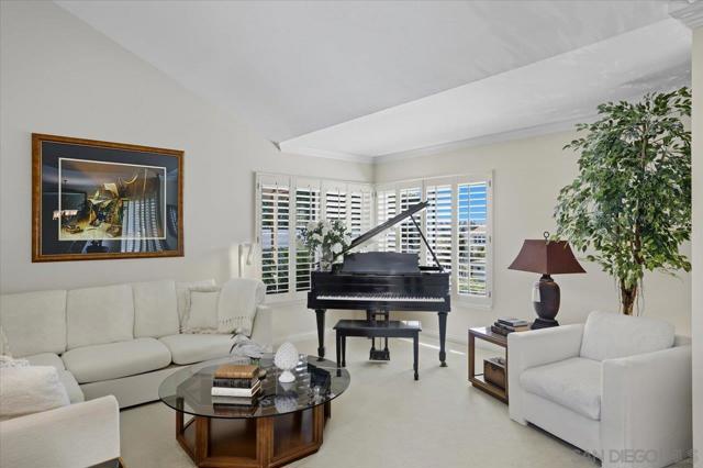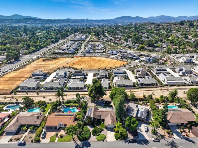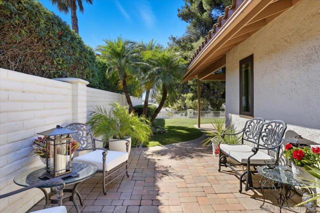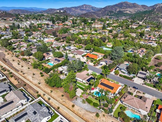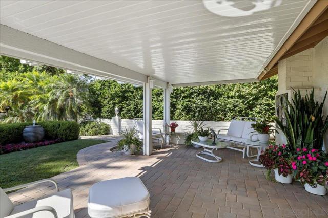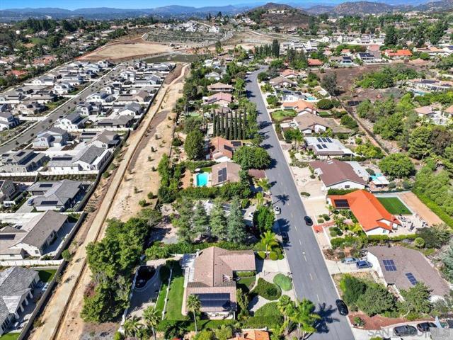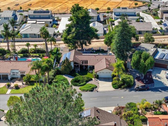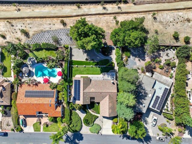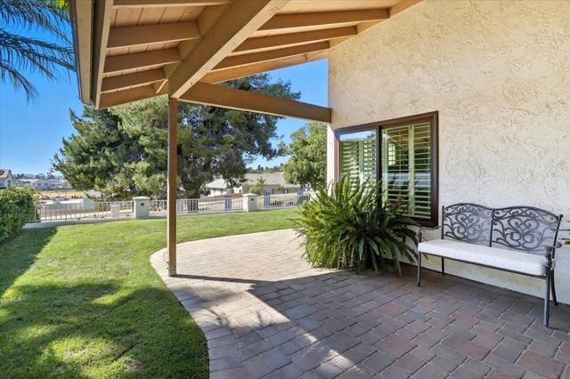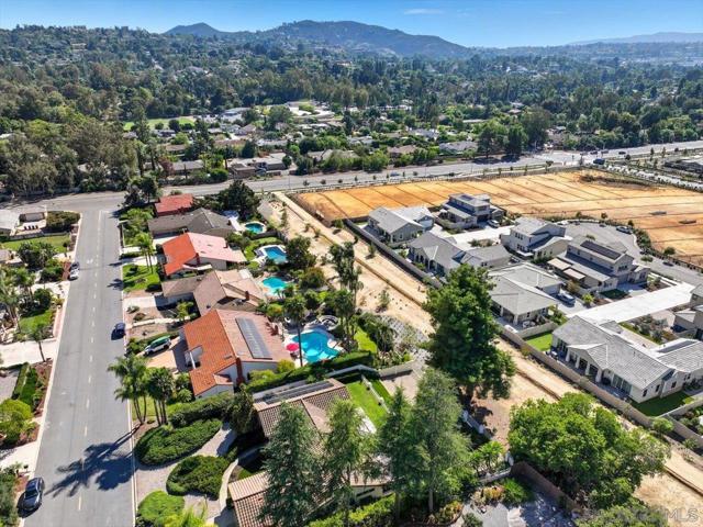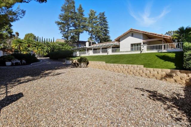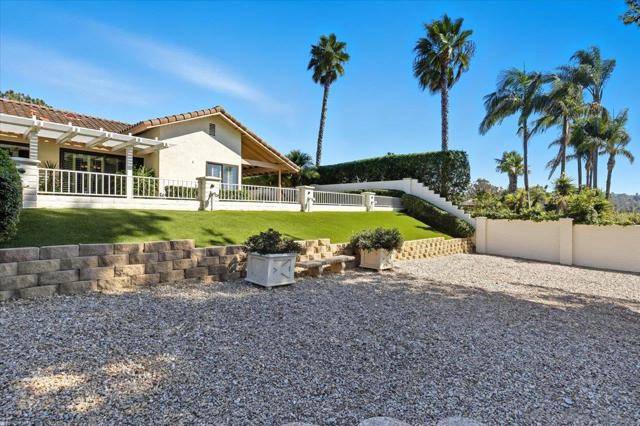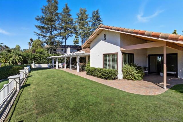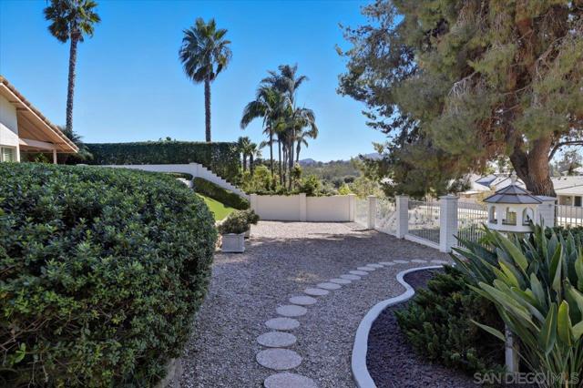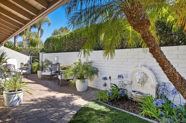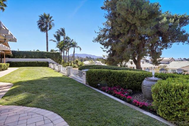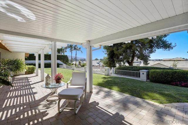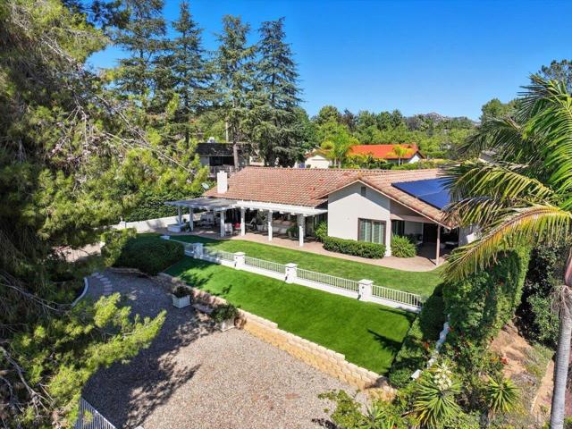 Welcome to this beautifully maintained, single-story home nestled in the wonderful StoneRidge neighborhood of North Poway. With its open floor plan, vaulted ceilings, and serene neutral palette throughout, this residence offers a perfect blend of comfort, style, and functionality. Abundant natural light floods every room, enhancing the warm and inviting atmosphere. Enjoy stunning mountain views from multiple vantage points and relax or entertain in two gorgeous patio areas, complete with designer pavers, elegant fountains, and custom uplighting. The main patio features a sleek Alumawood cover, providing shade and year-round enjoyment. Step into the welcoming front courtyard, then explore a thoughtfully designed interior featuring double-pane windows and sliding doors, leased solar panels for energy efficiency, and a spacious two-car garage with a built-in workshop area. The large primary suite includes sliding doors to the back patio, and spacious bathroom with a double vanity and walk-in shower. The two secondary bedrooms are situated on the opposite side of the home for added privacy. One serves as a perfect guest room near a full bathroom with a tub/shower combo, while the other is enhanced with built-ins, ideal for a home office or flexible third bedroom. (See Supplement!) The family room features a cozy gas/wood-burning fireplace, a charming breakfast nook adjacent to the kitchen, and sliding doors leading to the beautifully landscaped backyard. Outdoors, you'll find a lush lawn, mature trees, and pristine landscaping. A winding pathway guides you to an expansive open area and a private gate that provides access to the phenomenal trail system in the adjacent The Farms development. This exceptional home offers a lifestyle of relaxed elegance, perfect for both everyday living and stylish entertaining.