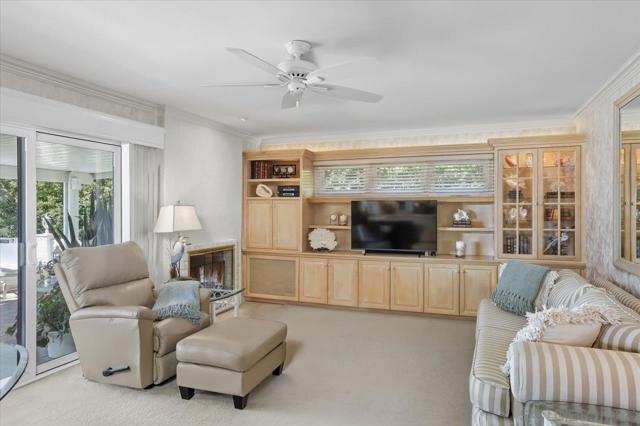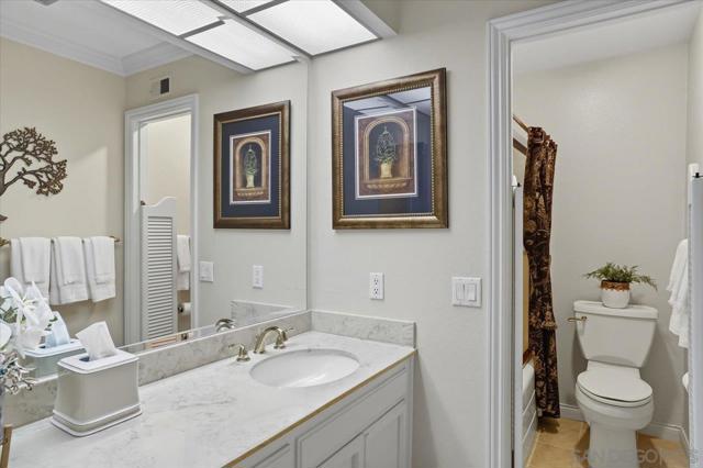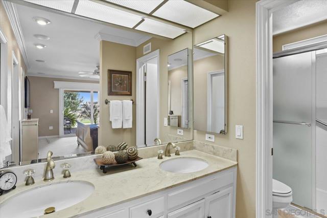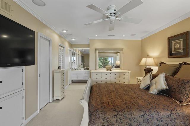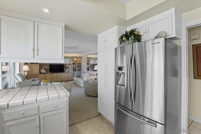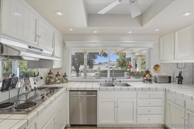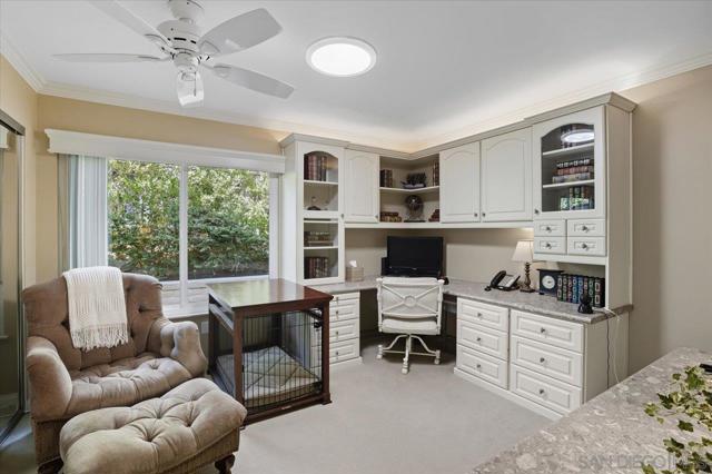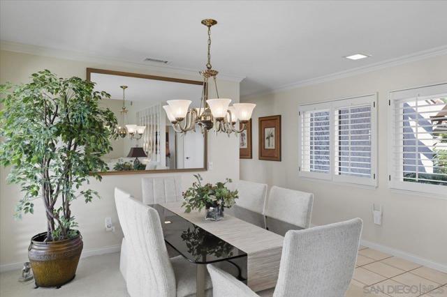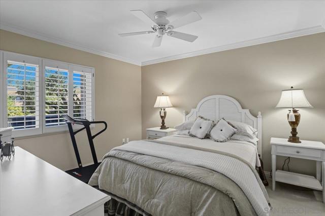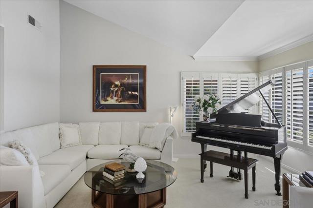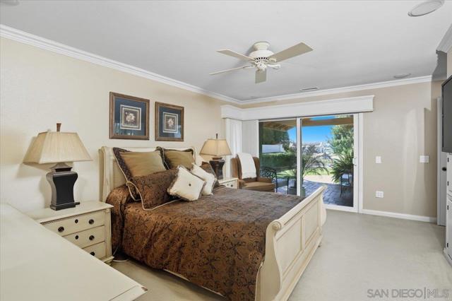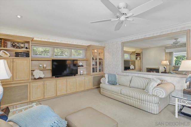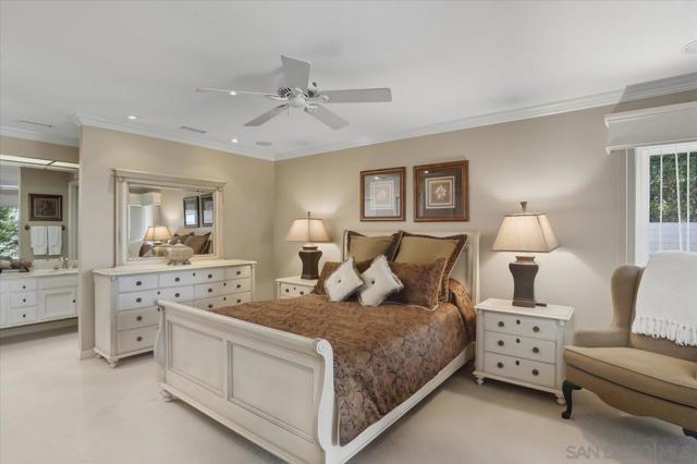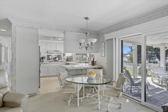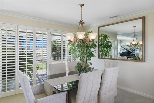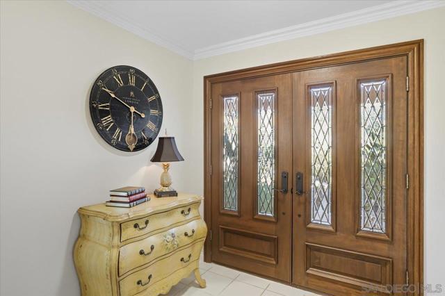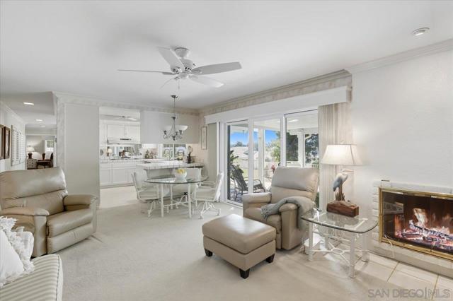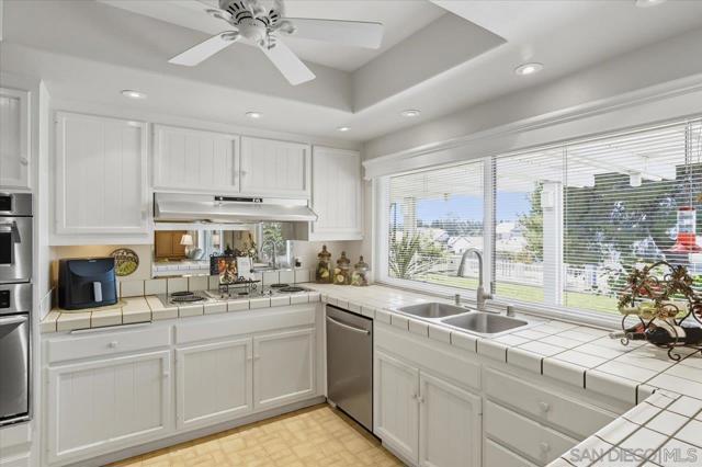 Welcome to this beautifully maintained, single-story home nestled in the wonderful StoneRidge neighborhood of North Poway. With its open floor plan, vaulted ceilings, and serene neutral palette throughout, this residence offers a perfect blend of comfort, style, and functionality. Abundant natural light floods every room, enhancing the warm and inviting atmosphere. Enjoy stunning mountain views from multiple vantage points and relax or entertain in two gorgeous patio areas, complete with designer pavers, elegant fountains, and custom uplighting. The main patio features a sleek Alumawood cover, providing shade and year-round enjoyment. Step into the welcoming front courtyard, then explore a thoughtfully designed interior featuring double-pane windows and sliding doors, leased solar panels for energy efficiency, and a spacious two-car garage with a built-in workshop area. The large primary suite includes sliding doors to the back patio, and spacious bathroom with a double vanity and walk-in shower. The two secondary bedrooms are situated on the opposite side of the home for added privacy. One serves as a perfect guest room near a full bathroom with a tub/shower combo, while the other is enhanced with built-ins, ideal for a home office or flexible third bedroom. (See Supplement!) The family room features a cozy gas/wood-burning fireplace, a charming breakfast nook adjacent to the kitchen, and sliding doors leading to the beautifully landscaped backyard. Outdoors, you'll find a lush lawn, mature trees, and pristine landscaping. A winding pathway guides you to an expansive open area and a private gate that provides access to the phenomenal trail system in the adjacent The Farms development. This exceptional home offers a lifestyle of relaxed elegance, perfect for both everyday living and stylish entertaining.