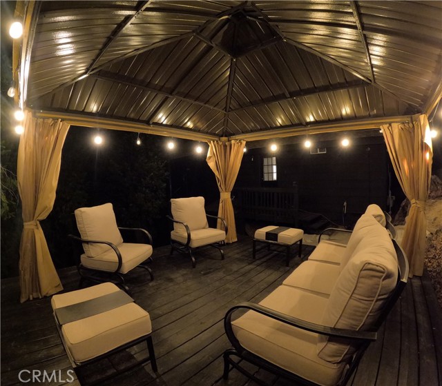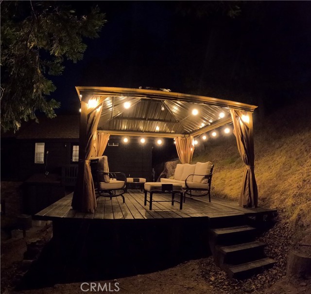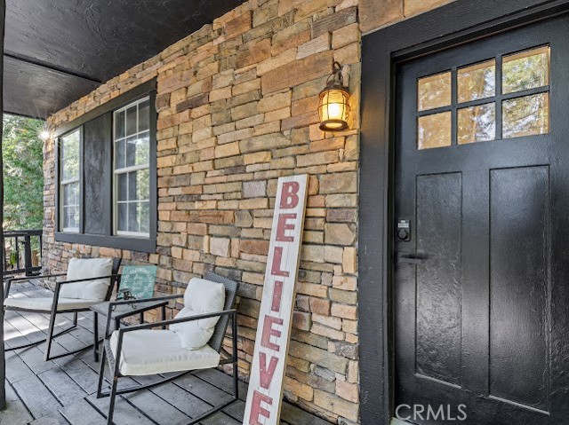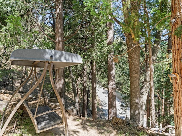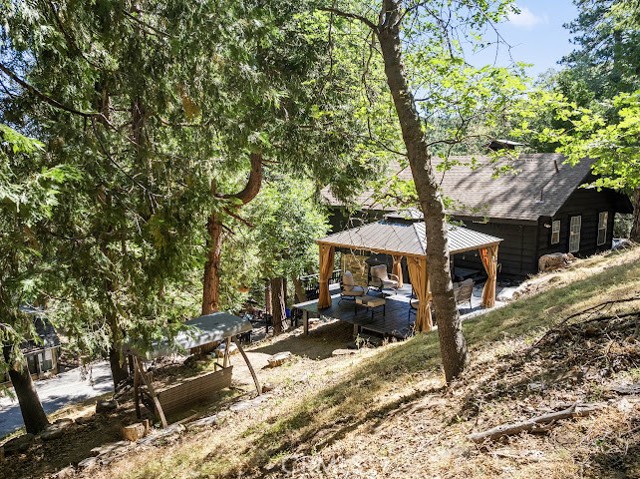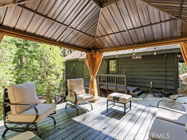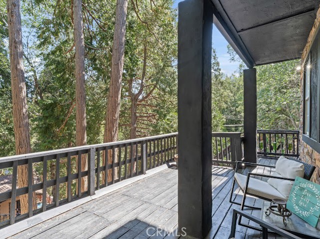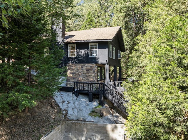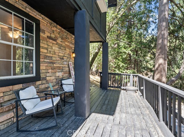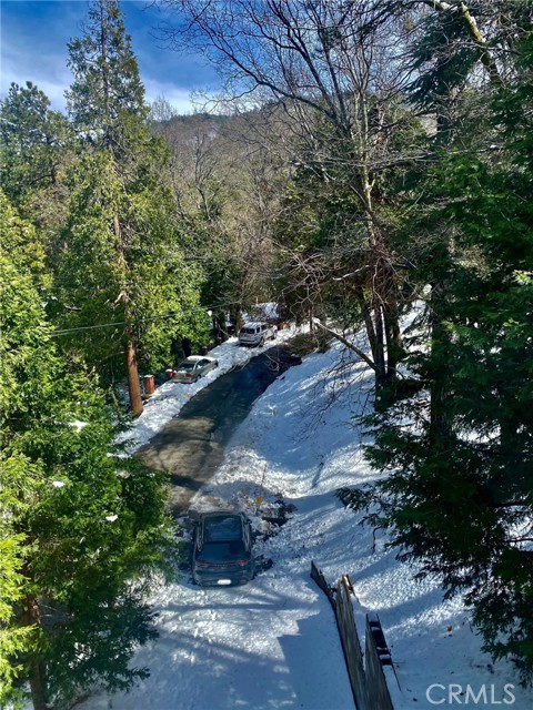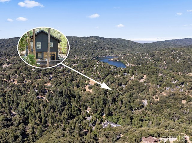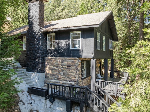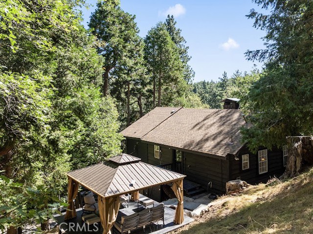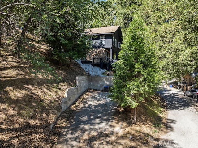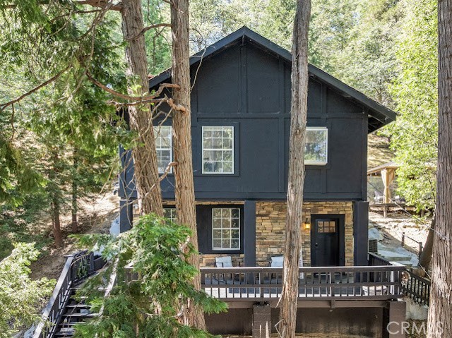 Just three minutes from Lake Gregory, this black cabin rests quietly among tall pines and forest canopy—a peaceful two-bedroom, two-bath retreat on nearly half an acre. Each season brings its own magic: golden leaves whispering in the fall breeze, fresh snow transforming the land into a winter wonderland, and the first rains awakening the scent of pine and earth. Deer visit the back field to rest, as if they too feel the calm that lives here. A newly built gazebo offers the perfect space to gather and reconnect, while the spacious front deck—sheltered from the sun—is ideal for morning coffee or soft evening conversations. This home has been lovingly cared for, and it’s ready for its next chapter—with someone who will feel just as at home in its stillness as the current owners did. Property boast tranquility with amazing forrest views. Large front wood deck perfect for relaxing, was recently re-enforced. Mountain living at is best! Lake during the summer and snow in the winter. 1st level offers a large bedroom with ship lap wood accent wall, and a step down level perfect for a seating area/retreat. Can also be used as a home office. The upstairs level welcomes you with an updated staircase featuring spanish style accent tiles. The living room comes with a cozy white washed stone fireplace, perfect for those snowy nights. Freshly painted walls, wood decorative shiplap ceilings and terra cota tile floors through out. Off of the living room is the kitchen, open to the dining room area with a built-in curio. Upgraded kitchen with quartz counter tops, spanish & subway backsplash and farmhouse style sink overlooking the garden window. Kitchen also offers a pantry for lots of storage and will include the stove. The primary suite is also located on this level with two separate closets, and attached bath. Second hall guest bathroom with laundry area. Beautiful chandeliers & ceiling fans through out. Home also has a central HVAC system. Modern dual pane windows as well. Rear yard has a custom wood deck with a canopy for additional seating to enjoy the views. Beautiful curb appeal with two separate staircase entrance, stone accent. Exterior of the home was also painted 2 years ago. Property is in the San Moritz community close to Lake Gregory. And a short 15 min drive to lake arrowhead, or 20 minute drive back down to the city. NO HOA's & low property taxes.