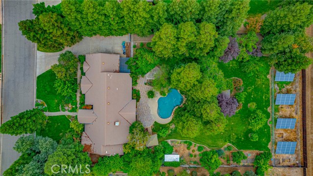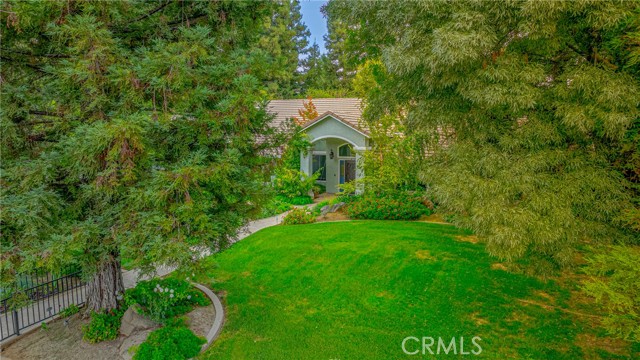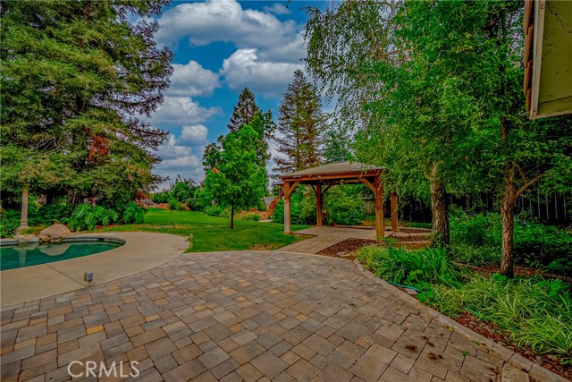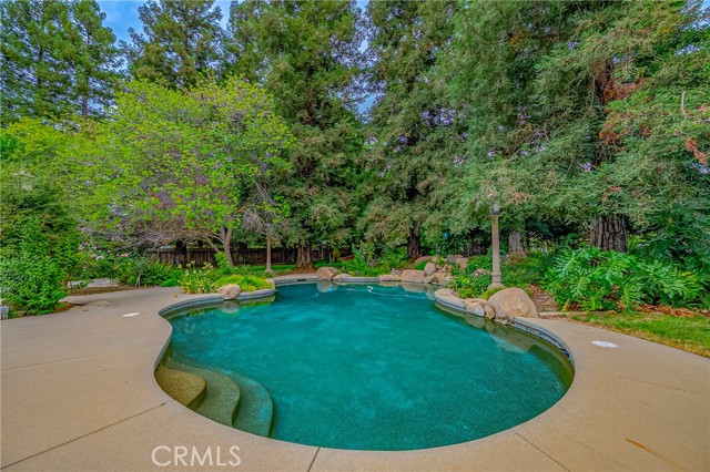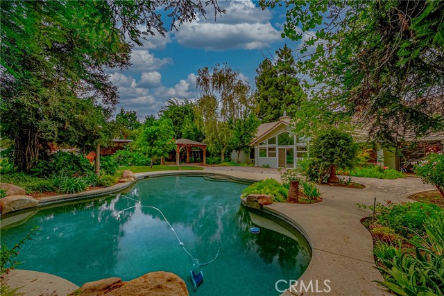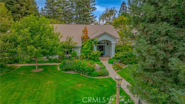 Welcome to your dream home in the highly sought-after Whispering Creek neighborhood of North Merced! This elegant 4-bedroom, 3-bathroom residence offers 3,264 sq ft of luxurious living space on a beautifully landscaped 1-acre lot, combining privacy, comfort, and style in one exceptional package. From the moment you arrive, you'll be captivated by the lush front yard, featuring mature landscaping and towering redwood trees that create a peaceful, secluded atmosphere. Inside, the entryway opens to a spacious family room with cathedral ceilings, a cozy gas fireplace, wet bar, and an open floor plan. The home is ready for your personal touch with concrete floors in various rooms, offering a blank canvas to install the flooring of your choice—whether it's hardwood, luxury vinyl, or custom tile. The gourmet kitchen is a chef’s delight, equipped with Thermador double ovens and 5-burner gas cooktop, center island, and a casual eat-in dining area that flows seamlessly into the family room—perfect for entertaining. Retreat to the expansive primary suite, offering enough room for a sitting area, office, or workout space. The en-suite bathroom features double sinks, a vanity area, separate tub and shower, walk-in closet, and private access to the backyard. Additional highlights include: a formal dining room, versatile sun porch, laundry room with sink and ample storage, sparkling in-ground pool, covered patio, gazebo, and storage shed and leased solar paid through September 2034. Enjoy the peace of country-style living just minutes from town, with quick access to shopping, schools, parks, and Campus Parkway. Don’t miss this rare opportunity to own a slice of tranquility in one of Merced’s most desirable neighborhoods.