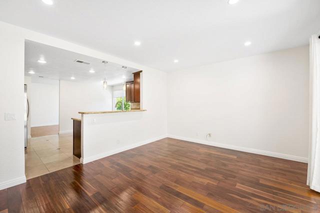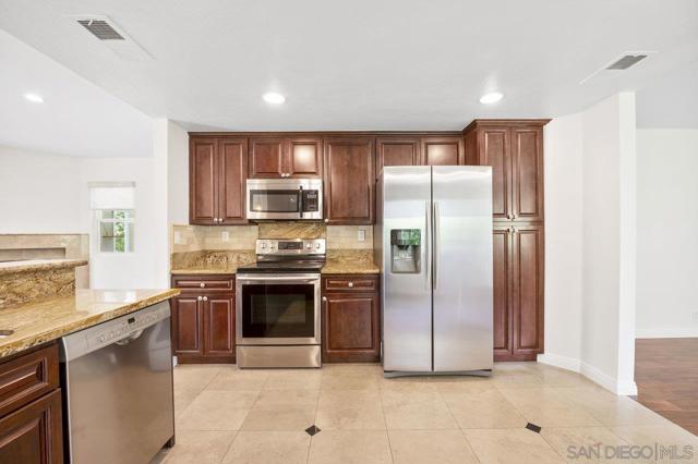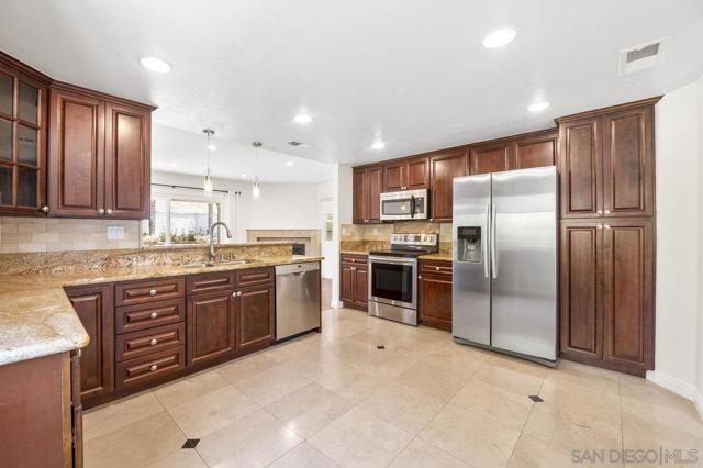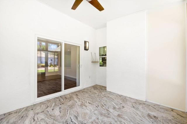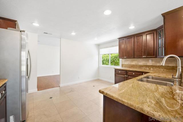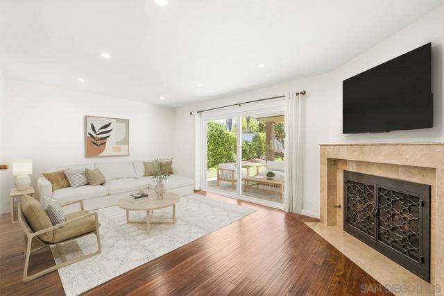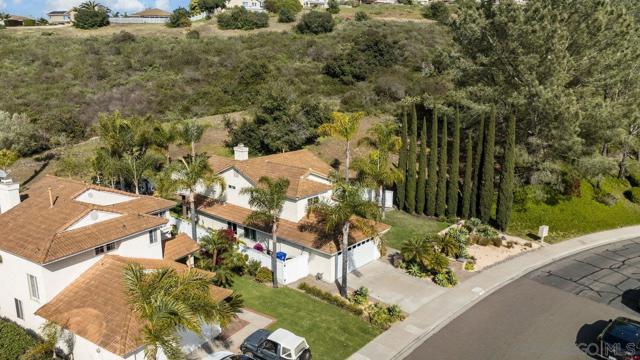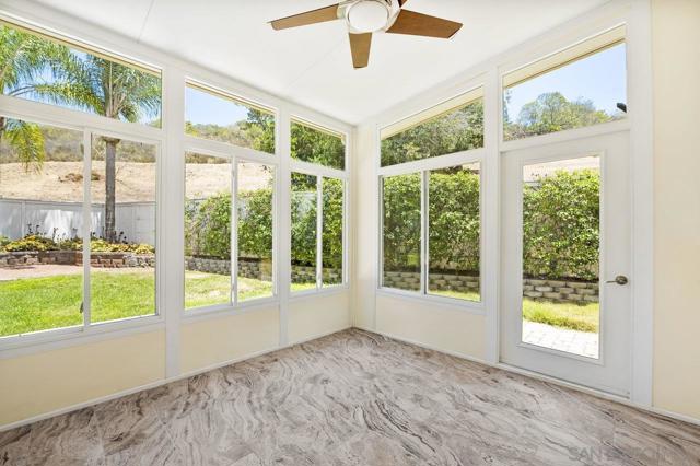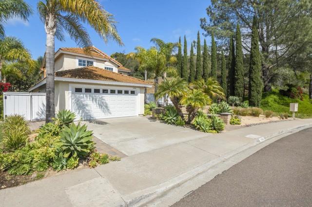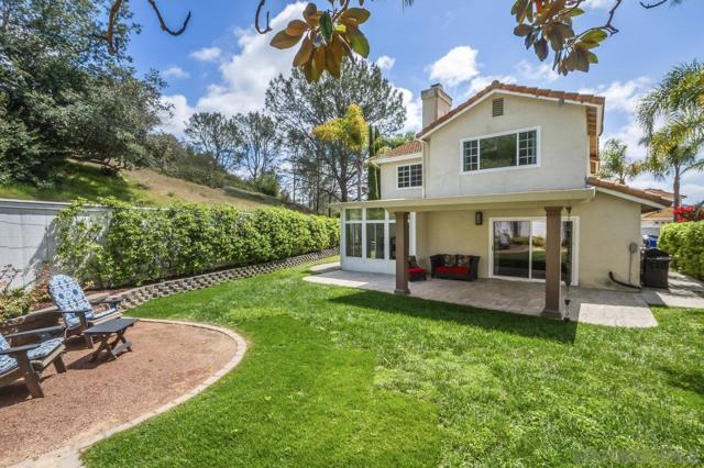 Move-in-ready home nestled on a peaceful street with no neighbor on one side and open space stretching behind the property for added privacy and scenic views. ENTIRE interior painted in designer, neutral tones. Inviting exterior makes a strong first impression, with thoughtfully crafted paver pathways guiding you to the front entrance and continuing to the backyard. Smart, keyless front door welcomes you inside with a layout ideal for contemporary living. Open-concept kitchen seamlessly connects to the family room, with gas fireplace creating a warm and comfortable space. Separate formal living and dining rooms offer additional entertaining settings while a light-filled sunroom provides a flexible space perfect for a home gym, playroom, or creative retreat. Interior features include granite countertops and tile flooring in the kitchen and bathrooms, rich wood flooring on the main level, energy-efficient double-pane windows and sliding doors, and central air conditioning. Attached 2 car garage features epoxy flooring, built-in storage, and an app-enabled garage door opener for added convenience. Professionally landscaped backyard oasis comes with drought-tolerant plantings, UC Verde grass, and jasmine-lined fencing. Covered patio with recessed lighting and multiple lounge areas creates an ideal space for relaxing or hosting guests. Nature lovers will appreciate direct access to hiking and biking trails at Black Mountain Open Space Reserve, as well as the nearby pond behind the neighborhood. Community amenities include a pool, spa, clubhouse, tennis and basketball courts and a playground. Located within the highly desirable Poway Unified School District with no Mello Roos, this home offers the perfect balance of comfort, functionality, and lifestyle. Some photos are virtually staged.