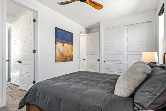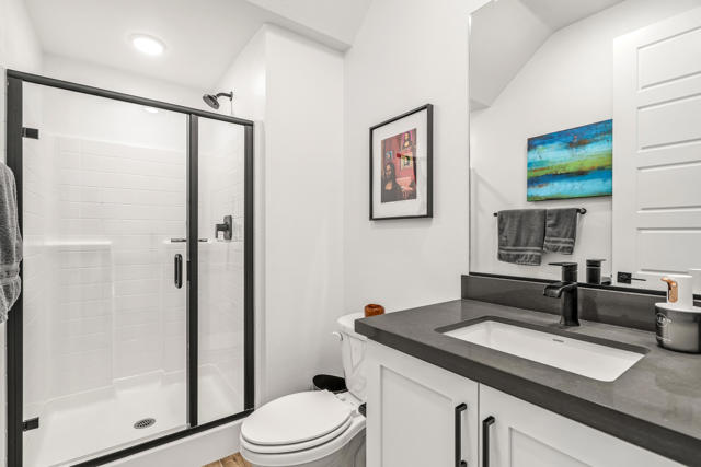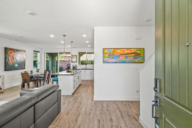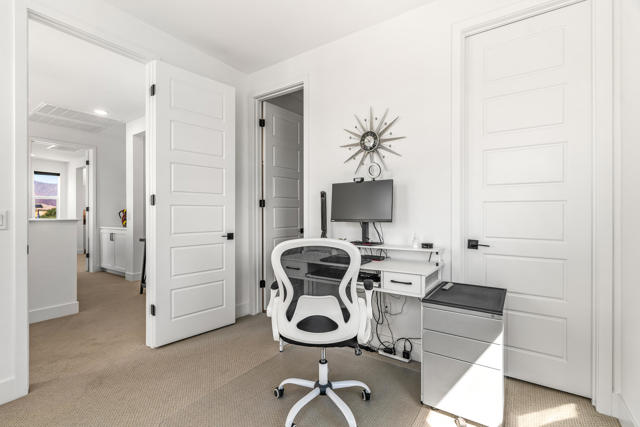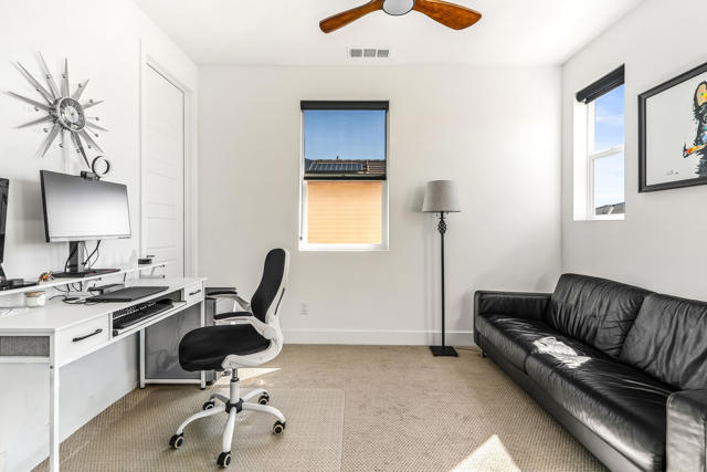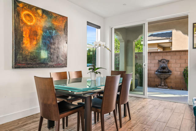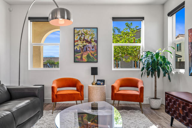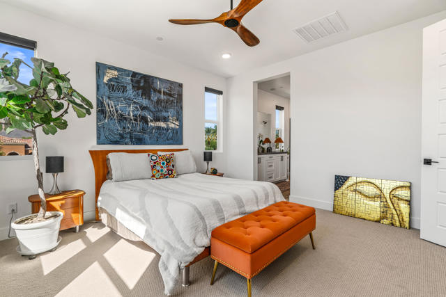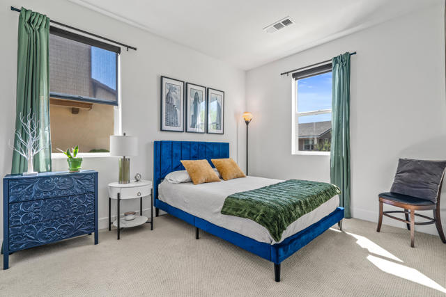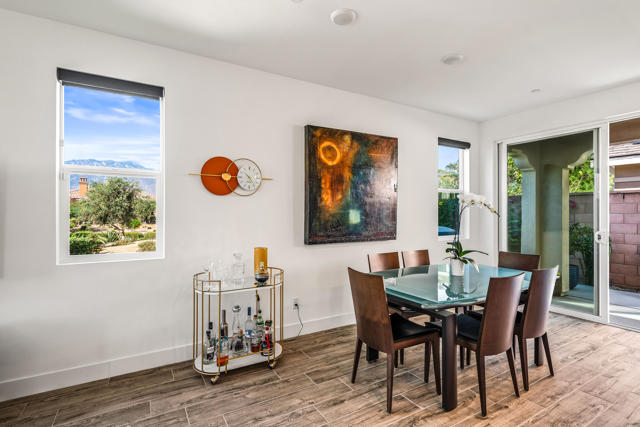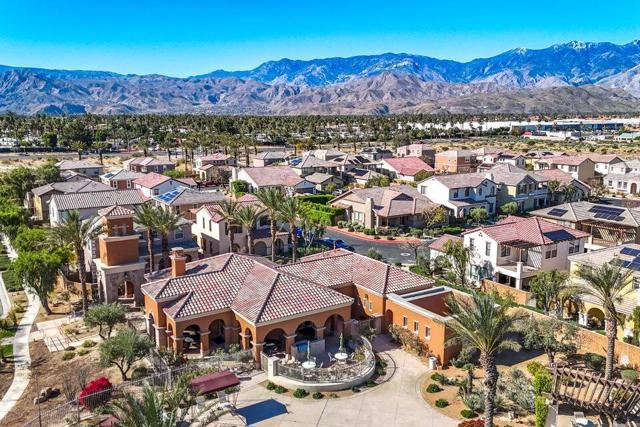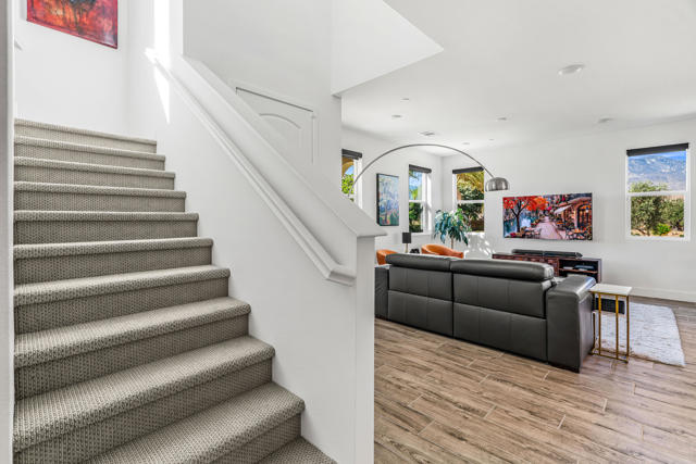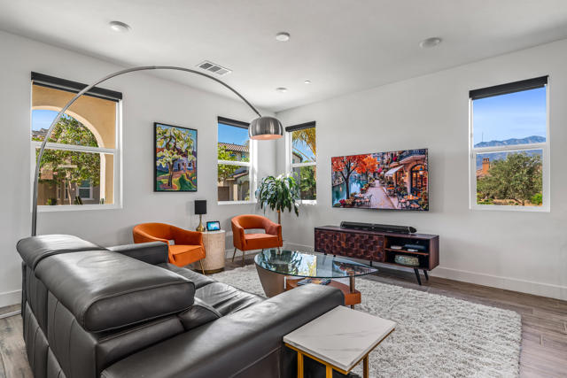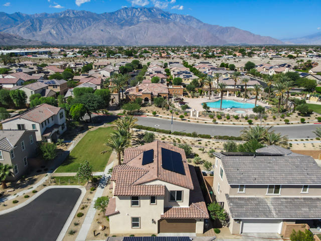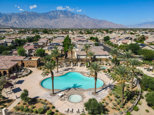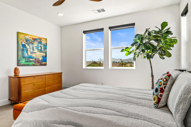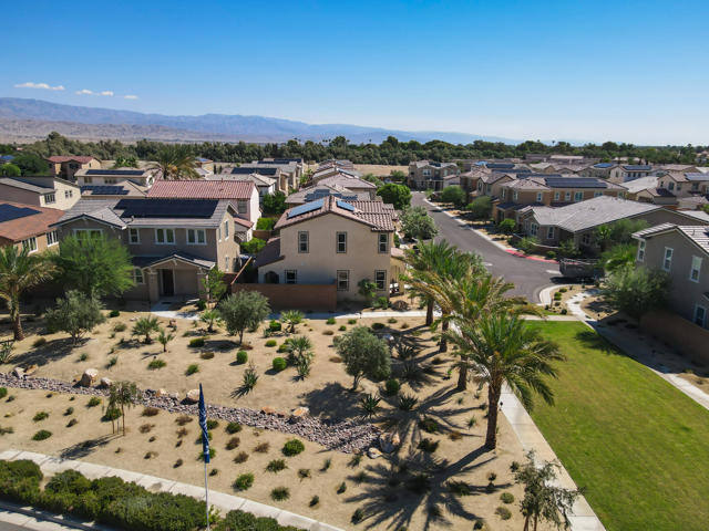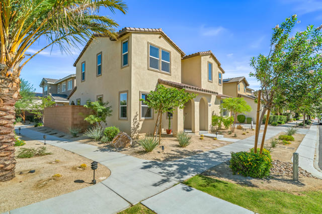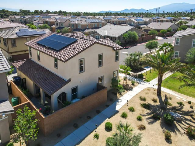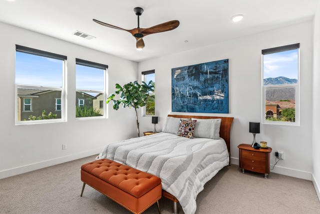 A beautifully styled home, offered at an amazing value, located in the desirable gated community of Campanile: conveniently located near shopping, dining, schools, and just minutes from downtown Palm Springs and its airport. This highly upgraded and energy efficient detached home built in 2023 is situated on a premium lot and features 4 bedrooms with 3 baths with nearly 2,000 sq ft of living space on two levels, with spectacular panoramic mountain vistas from most rooms. Pride of ownership is evident throughout this meticulously maintained home which stills feels brand new. On the ground floor, a covered porch leads to an entryway with stairs to the upper floor and access to the main living area boasting an open-concept layout, high ceilings, porcelain tile floors, multiple windows which provides beautiful natural light, a kitchen with modern shaker style cabinetry, a large island with quartz slab countertop & stainless-steel appliances perfect for hosting family and entertaining guests. The main floor offers a 4th bedroom and bath with extra privacy for guests, or could function as a primary bedroom if preferred, or home office.Upstairs, you will find a large primary suite with a generous walk-in closet & a spa-like en-suite bathroom with dual sinks & tiled walk-in shower, two secondary bedrooms (one with a walk-in closet) which share a Jack and Jill bathroom, with a combination tub/shower along with a spacious laundry room with storage. The current owners spent over $17,000 on interior and exterior upgrades beyond the builder's upgrades, such as custom window treatment in all rooms (power and manual), designer light fixtures & fans, as well as hanging storage racks in the double attached garage. Outdoors awaits a low maintenance landscaped private yard with an enlarged concrete slab, pea gravel, pavers, irrigation system and gas hook up for the barbecue grill as well as an elegant and soothing Mediterranean design stone fountain. Enjoy additional peace of mind and big savings with many energy-efficient features throughout the home with all new systems including a fully paid and owned solar system ($21,000), a tank-less water heater and recessed lighting. Not convinced yet? Residents at Campanile enjoy resort-style amenities, including a community pool/ spa, clubhouse, fitness center, well-maintained green spaces & reasonable monthly HOA dues, which include cable & internet. Furnishings can be purchased outside of escrow. Call for a private viewing.