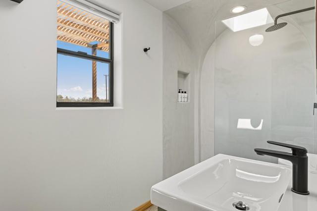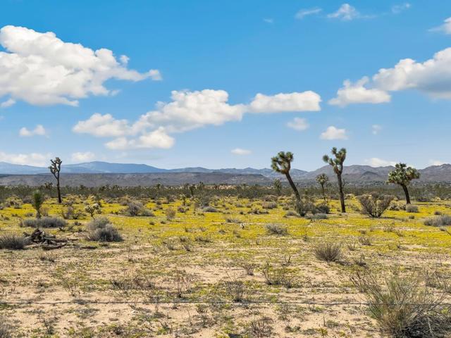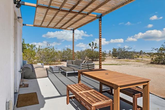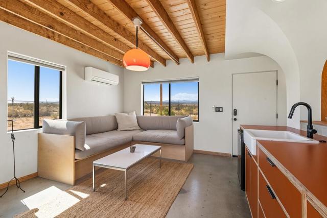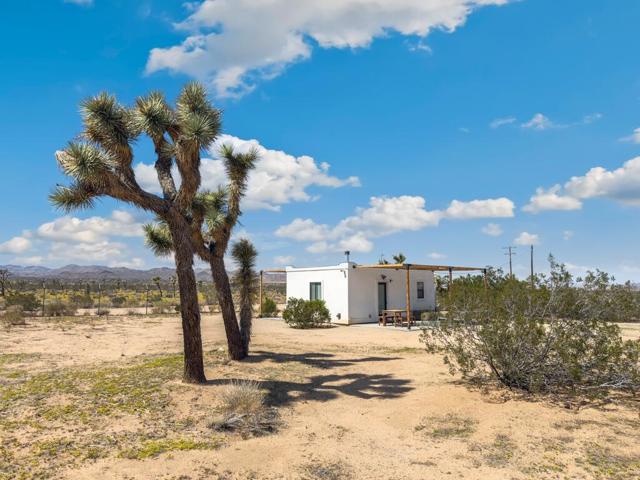Discover this stylish modernized Spanish-style desert retreat, perfectly set on a fully fenced and gated 5.5+ acre parcel offering privacy, serenity, and endless potential. Turnkey furnished, this home is ready to enjoy as a personal escape, weekend getaway, or investment opportunity. The interior showcases exposed wood beams and a rich wood ceiling, creating warmth and character that blend seamlessly with the desert surroundings. The open floorplan connects the living area and kitchen on one side, with the living room featuring a cozy wood stove and the kitchen highlighted by bold orange cabinetry, induction stove, and mini fridge. The bedroom area includes built-in wood shelving for storage and hanging space, offering both function and charm. The updated bathroom has a vibrant blue tiled shower and skylight. Go outside to a spacious patio for lounging and entertaining, where you can soak in the panoramic desert landscape and breathtaking views in every direction. With plenty of land for expansion or simply to enjoy the peace and quiet, this unique property offers a rare chance to own a private desert hideaway that combines style, comfort, and versatility.