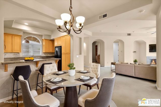 Welcome to Villa Portofino! Premier 55+ Living in Palm Desert! Step into luxury and ease with this beautifully designed 2-bedroom, 2-bathroom + den/office condominium, offering 1,559 sq. ft. of comfortable, single-level living - no stairs, no hassle! Perfectly situated on the first floor, this sought-after floor plan ensures effortless access, making it ideal for those with mobility concerns. From the moment you enter, you'll be greeted by an inviting open layout, high coffered ceilings, and abundant natural light streaming through charming glass-paneled windows. The spacious kitchen is a chef's delight, featuring maple cabinetry, slab granite countertops, and stainless steel and black appliances, a perfect blend of function and style. The primary suite is a true retreat with a sitting area, a large walk-in closet, and an en-suite bath boasting dual vanities, a separate soaking tub, and a walk-in travertine shower. The guest bedroom, located on the opposite side for privacy, also features a walk-in closet and a beautifully appointed bath. A versatile den/office with wet bar offers flexibility, ideal for a home workspace, hobby room, or additional guest accommodations. The private patio, framed by lush desert landscaping, provides a peaceful outdoor space for morning coffee or evening relaxation. Experience Resort-Style Living! Villa Portofino isn't just a place to live, it's a place to thrive! The community is designed for active adults who want the perfect balance of relaxation, social connection, and recreation. The 30,000 sq. ft. clubhouse is the heart of Villa Portofino, offering a state-of-the-art fitness center, yoga studio, resort-style pool & spa with poolside service, a game room, billiards, a cantina, a 100-seat private movie theater, and a vibrant social calendar filled with special events and activities. Whether you're looking to stay fit, make new friends, or just unwind, there's something for everyone. Looking to get involved? Join one of Villa Portofino's exclusive member clubs, where you can connect with like-minded neighbors through activities like Texas Hold 'Em, Bridge, Mahjong, Bunco, Canasta, Rummikub, knitting, book club, and more! Dine & Unwind at The Bistro! No need to go far for a delicious meal! The Bistro at Villa Portofino serves up chef-inspired seasonal favorites, from fresh salads to hearty sandwiches and signature entrees, all perfectly paired with refreshing cocktails or your favorite bottle of wine. Enjoy daily Happy Hour, a Saturday Bloody Mary Bar & Brunch, Pasta Nights, specialty holiday meals, and rotating chef specials, all just steps from your front door. Members receive a weekly newsletter with the latest dining events, ensuring you'll never miss out on a great meal or social gathering. Worry-Free, Low-Maintenance Living! Your HOA dues include: Cable TV & high-speed internet, Water & trash service, Exterior building & roof maintenance, "walls out" fire and earthquake Insurance, Window washing & landscaping, Full clubhouse access & amenities! Prime Palm Desert Location! Villa Portofino is minutes from top-rated dining, shopping, golf, entertainment, and the Eisenhower Medical Center, offering both convenience and peace of mind. This is more than a home, it's a lifestyle. Don't miss this rare opportunity! Schedule your private showing today and experience the best of Villa Portofino living!