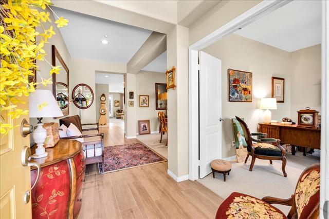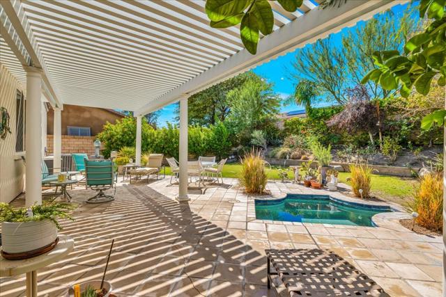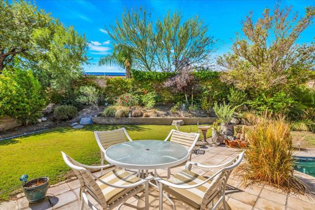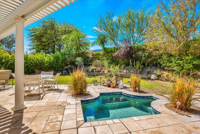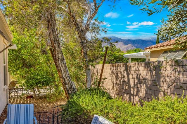 A beautiful Palm Springs home in the sought-after Four Seasons 55+ gated community. Situated on a cobblestone street originally lined with model homes, this neighborhood offers a distinctive character where no two homes are alike. The interior is light & airy with an open floor plan, perfect for everyday living. A formal dining room provides an elegant space for gatherings, and a flexible third bedroom/den offers options as an office or hobby room. The living room includes a gas fireplace, high ceilings and lots of light leading to the stunning rear grounds with built-in jacuzzi and mountain views. The kitchen is very spacious with a large center island and granite countertops throughout. The spacious primary suite features serene garden views, a large en-suite bath with step-in shower, double vanity, and large walk-in closet creating a private retreat. A private rear yard provides plenty of space for outdoor activities, gardening & more. Life at Four Seasons revolves around The Lodge, a beautiful clubhouse offering a vibrant calendar of activities, full-time staff, fitness & aerobics studios, a ballroom, game room, library, and more. Resort-style amenities include swimming pools, spas, tennis & pickleball courts, BBQ's & scenic walking trails. Low HOA's include Frontier fiber optic internet. Located just minutes from downtown Palm Springs, this home offers convenient access to fine dining, designer shopping, world-class entertainment and more. This residence is a refined retreat capturing the essence of the Palm Springs lifestyle, where beauty, comfort & community remain in perfect balance.
