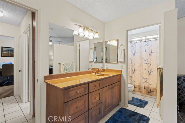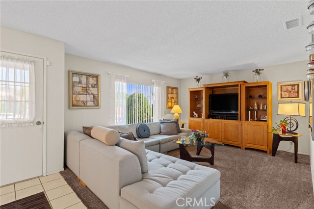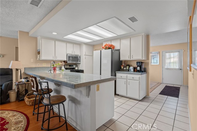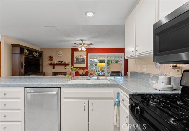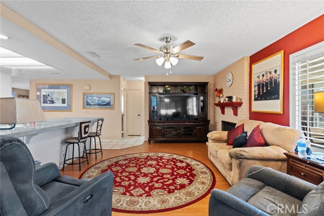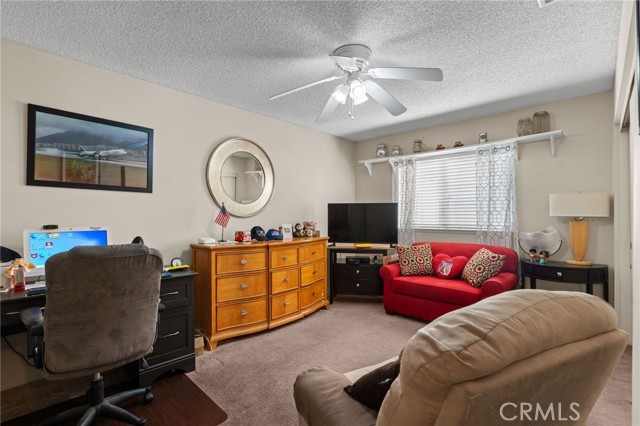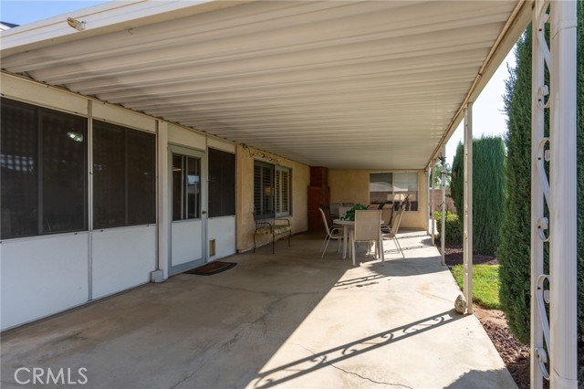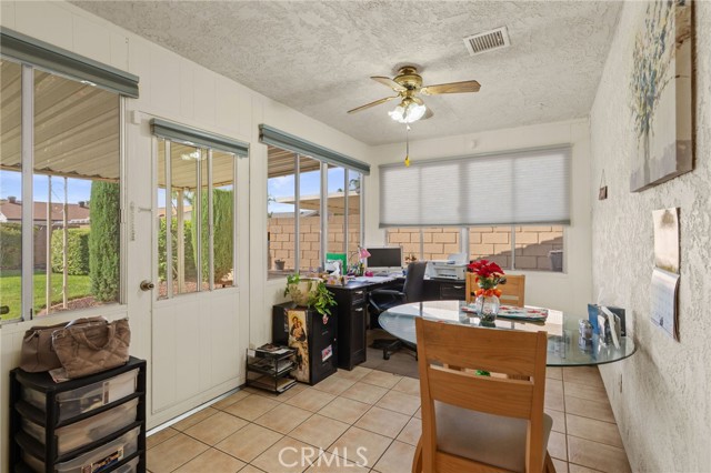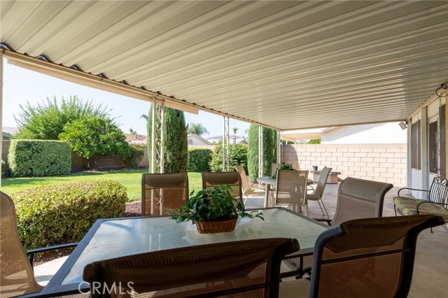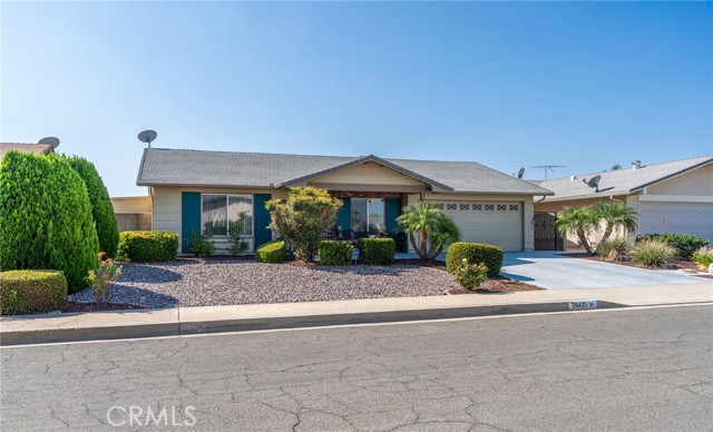 Wonderful 55+ senior home with No HOA and very low taxes in a quiet neighborhood away from the main busy roads in Menifee. Beautiful curb appeal and a covered front porch area perfect for sipping coffee and relaxing before heading into the spacious front living room and dining room. Walking into the kitchen there is a massive kitchen island with plenty of storage cabinets and a newer refrigerator and beautiful sightlines to the landscaped backyard. The kitchen is open to a secondary living room with a cozy fireplace which also leads to another enclosed lanai area that is currently being used as an office. There's a large guest room with a full bathroom with newer vanity and fixtures and the primary bedroom has it's own ensuite bathroom as well. There's multiple ceiling fans in almost every room and solar panels for energy efficiency! All the windows have window treatments and there's a landscaped backyard with fruit trees, covered patio, cinderblock fencing and a shed for convenience. The roof is about 17 years old and the AC unit is about 7 years old and all the appliances with stay for the buyer!