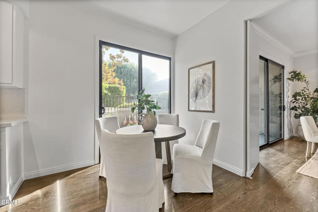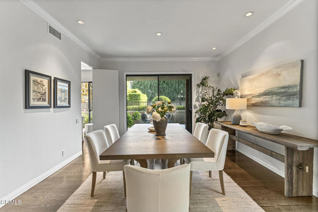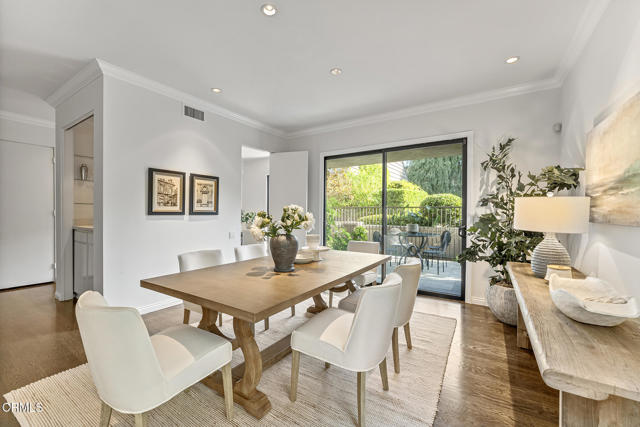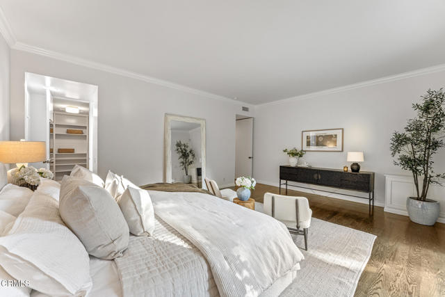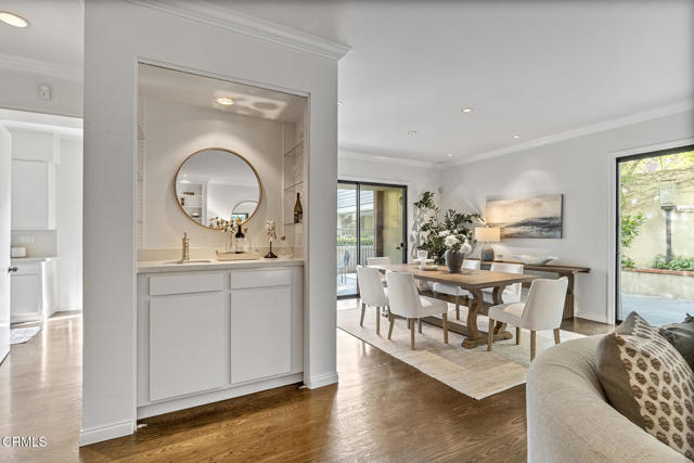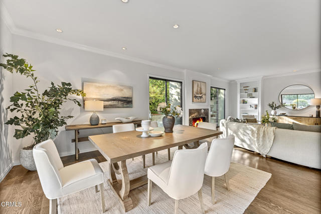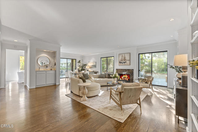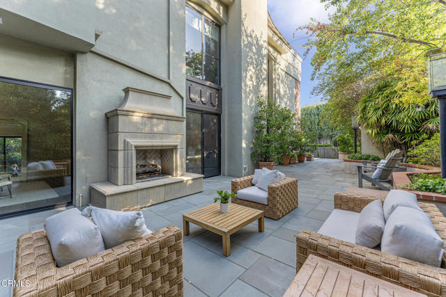 Situated in one of the most sought-after condominium communities along Pasadena's prestigious Millionaires' Row, this ground-floor residence is one of only 14 units in the complex. The home features soaring ceilings, an open floor plan, and expansive sliding glass doors that seamlessly connect the interior to an impressive wraparound patio of over 1,000 square feet. Designed for both relaxation and entertaining, the patio is enhanced with stone pavers, a lush green backdrop, abundant seating areas, and an outdoor fireplace, creating a private retreat ideal for entertaining or quiet relaxation. Inside, the spacious layout offers two generous bedroom suites plus a versatile den with custom floor-to-ceiling built-in shelves and cabinetry, perfect as a study, library, or optional third bedroom. Thoughtful details include hardwood floors, crown molding, plantation shutters, a living room fireplace, and extensive built-in bookshelves. Community amenities include a sparkling pool and spa conveniently located near the unit. Additional highlights are a gated garage with elevator access, assigned side-by-side parking, a large private storage closet in the garage, an exterior utility closet on the patio, and an in-unit laundry room. HOA fees include trash, common area maintenance, pool and spa, roof, water, and earthquake insurance.