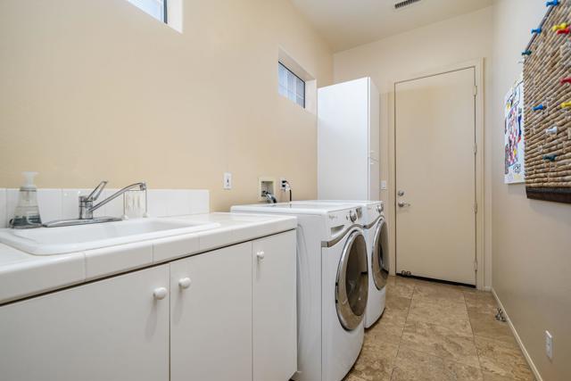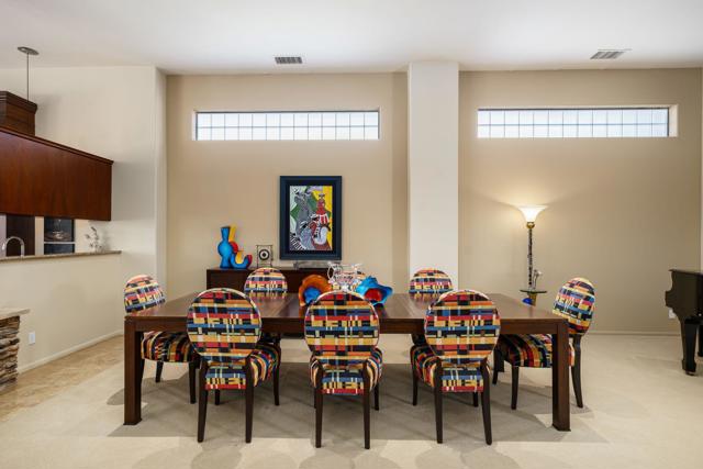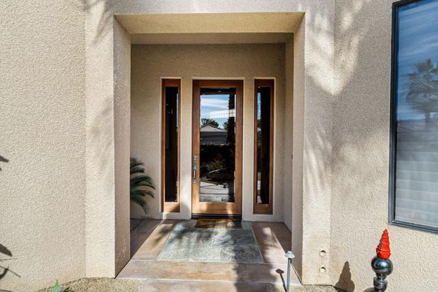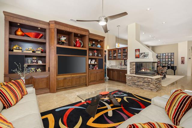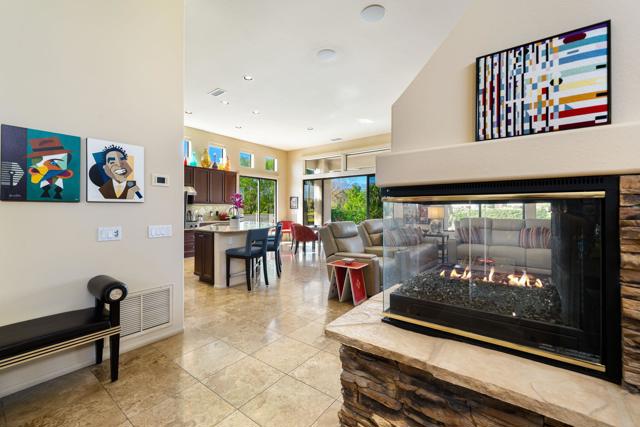Nestled on a premium west-facing lot on the 13th tee of the Pete Dye Course, this beautifully upgraded and meticulously maintained home offers breathtaking mountain views and resort-style living. Enjoy outdoor living at its finest with a Pebble Tec saltwater pool featuring a stacked stone spillway, elevated spa, fire pit, crystal lighting stones, and a chef's outdoor kitchen--all adjacent to a covered patio, perfect for entertaining. Inside, the gourmet kitchen boasts a Viking cooktop, Sub-Zero refrigerator, wine cooler, center island, and rich dark cherry cabinetry. A dramatic triple-sided glass fireplace separates the living and great rooms, which also feature a built-in entertainment center and high-tech sound system. Electric shades in the kitchen and great room make managing sunlight effortless. The spacious primary suite includes a cozy fireplace, walk-in closet, and spa-like bath with jacuzzi tub. A private guest suite offers its own outdoor patio and ensuite bath, while a third ensuite bedroom functions as a stylish office with built-in desk and workspace. Additional highlights include: Leased Solar, Tankless water heater, Full home water filtration system, low HOA that includes a social and fitness membership to Mission Hills. Call for your private showing today!