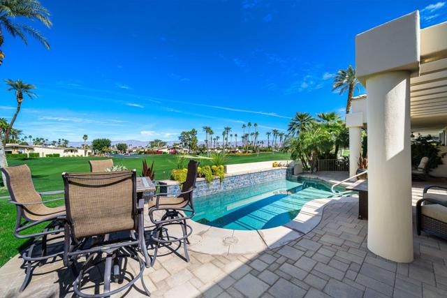 Discover the perfect desert retreat, a beautiful updated Pool Home showcasing stunning Fairway and Mountain Views. This popular Troon model features a spacious, bright open floor plan designed for easy living and entertaining. Meticulously upgraded with modern finishes--including new heat pumps, all-new Milgard windows and sliders, stylish lighting, automated blinds, and plush new carpeting to name a few--this home offers comfort and elegance. The well-thought-out layout includes a formal Living Room with a striking slate Fireplace, a Dining Area, and a cozy Family Room with a Wet Bar and Wine Frig. The Chef's Kitchen boasts a large butcher block Island, custom Cabinetry, Quartz Counters, and Stainless Steel Appliances, all looking out to the picturesque Views. The Primary Suite provides a private sanctuary, a walk-in closet, a Spa tub, and a walk-in Shower. The spacious 2nd Suite features an en-suite bath, and walk-in closet. The versatile 3rd Guest Room includes a Murphy bed and office desk, perfect for Guests or working from home. Step outside to the expansive entertaining Patio with a Private Pool. Additional highlights include a leased solar system, upgraded insulation for energy efficiency, and a spacious 3 car air-conditioned garage complete the home. Imagine cocktails on the Patio as you marvel over the captivating Mountain Vistas, the 8th Fairway and Green- your picture-perfect lifestyle at this premiere Indian Wells location. Offered partially furnished.
