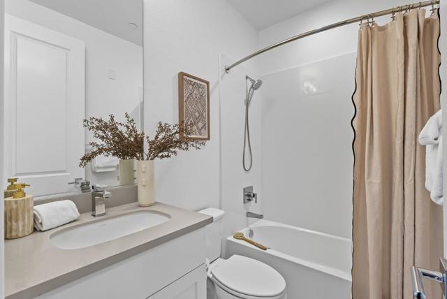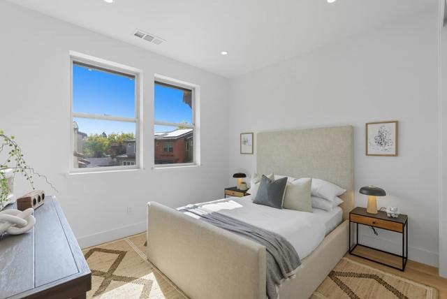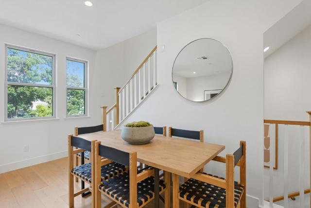 Built in 2022, this modern Mountain View townhome offers 3 bedrooms, 3 bathrooms, and 1,471 sq. ft. of thoughtfully designed living. Natural light fills the open-concept main level, where a sleek kitchen with quartz countertops, stainless steel appliances, and ample cabinet space flows seamlessly into the dining and living areas. Wide-plank engineered hardwood floors extend throughout the home, creating a sophisticated backdrop. The flexible floor plan includes a main floor bedroom with a full bath, ideal for guests or a private office. Upstairs, two bedrooms provide comfort and privacy, along with the convenience of indoor laundry. Designed for comfort and efficiency, the home features triple-pane windows, a north-facing orientation for added brightness and privacy with no direct neighbors on one side, and fully paid solar panels. Close to major tech campuses, top-rated schools, shopping, dining, and parks, this home captures the essence of Silicon Valley living.