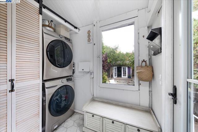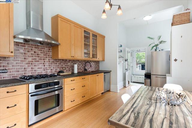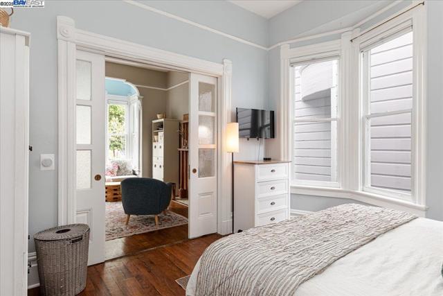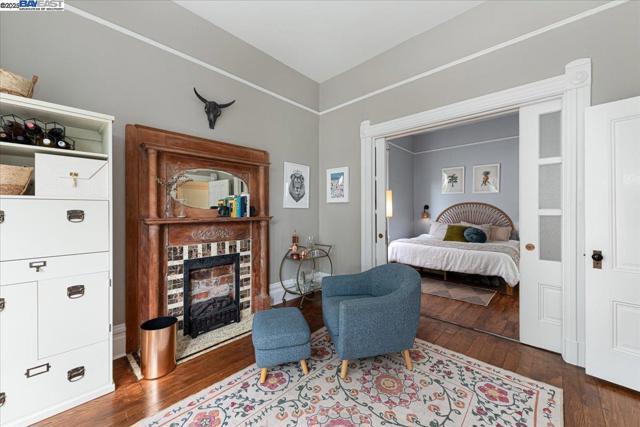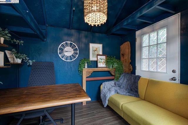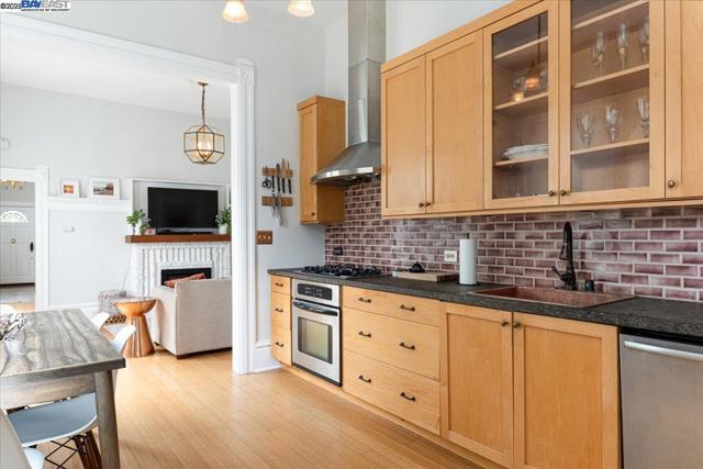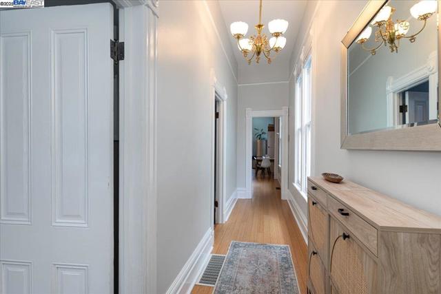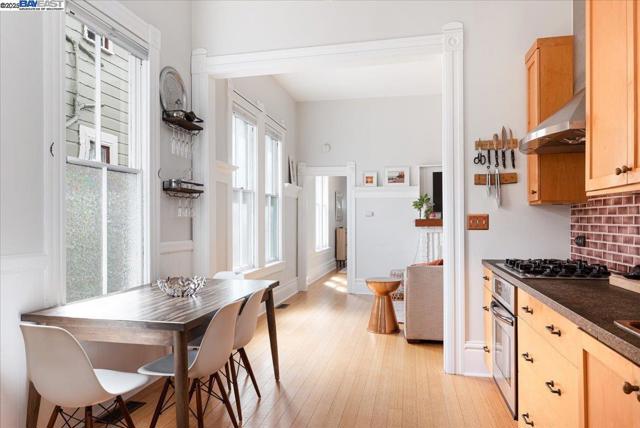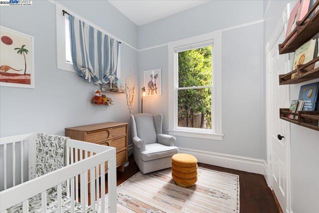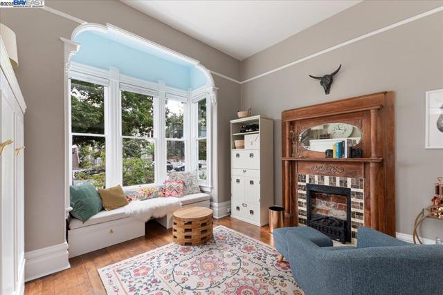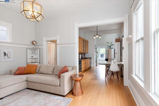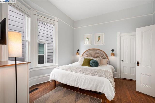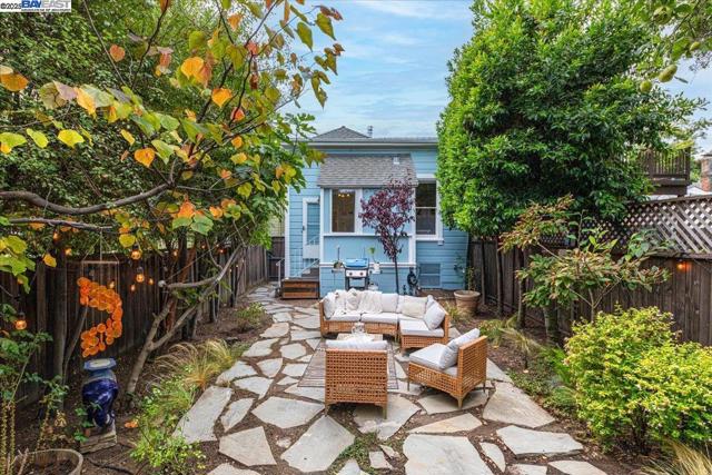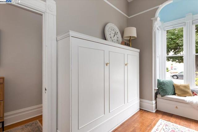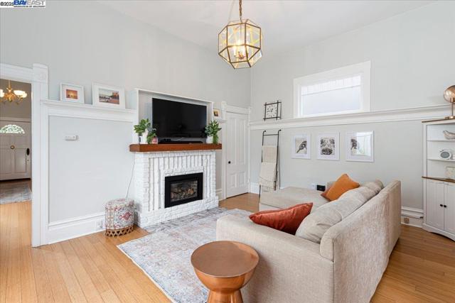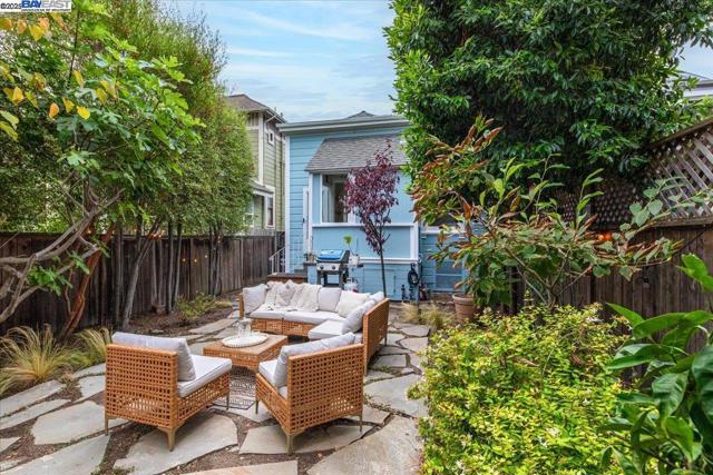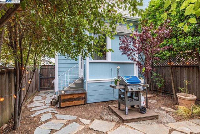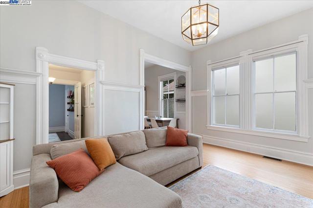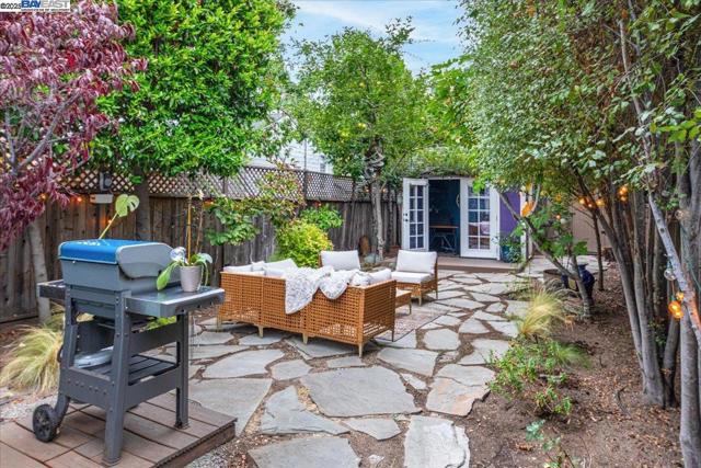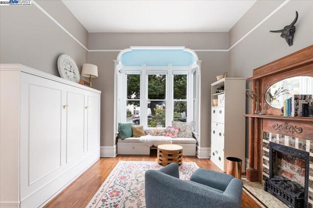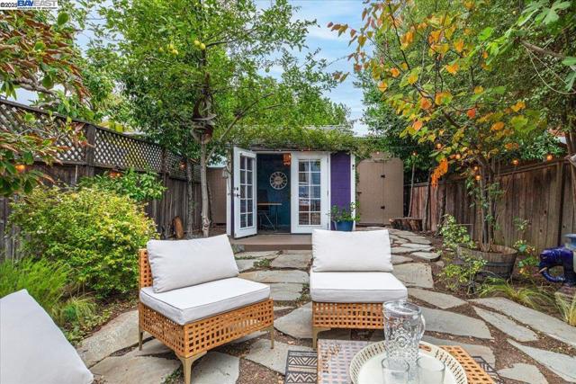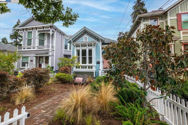 Historic beauty, modern soul. One of Alameda's earliest Eastlake Victorians, this single level jewel shimmers with timeless grace. From the moment you cross the threshold, you're greeted by soaring ceilings, period light fixtures, and intricate mouldings from another era. Yet behind the beauty, this home embraces modern living with a remodeled, galley style kitchen with open dining and living space. Flexible spaces allow you to live as two or three bedrooms via a custom Murphy bed tucked neatly away. The garden feels like a private retreat with a shady patio and a bonus studio/office that feels like a secret hideaway. This home balances history and heart. Just blocks from Park Street shops and cafes, this is where you will not just live but belong -the romance of yesterday, ready for today