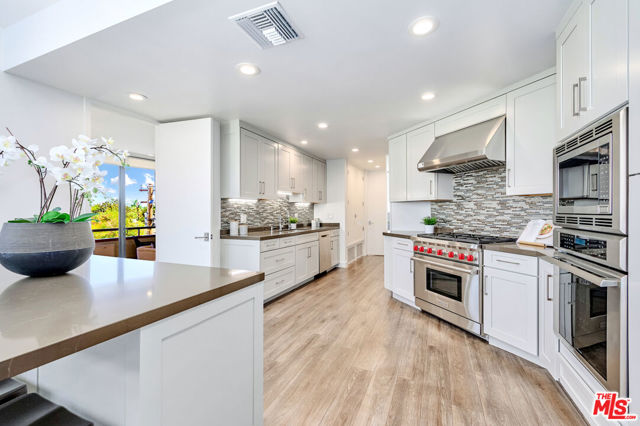 Welcome to 268 S. Lasky Drive, Unit 303 a stunningly remodeled top-floor corner residence offering penthouse-style views in the heart of Beverly Hills. Nestled on a tree-lined street near the iconic Beverly Hills Golden Triangle and located within the highly sought-after Beverly Hills School District, this rare 2-bedroom, 3-bath condominium boasts over 2,100 square feet of refined living. The airy, bright living area is illuminated by floor-to-ceiling sliding glass doors and features a stylish fireplace, a formal dining space, and a chic entertainment zone complete with a wine fridge perfect for both intimate evenings and larger gatherings. The gourmet kitchen has been thoughtfully remodeled with custom cabinetry, a Sub-Zero refrigerator, Wolf range, extensive quartz countertops, and a generous eat-in island ideal for culinary creativity and casual dining.The expansive primary suite offers tranquil tree-top views, a large walk-in closet, and a spa-quality ensuite bathroom featuring double sinks, abundant counter space, a separate designer soaking tub, stand-alone shower, and a private water closet for added comfort. The second bedroom is a private suite of its own, featuring a full ensuite bathroom and a spacious closet ideal for guests or family members seeking privacy and convenience. A stylish powder room is located just off the main living area, and an in-unit laundry room adds ease to your everyday routine. Additional features include extra storage, generous closets throughout, two side-by-side parking spaces, and plentiful guest parking. This exceptional corner unit is located in a secure, well-maintained, and recently upgraded building that offers 24/7 controlled access, an advanced security system, and professional lobby staff on-site during weekday business hours. Live moments from world-renowned shopping on Rodeo Drive, fine dining, high-end entertainment, Century City Mall, Rancho Park Golf Course, and The Los Angeles Country Club. This penthouse-level move-in-ready gem feels every bit like a private home, while providing all the ease and security of luxury condominium living.