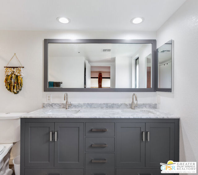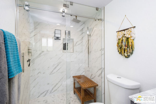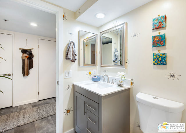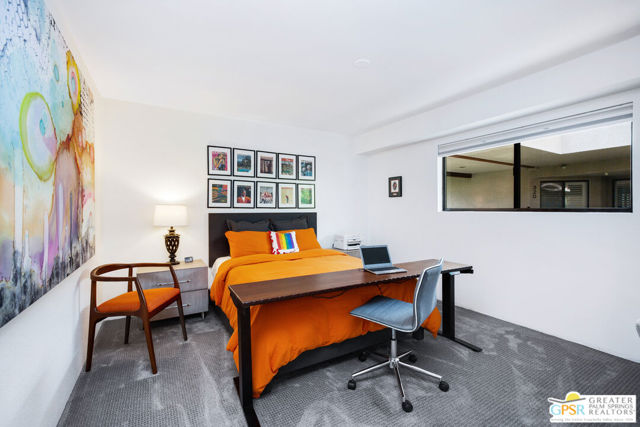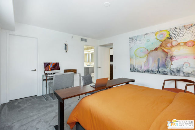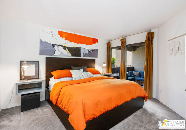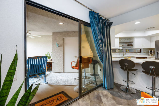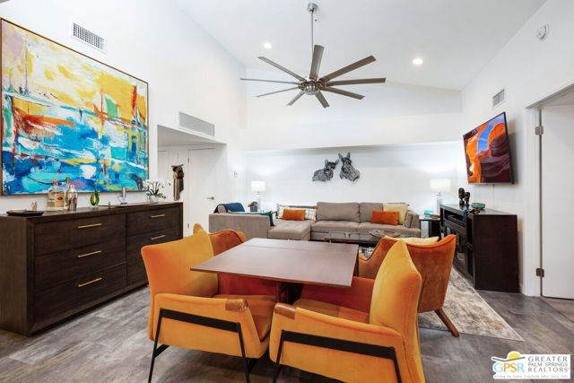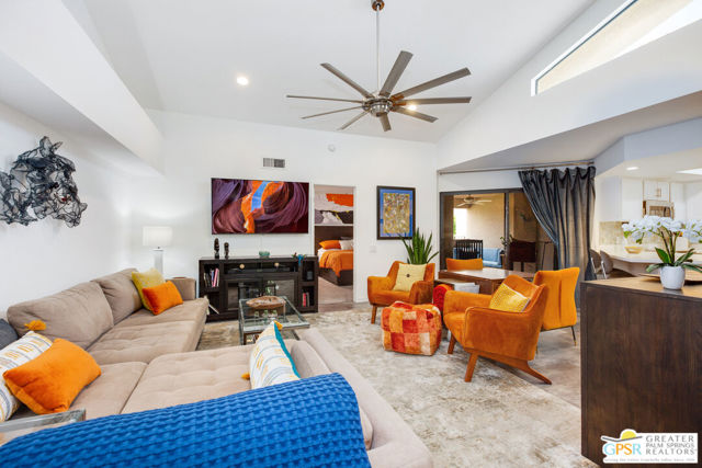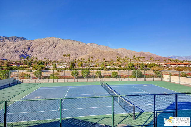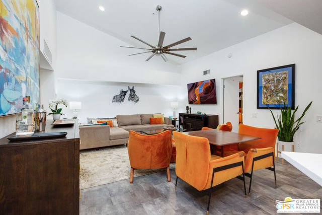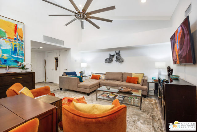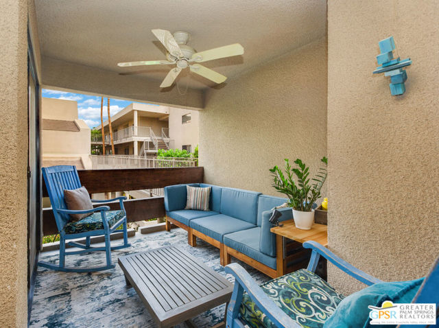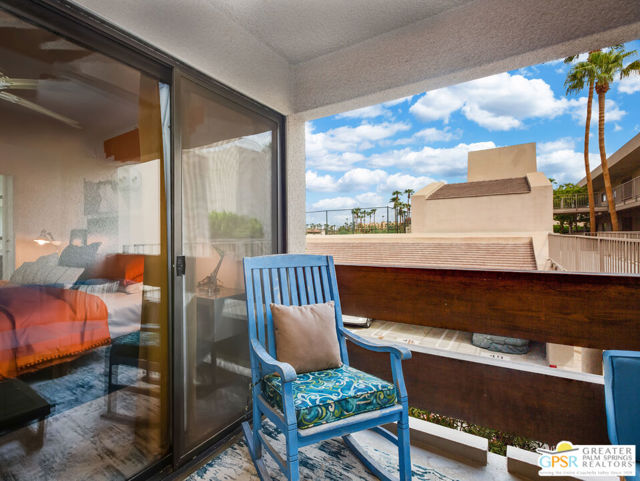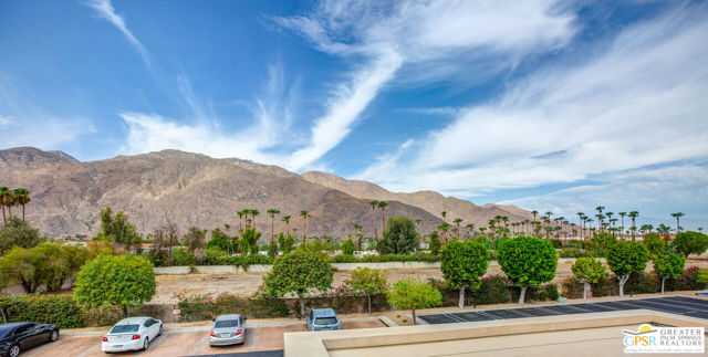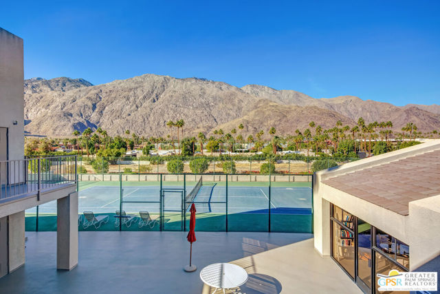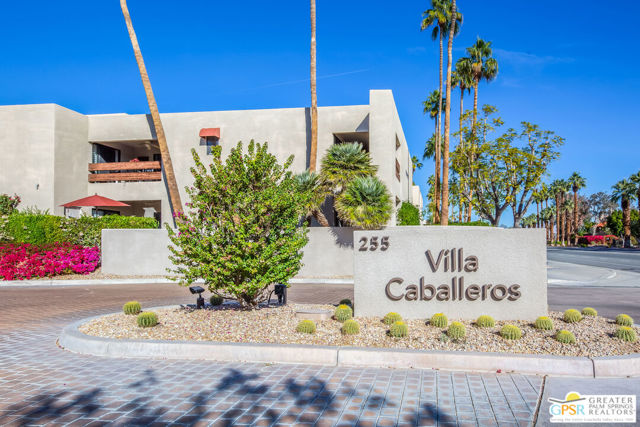 Motivated seller willing to negotiate/pay HOA/Land Lease fees for up to a year with acceptable offer. Beautifully renovated top floor (elevator building) end-unit 2BR/2BA in architecturally significant Villa Caballeros designed by Hugh M. Kaptur. Dramatic high vaulted ceiling in great room with clearstory window, handsome flooring and access to oversized balcony with mountain views. Sleek kitchen with quartz countertops, stylish backsplash and newer stainless steel appliances. Both bathrooms updated in great taste. Resort style living with community pool and spa, tennis/pickleball and racquet ball courts. Full size washer/dryer and covered gated parking. Villa Caballeros is beautifully landscaped and in close proximity to all downtown Palm Springs has to offer. HOA fee currently $577 (includes Earthquake Insurance, Water/Sewer, Trash/Recycling and Common area maintenance). Land lease extended to 2080 currently @ $305/month paid quarterly. Possible Owner financing. An outstanding opportunity priced to sell.