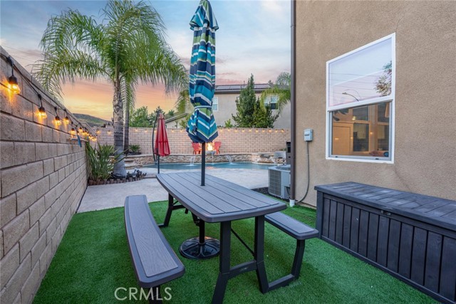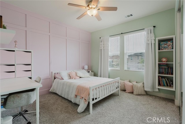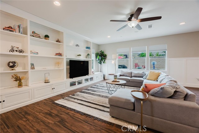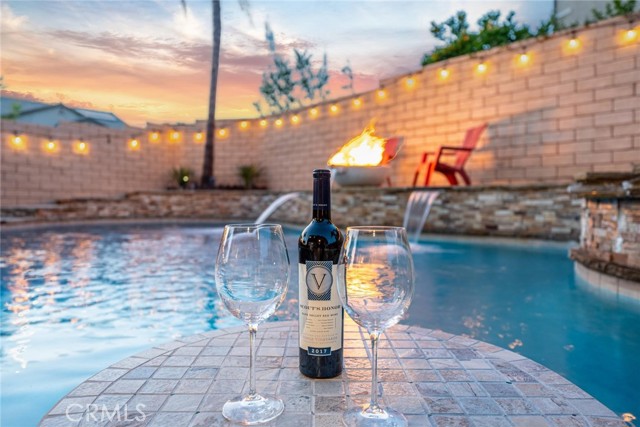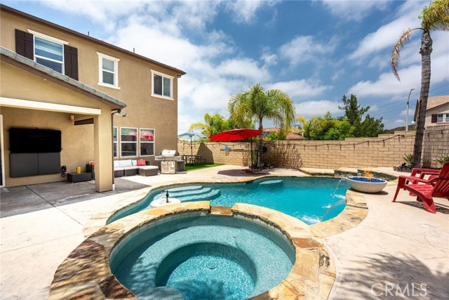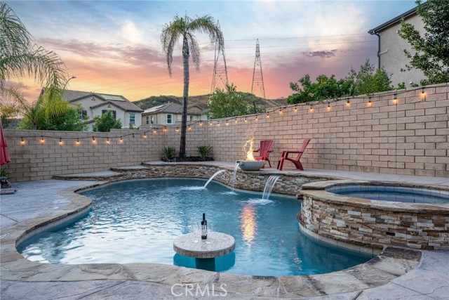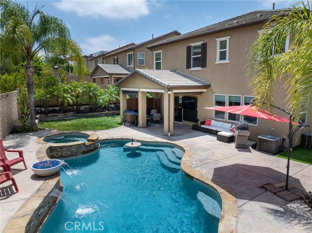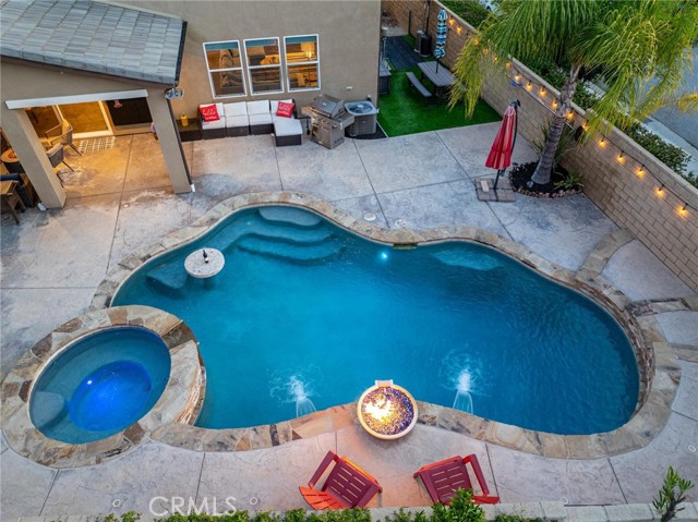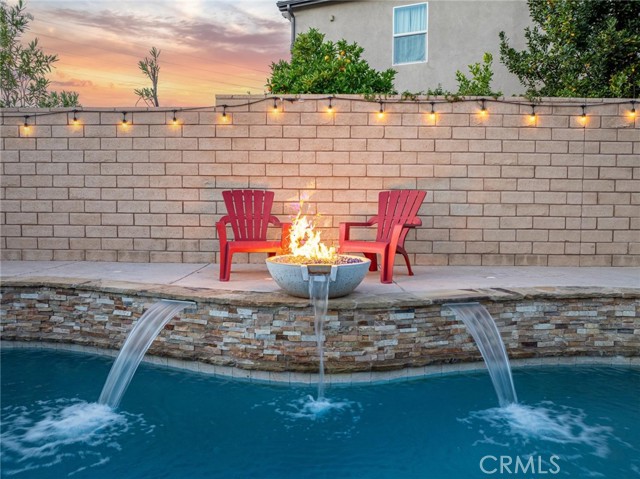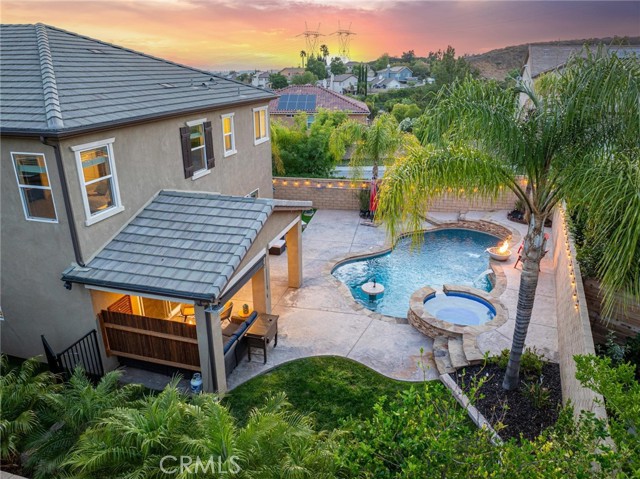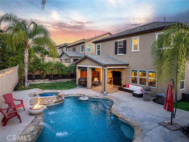 This beautifully updated 5-bedroom, 4-bathroom home offers 3,271 sq. ft. of spacious living, including an upstairs loft (possible 6th bedroom) + office area, and a full bedroom and bath on the main level. Ideal location on a CORNER LOT with added privacy and excellent parking for guests. Recent upgrades include custom wood paneling throughout the living areas and bedrooms, freshly painted cabinets with new hardware, updated light fixtures, custom closet organizers in every bedroom, luxury vinyl flooring in the bathrooms and newer carpeting upstairs. As you enter the front door you are immediately drawn to the bright, open floor plan. The formal dining room opens up to a spacious family room with custom built ins, surround sound and recessed lighting. The living area seamlessly flows into the kitchen featuring a large center island, updated pendant lighting, stainless steel appliances, and a custom built-in everyday dining area. Upstairs you will find 5 bedrooms plus the office area, complete with custom cabinets and wood planked walls. The generous primary suite boasts an electric fireplace, modern wood accents and a walk-in closet with custom organizers and lighting. The primary bathroom has luxury vinyl bathroom flooring, a large soaking tub and separate shower and additional linen storage. The secondary rooms are all a very good size, and the 5th bedroom has its own en-suite bathroom. Enjoy these upcoming summer months in your private backyard oasis featuring a sparkling pool and spa with tranquil spillover features. The outdoor California room is ideal for entertaining, complete with a ceiling fan, sunshades and TV mount for year-round enjoyment. You also have a nice grassy area and a large side yard on each side of the home. Downstairs laundry room with additional storage and pantry area. 2 car garage with overhead storage. Enjoy energy savings with fully OWNED SOLAR panels and tankless water heater. Terrific location just down the street from the community pool area, easy access to highly rated schools shopping and dining. NO MELLO ROOS!