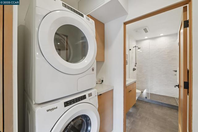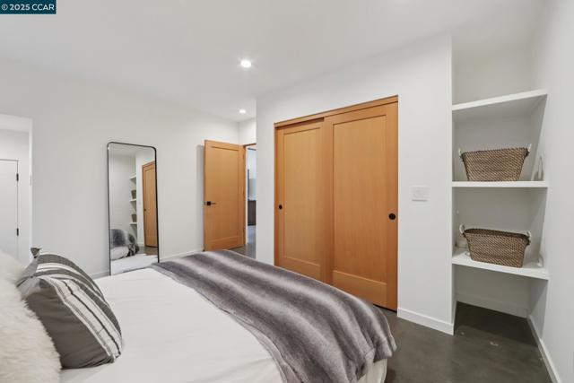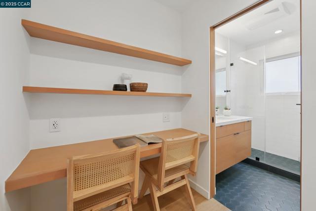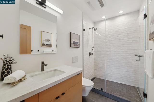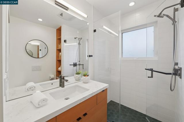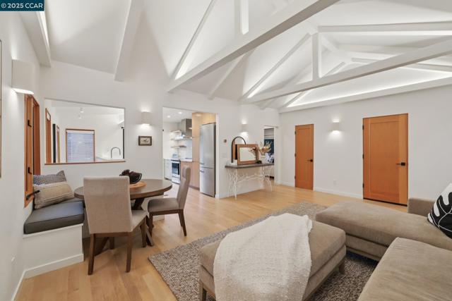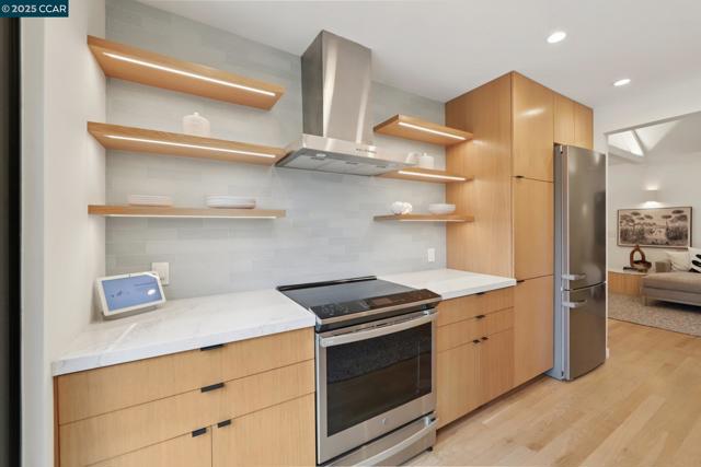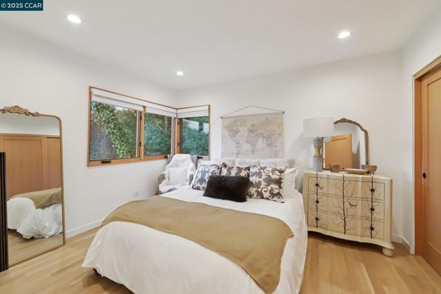 Discover eco-modern living in this 3BR/2BA Berkeley Hills home, where smart technology meets comfort. A Google Nest system, six-zone radiant heating/cooling, and passive ventilation ensure an ideal climate. Vaulted ceilings and soft LED lighting create a bright, welcoming atmosphere, while the chef’s kitchen features custom cabinetry, high-end appliances, and open shelving. The main level includes a bedroom with peaceful views, a home office with built-in desk, and a spa-inspired bathroom. An attached garage with EV charger is finished as additional living space. The lower level offers a family room perfect for entertaining, opening to a ~400 SF patio and multi-tier, low-maintenance yard, along with two bedrooms, a full bath, laundry, and storage. Ideally located near UC Berkeley, Kensington shops, Solano Avenue, Tilden Park, and AC Transit.